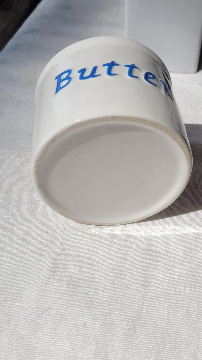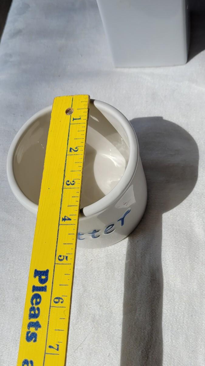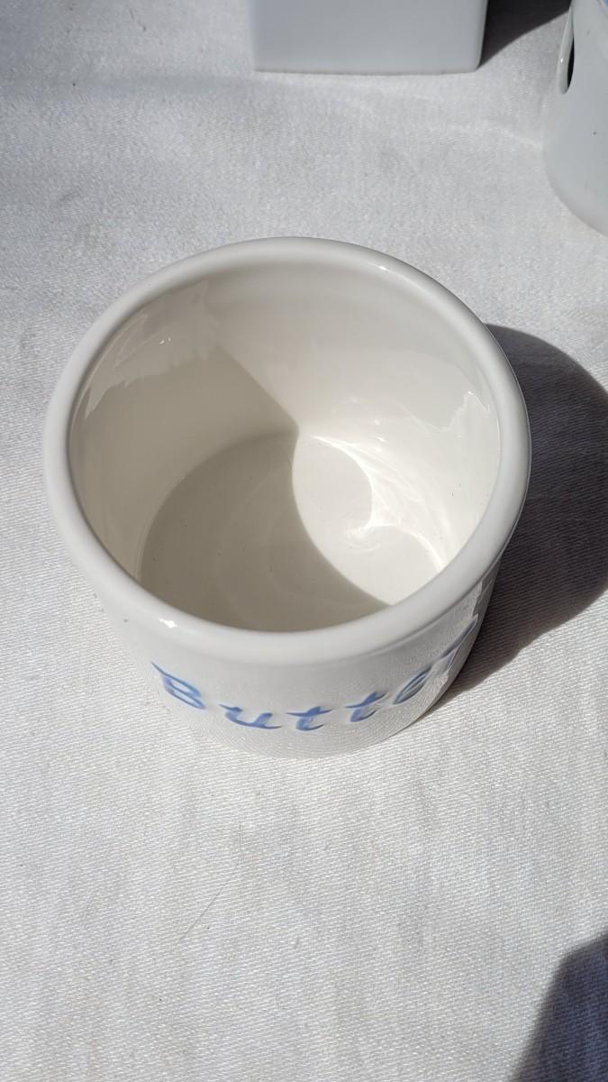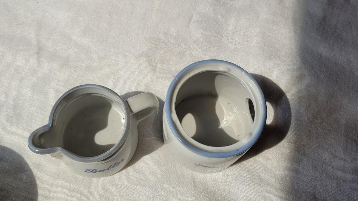 Lot 41: Vintage White & Blue Butter Cups and White Ceramic Milk Carton