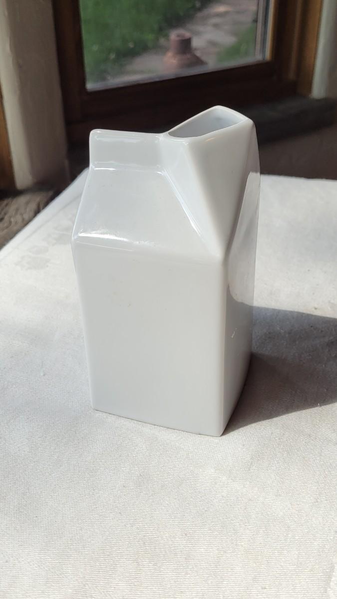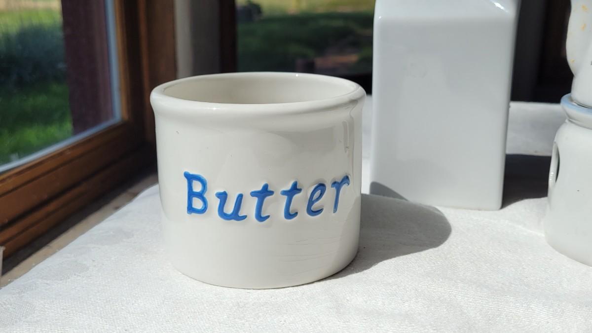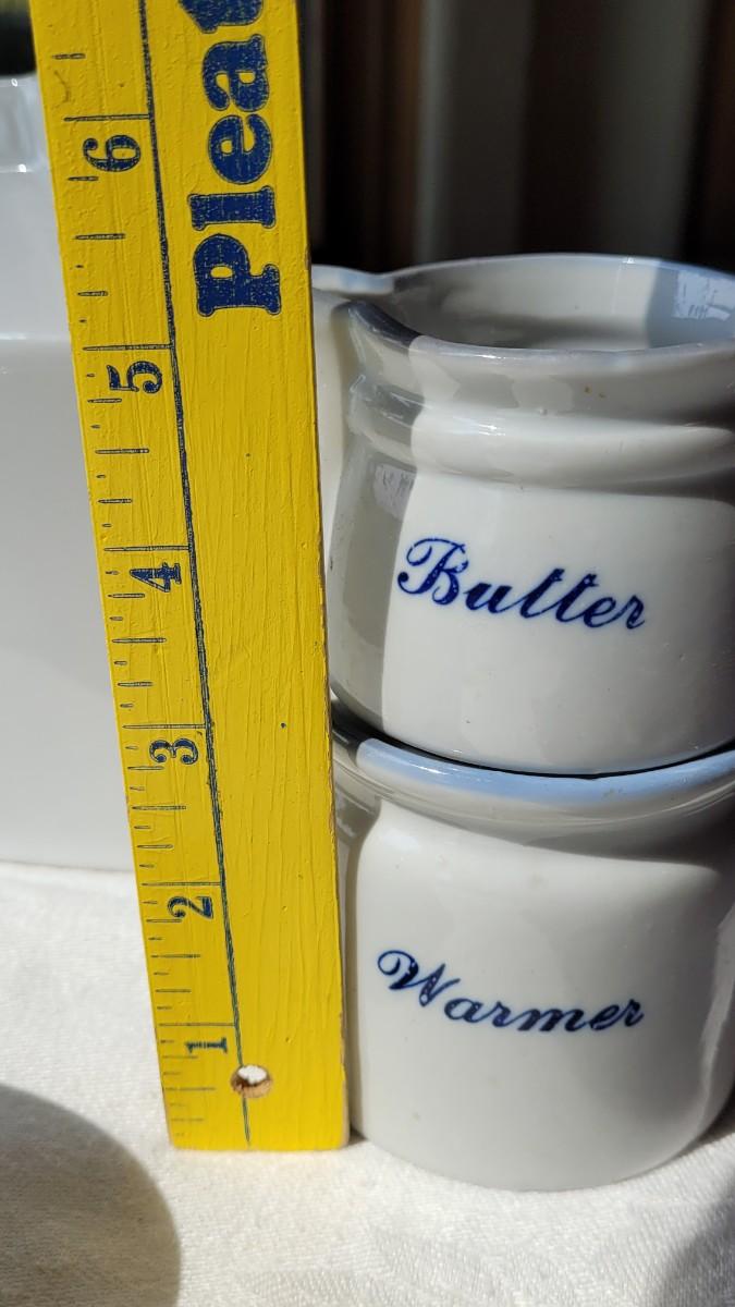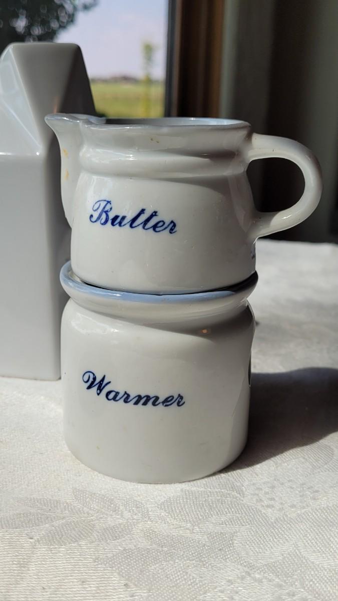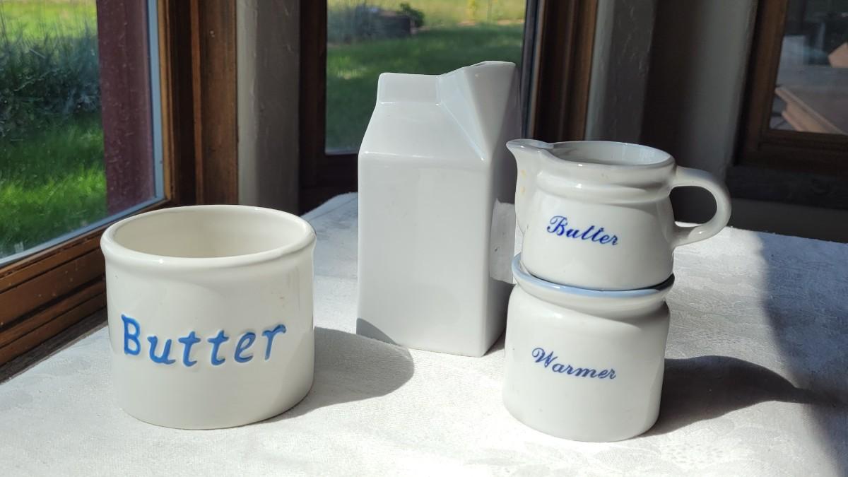 Lot 41: Vintage White & Blue Butter Cups and White Ceramic Milk Carton