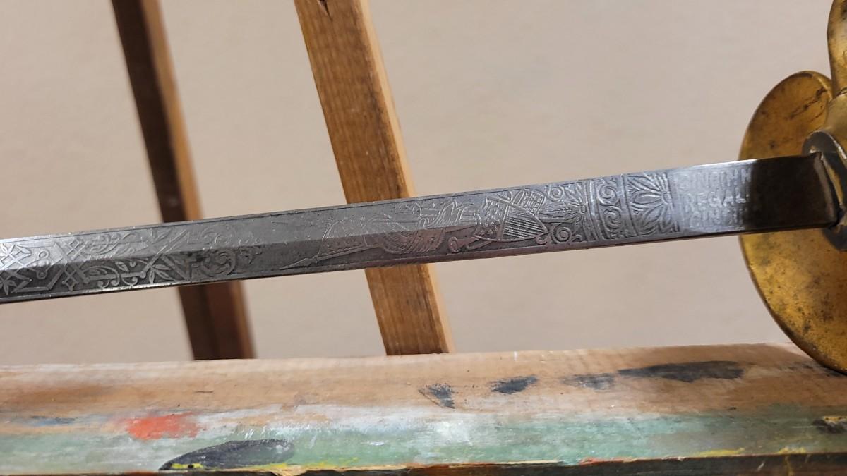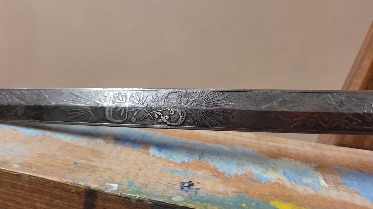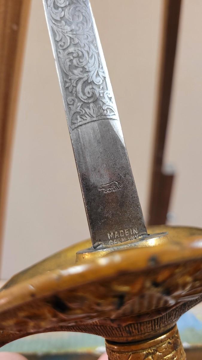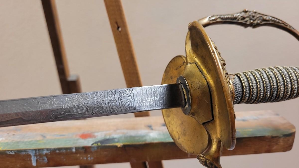 The makers mark "Cincinnati Regalia Co. - Cincinnati O." is etched on one side of the ricasso. The Cincinnati Regalia Company distributed a very limited number of swords. They were not a manufacturing company, but simply a distributor for swords made by smaller manufacturers such as The Pettibone Brothers Manufacturing Co. You will find very few swords bearing the Cincinnati Regalia Company name because of their limited distribution, tfore the swords are considered rare.