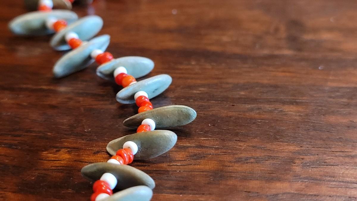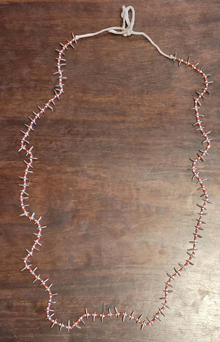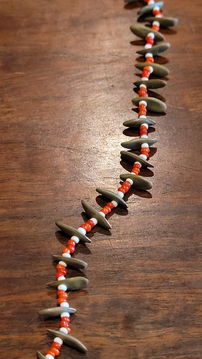 This unique 34" long Native American necklace is strung on buttery soft leather. Tiny red and white glass Seed beads accentuate the Real strung seeds. They appear to be Sunflower seeds but much less brittle. Rare and a bit Delicate.