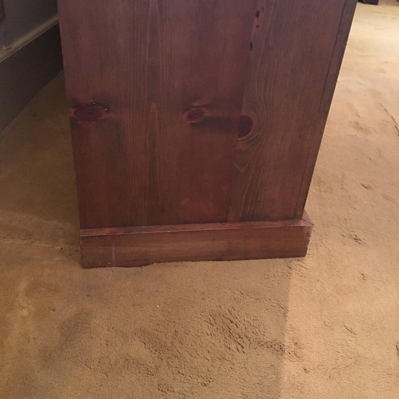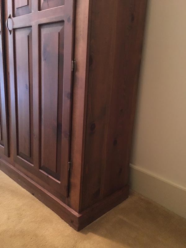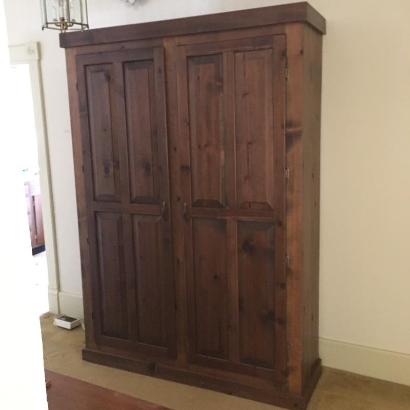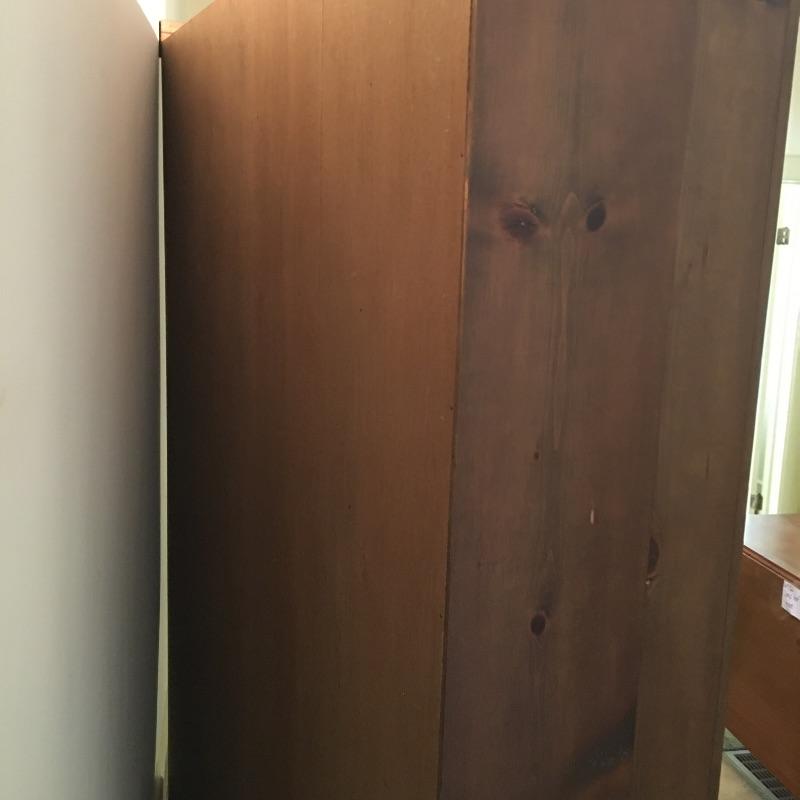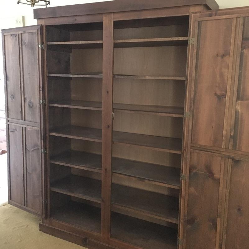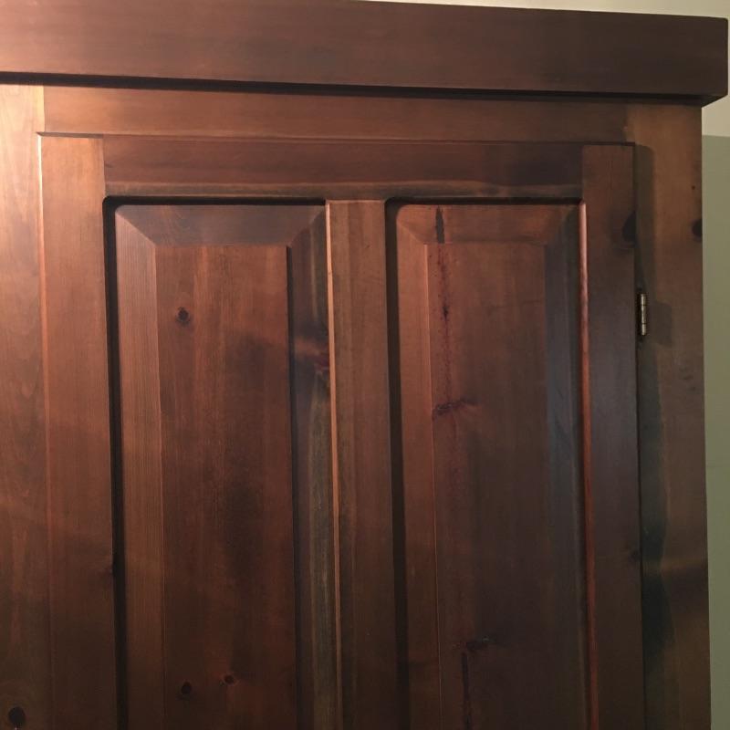 This beauty is sure to take everything you throw in it and still look good! Solid wood armoire has seven shelves that are full length and non adjustable and two doors with magnetic catches. Armoire measures 59” x 18” x 83.5”. Bring help item is substantial. Armoire is in excellent with just a few scratches on the bottom, see pictures.