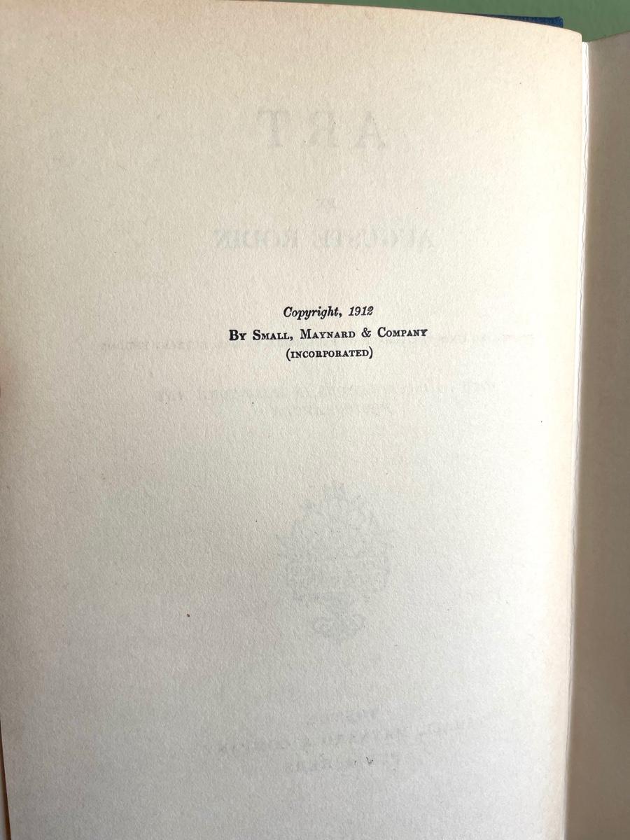 LOT 41 - ART - Auguste Rodin, copyright 1912, a First Edition. It includes 106 Illustrations in Half-Tone and Photogravure; Small, Maynard & Company, Publishers. Boston. (1912.) This book is hard-bound in gilt stamped blue cloth. This book was part of the David-Pleydell-Bouverie library at Bouverie Ranch in Glen Ellen. This item can be viewed at our Green + Cate Showroom in Sebastopol from July 15th - July 18th between the hours of 9am-5pm. For the benefit of the Bouverie Preserve of Audubon Canyon Ranch.