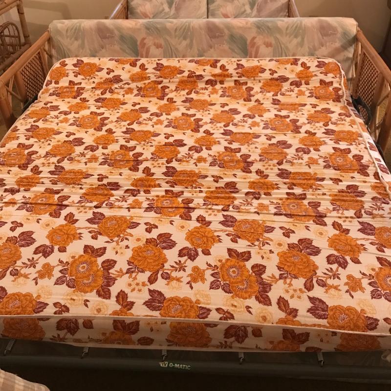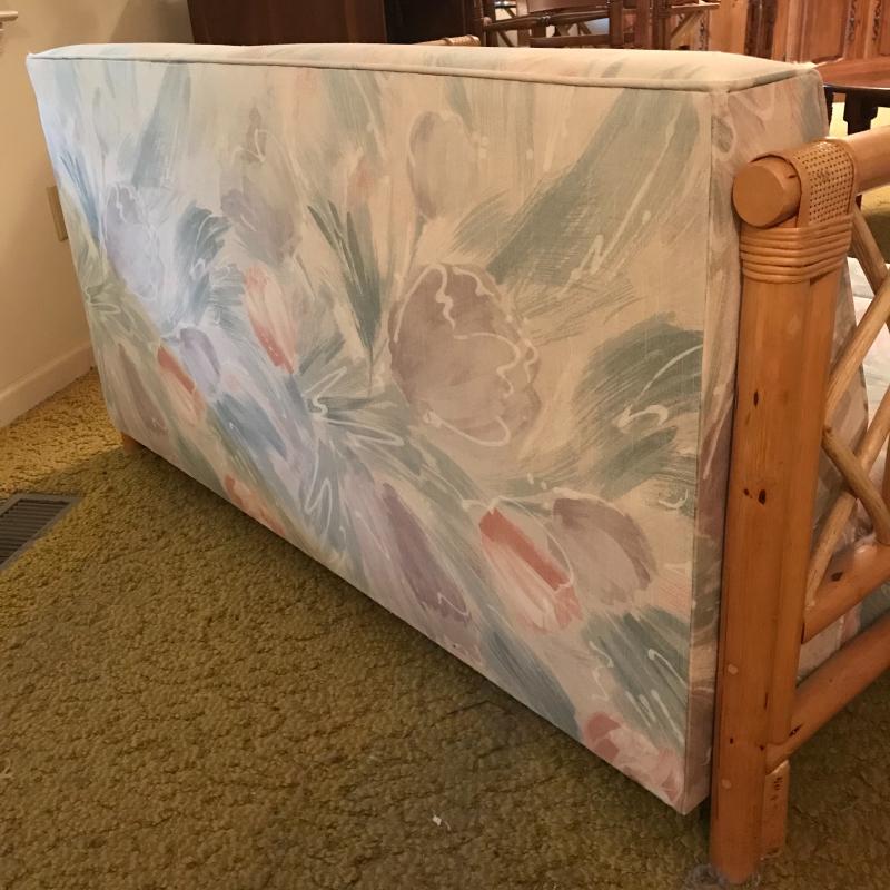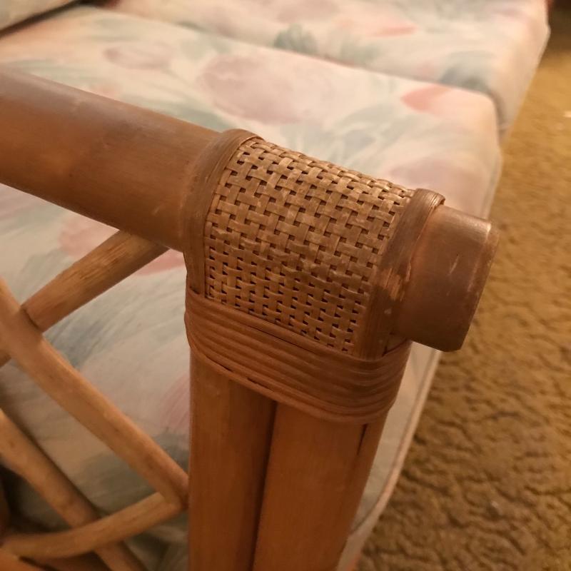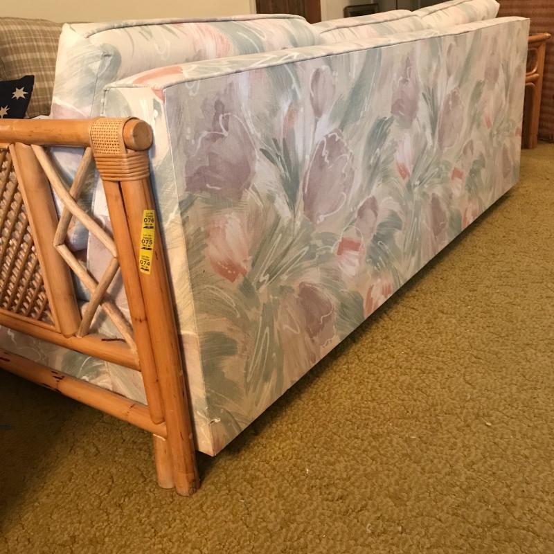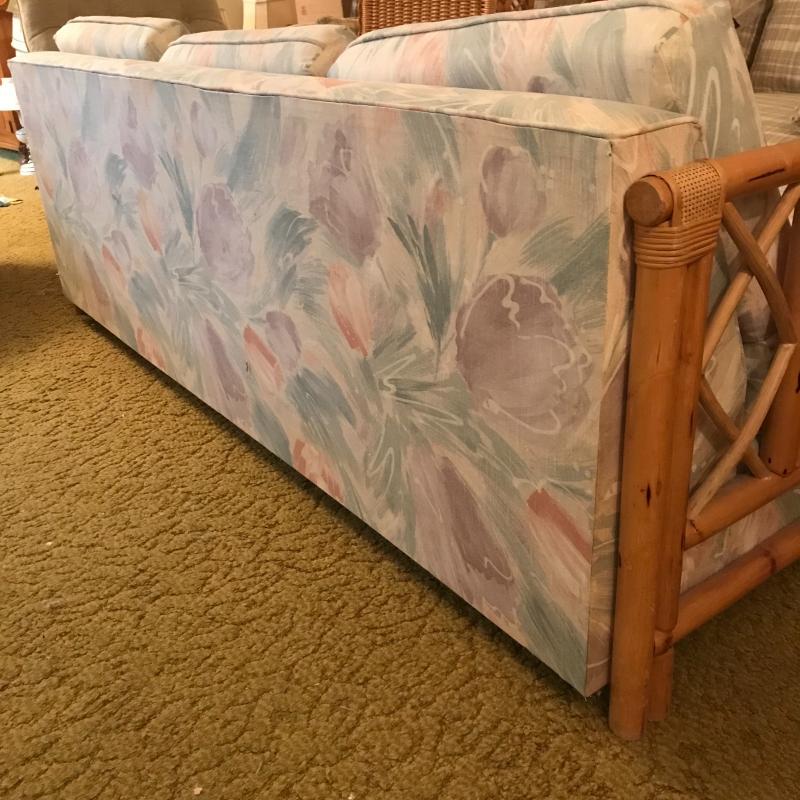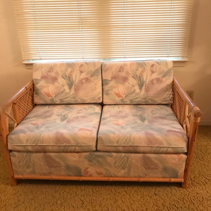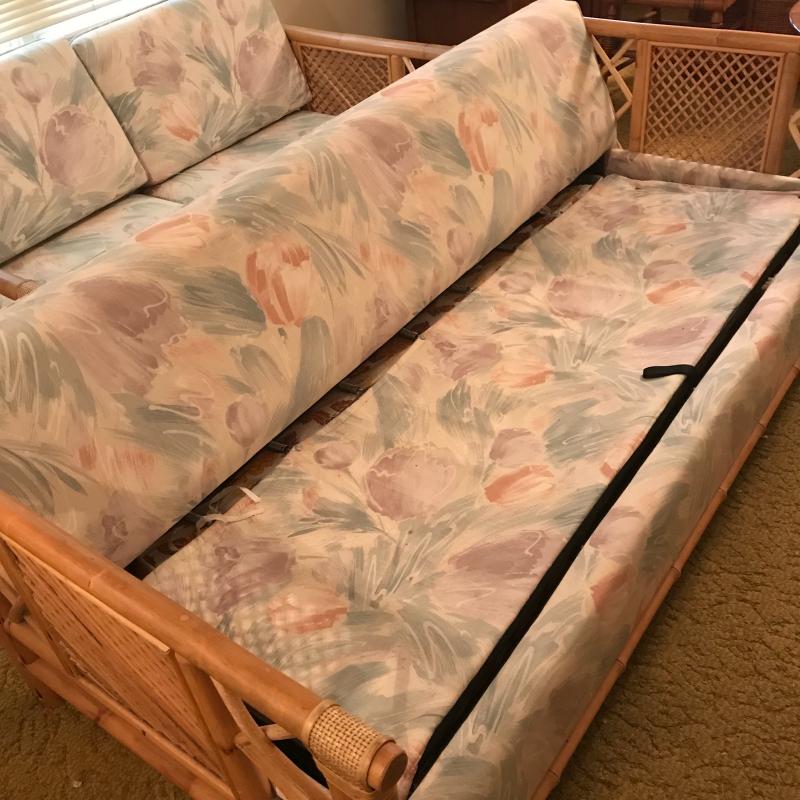 Bamboo sides and fabric seating in this great pair. Larger sofa is. Sleeper sofa with mattress. Both pieces in great shape and come with 4 matching seat covers. No noticeable stains except on arm rests. Very little scratching or nicks. There is a sticker on the back bamboo area of the sleeper sofa. Sofa measures approx. 76” x 35” x 26.5” without cushions. The love seat is approx. 51.5” wide and the cushions are approx. 17.5” x 18.5”. One chair cover needs a repaired tie, but the rest seem attached well. Local pick up only, please bring help to load as both pieces are very heavy.