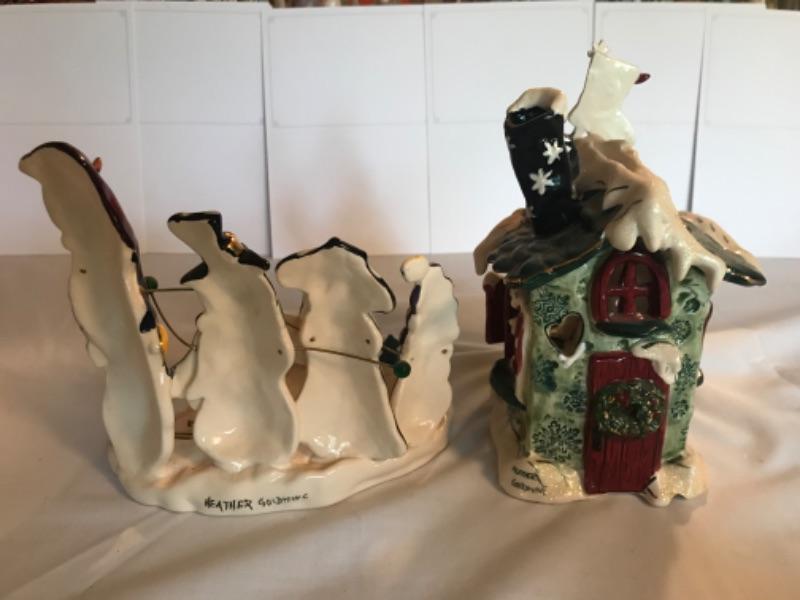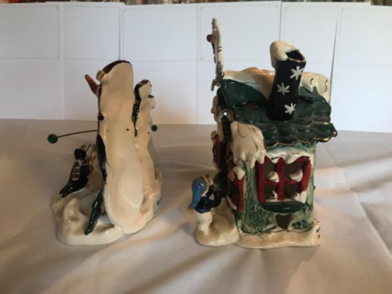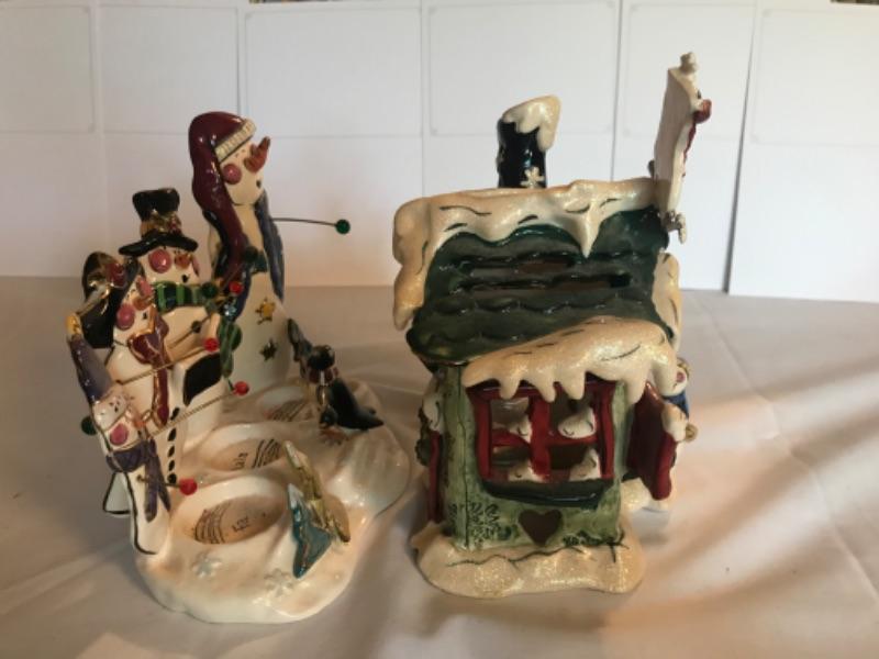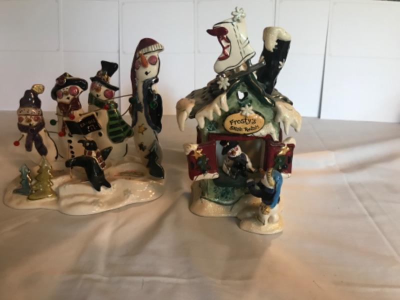 Snowmen Caroling tealight holder 6-1/2”x7-1/4”. Frosty’s Skate Rental 8” tall. Signed Heather Goldminc