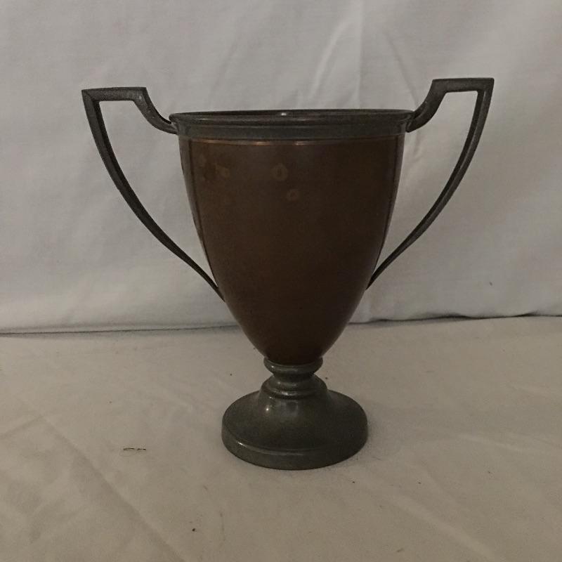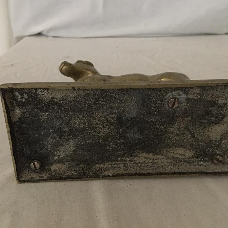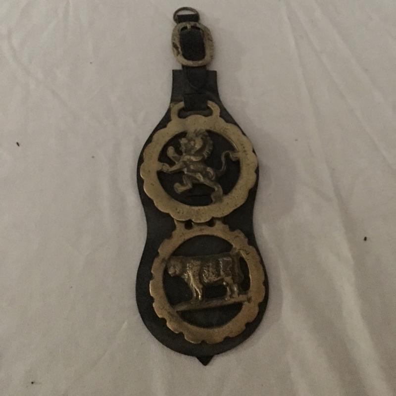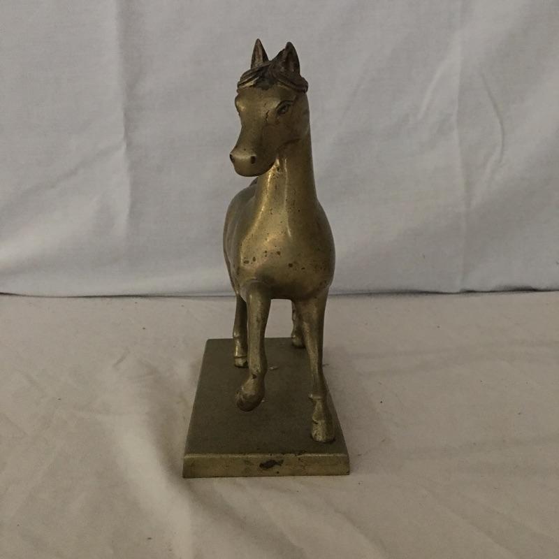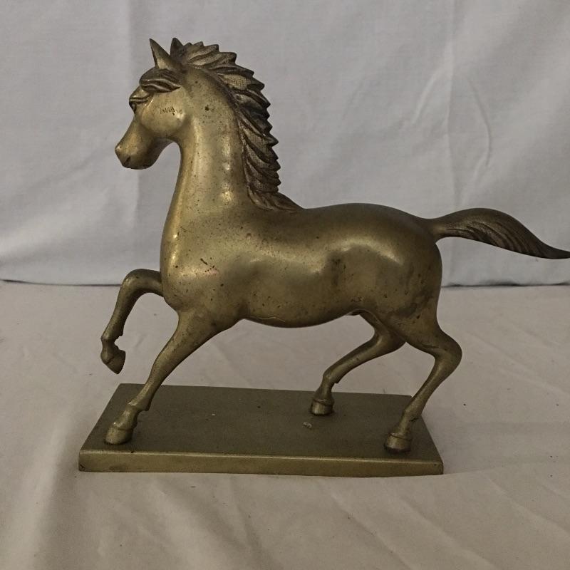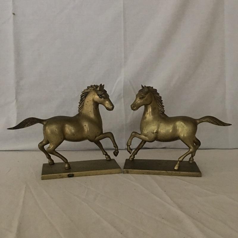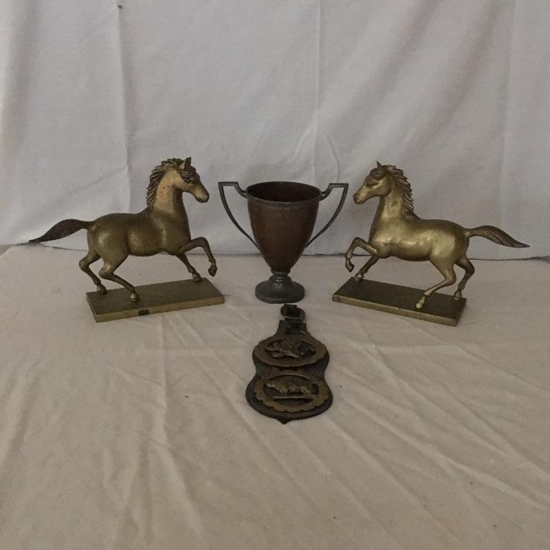 Pair of brass horse bookends with copper cup and leather and brass wall hanging. A great find for the equestrian lover. Bookends measure 9” x 3” x 7.5”.