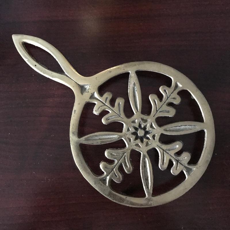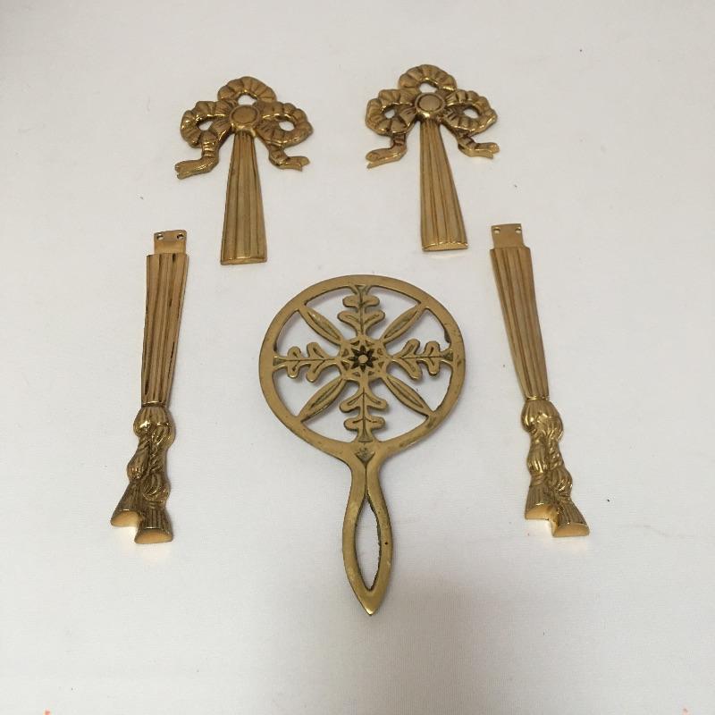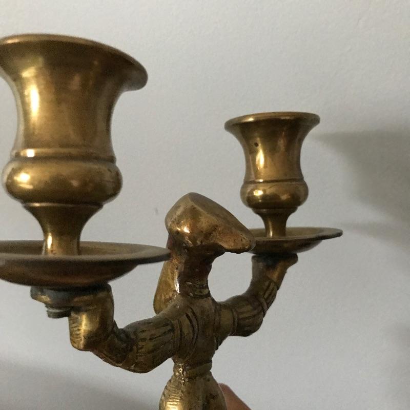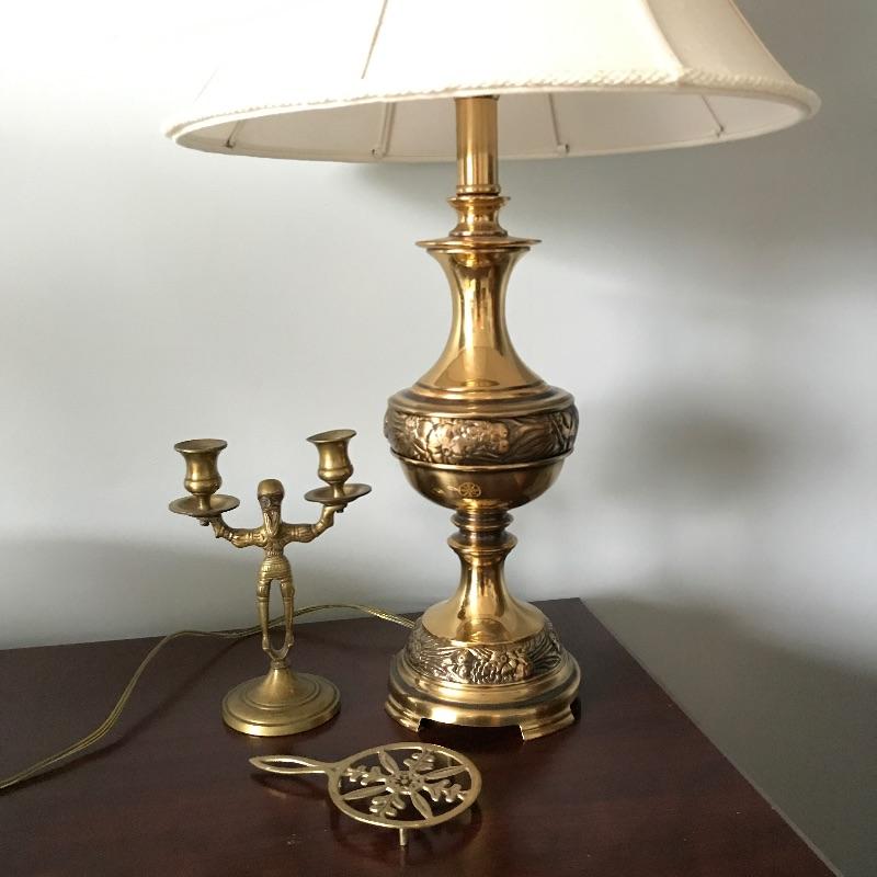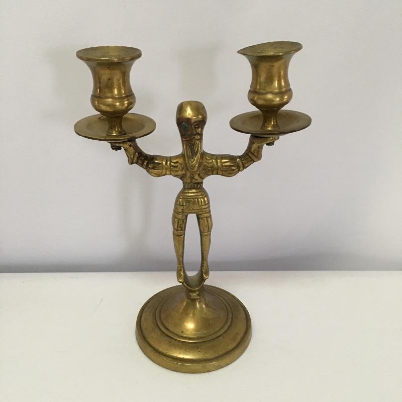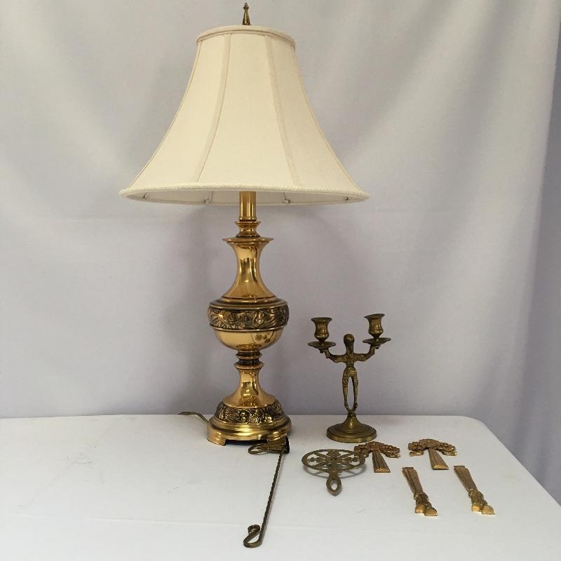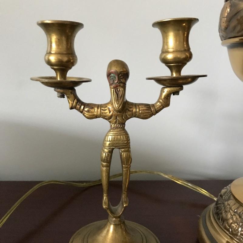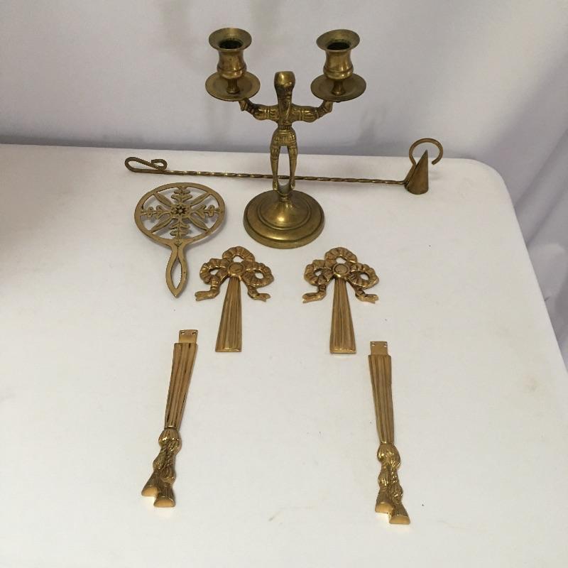 Check out this unique brass candlestick holder. (measures 9.5" tall by 7" wide) . You'll also find a Brass lamp(works fine), candle snuffer, small trivet and four piece decorative decor.