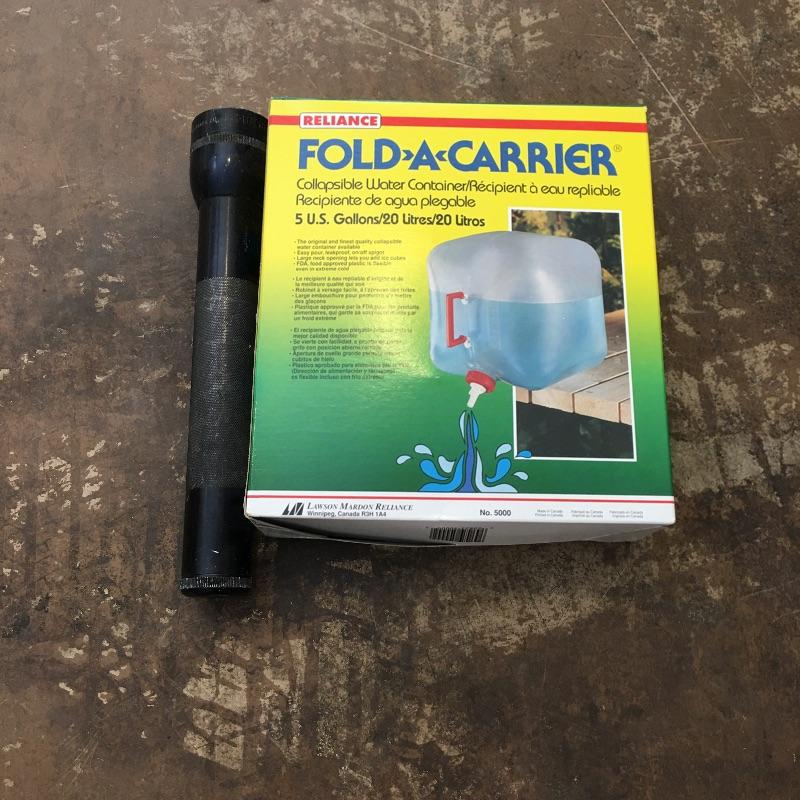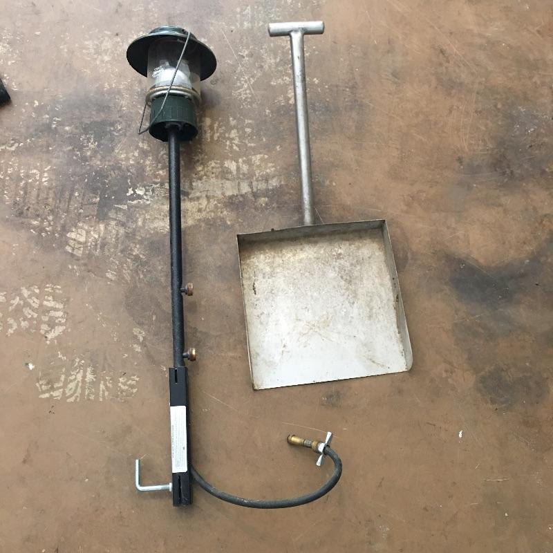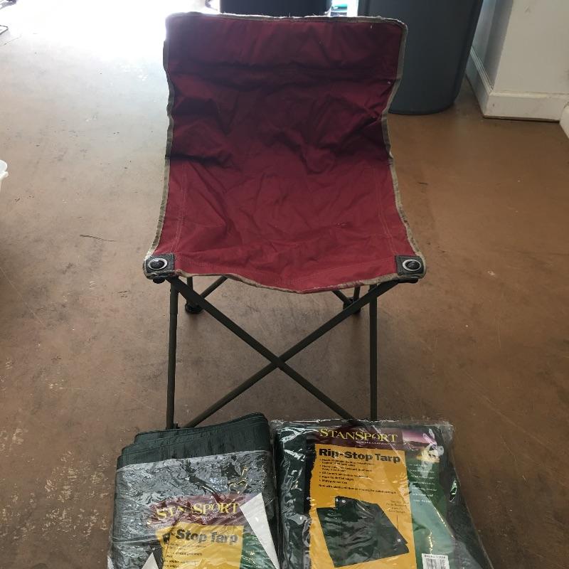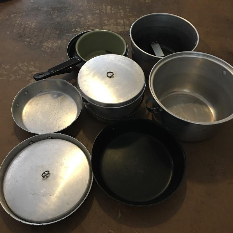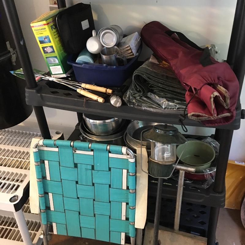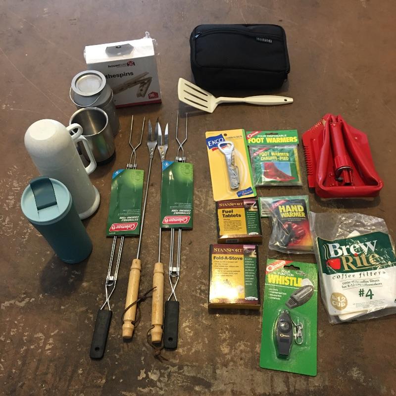 Be ready for camping this summer with this great array of gear that includes a charcoal shovel and a folding shovel, compass whistle, camp stove, pots and pans, two tarps, Coleman propane light that’s has broken glass, Mag lite, foldable water jug and more.