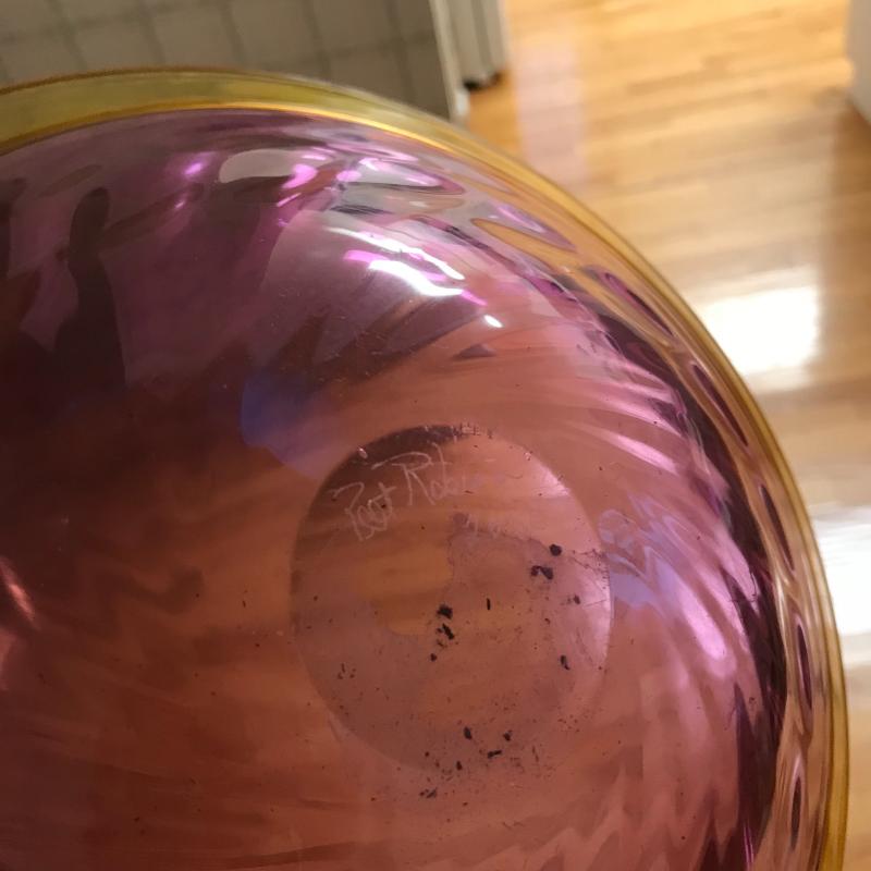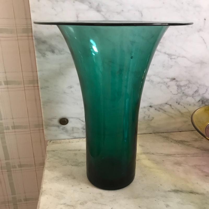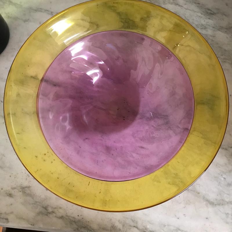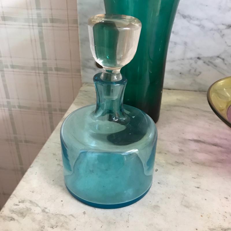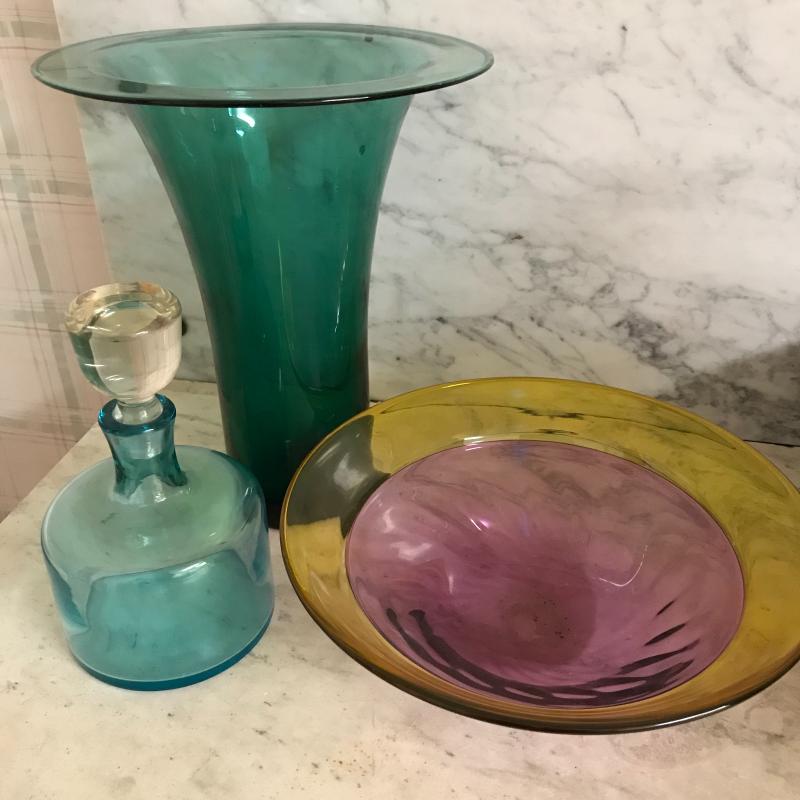 This bold and bright glassware will give color and style to any room. Vase is 11.5” tall, bowl is 11” in diameter, and decanter is 8” tall.
