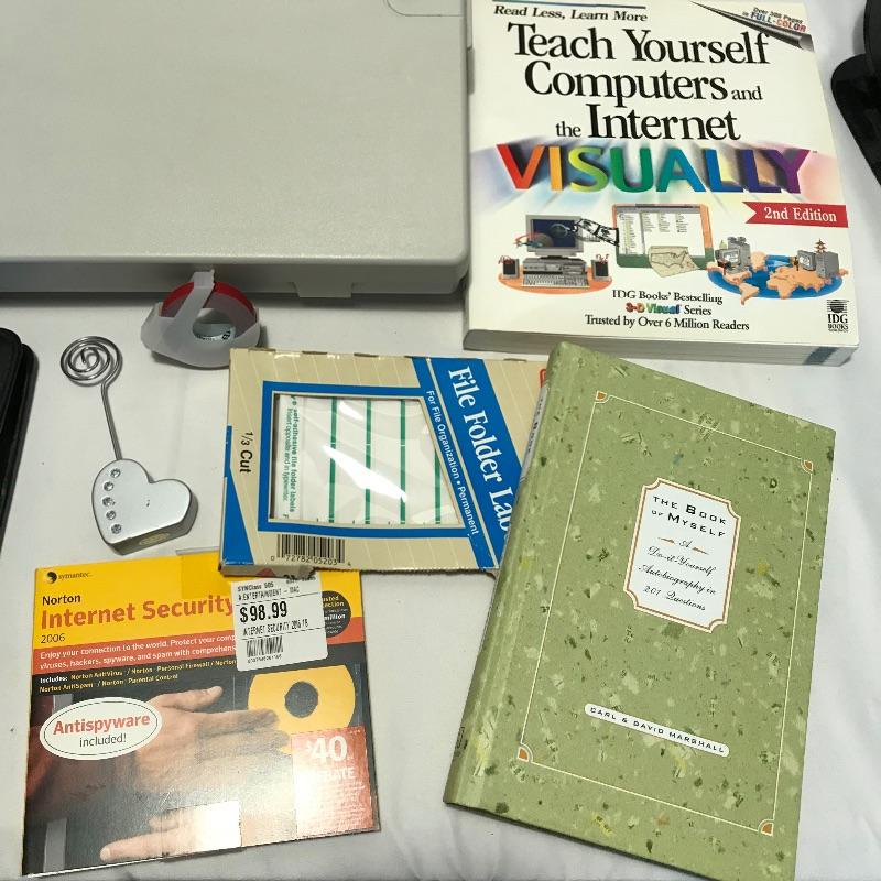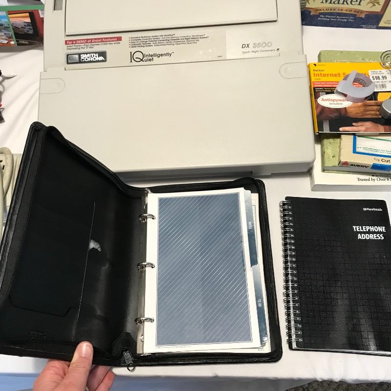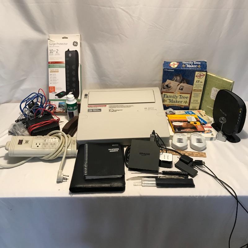 Get your media fix here! Working Smith-Corona DX 3600 typewriter, (machine worked when tested without paper). Lot also features a two drawer metal filing cabinet measuring 15” x 18” x 29”. Amazon box DV83YW with hdmi model LY73PR, a Belkin wireless router and a Westell DSL router. Two surge protectors, including a like-new Belkin with box. Lots of other supplies like phone book, dayminder cover, family tree software, letter openers and more! See images for inventory, local pick up only.