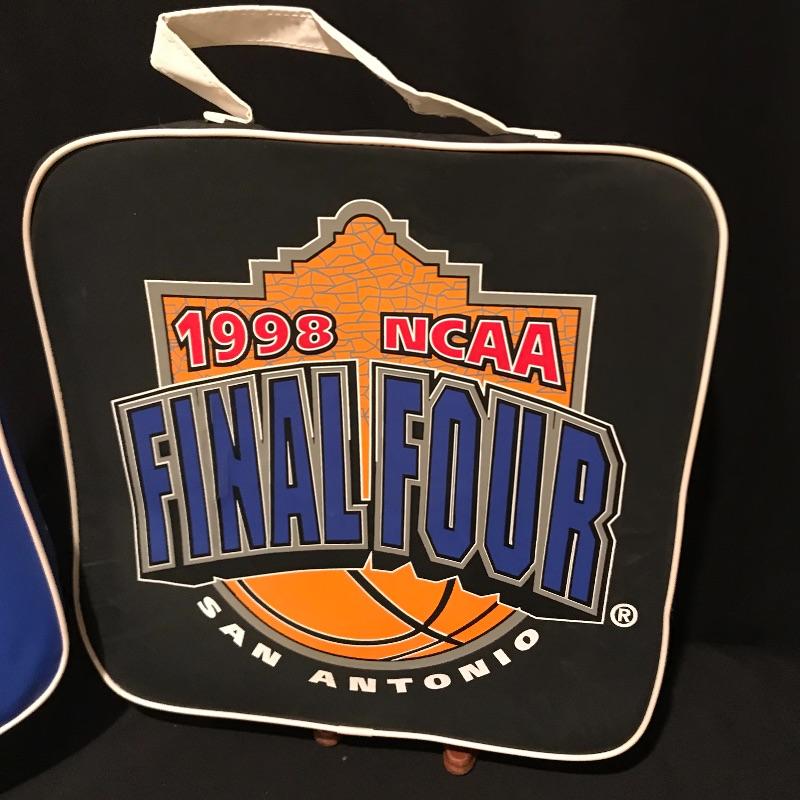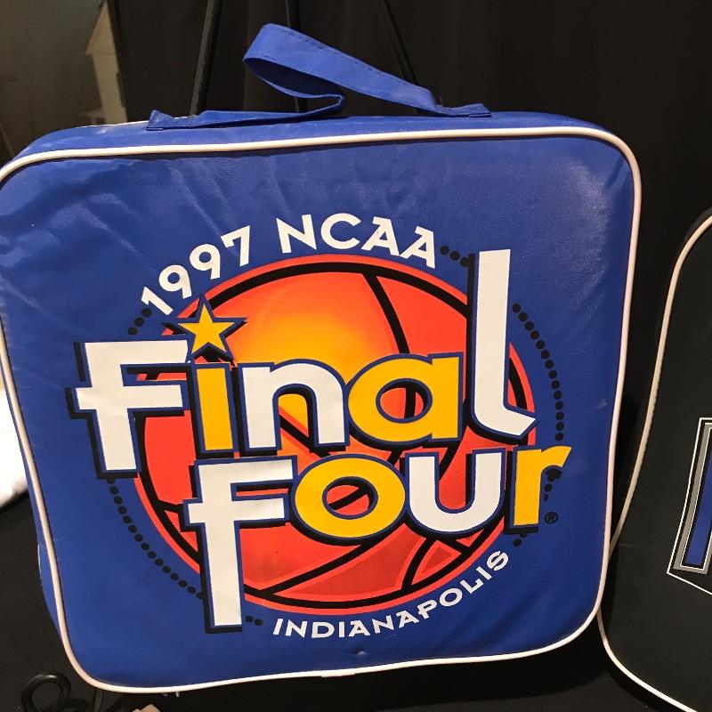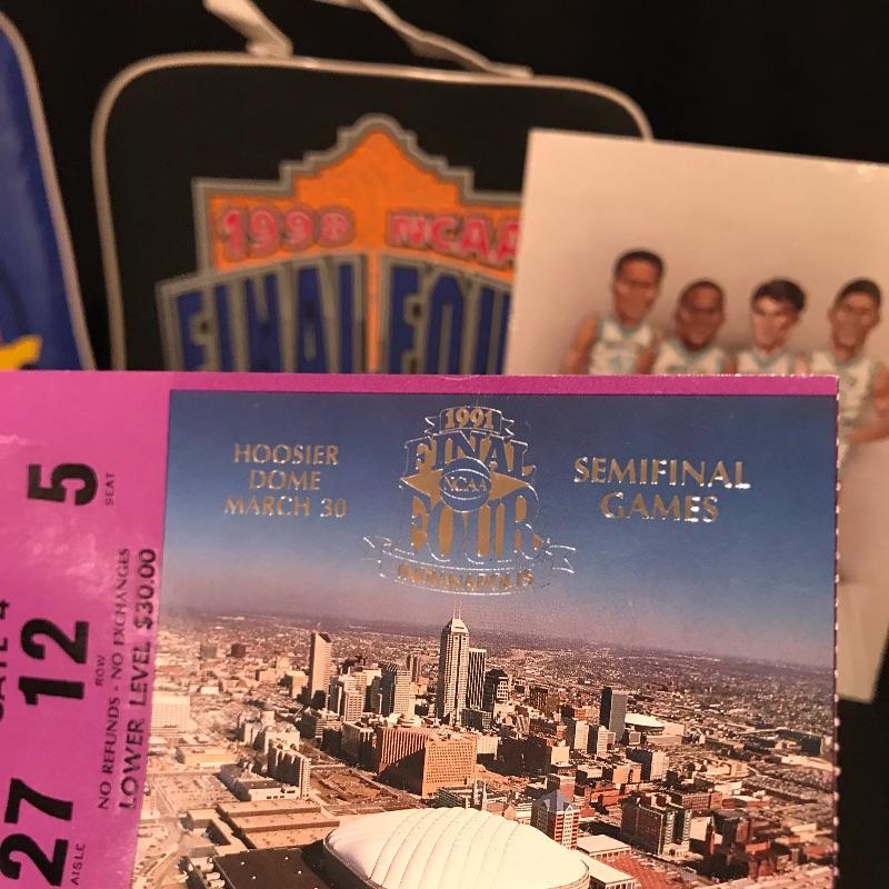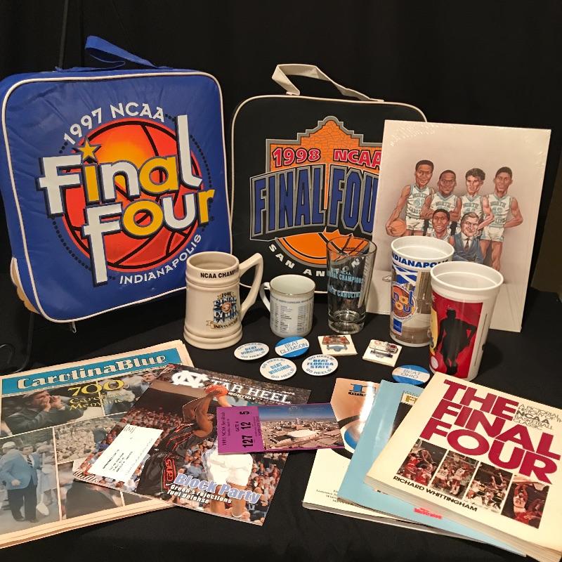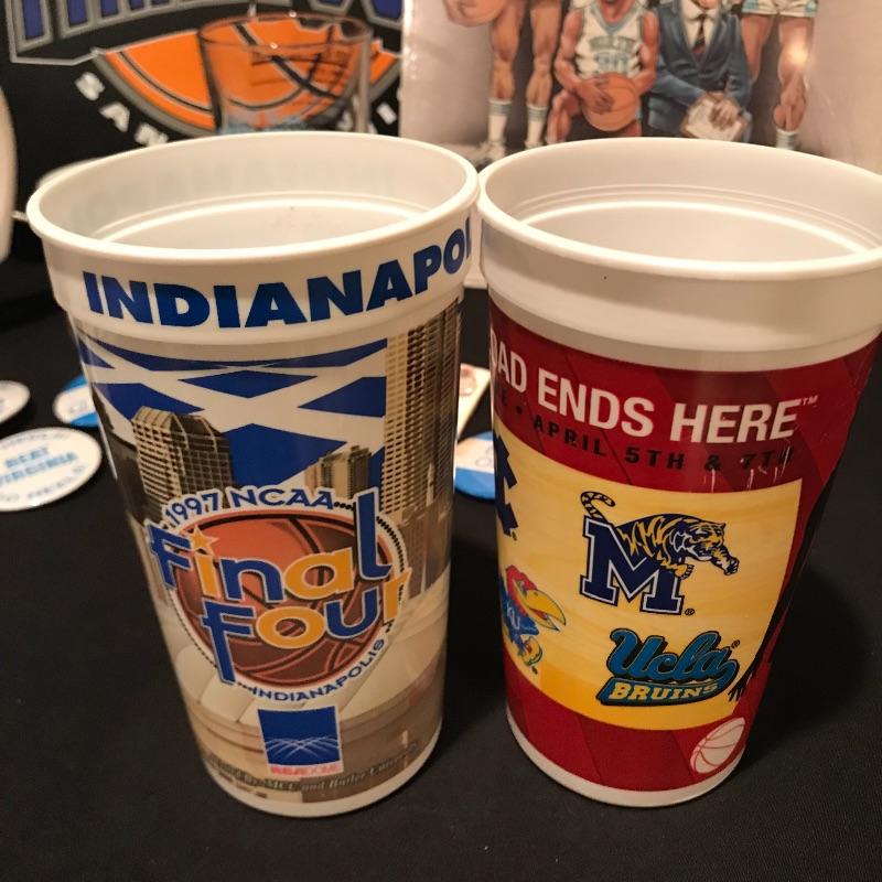 Lot includes a variety of Final Four collectibles from the 1990s including stadium seat cushions, buttons, pins, glasses and mugs, magazines, newspapers and a print signed “Dodson.” See pics. Shipping available.