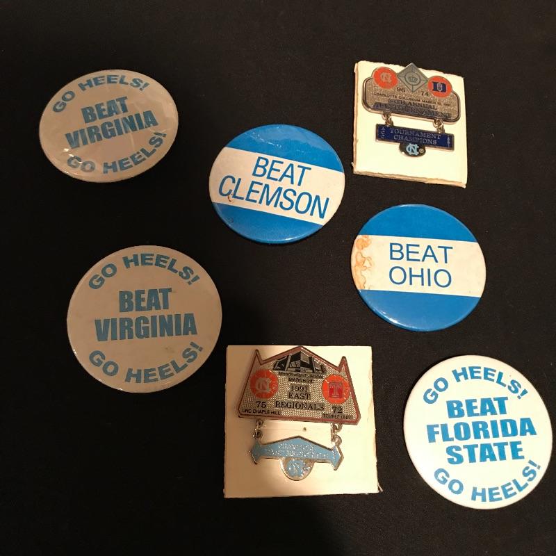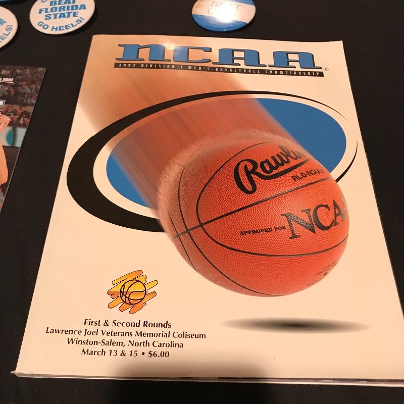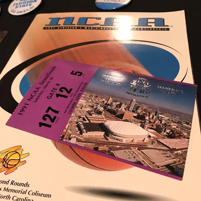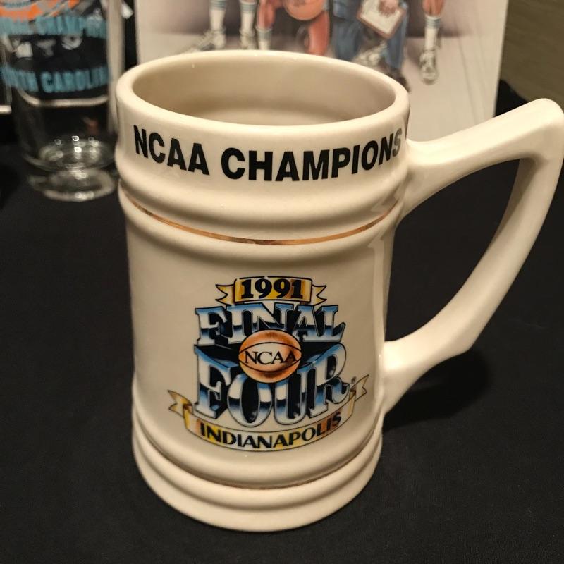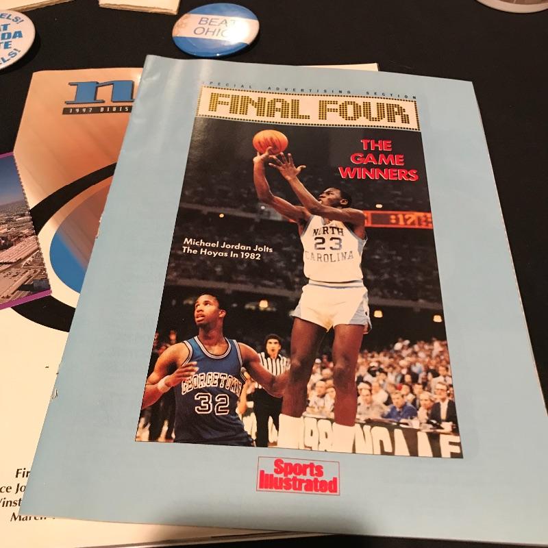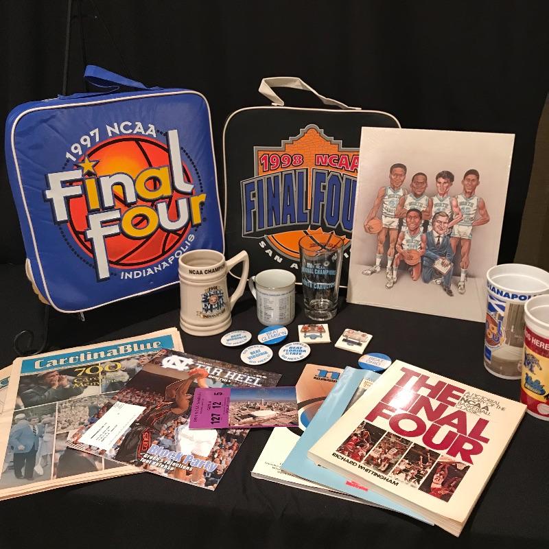 Lot includes a variety of Final Four collectibles from the 1990s including stadium seat cushions, buttons, pins, glasses and mugs, magazines, newspapers and a print signed “Dodson.” See pics. Shipping available.