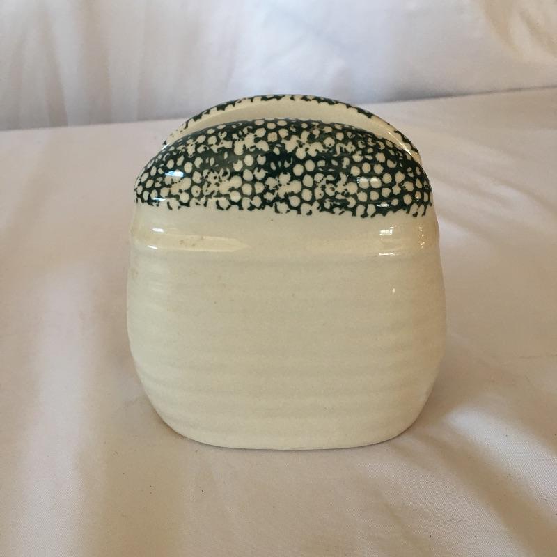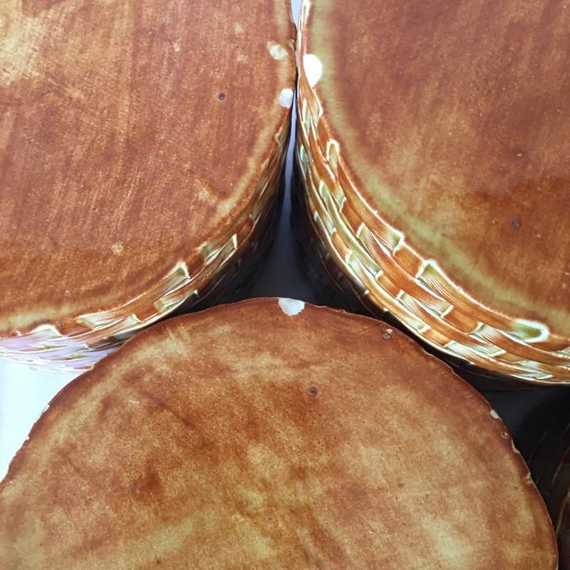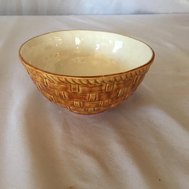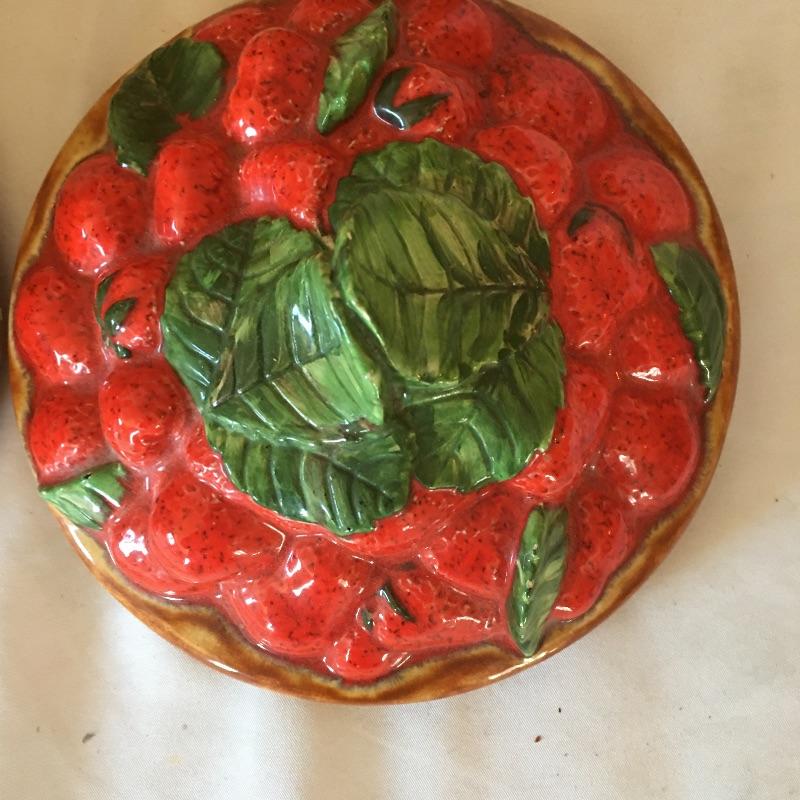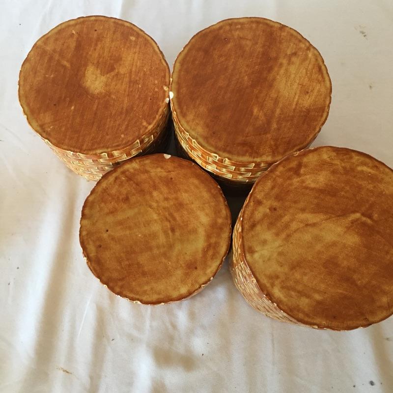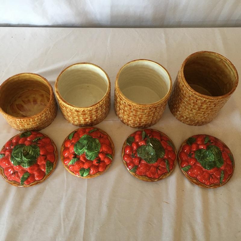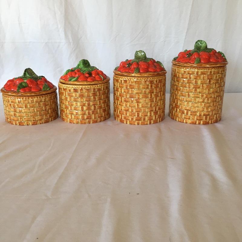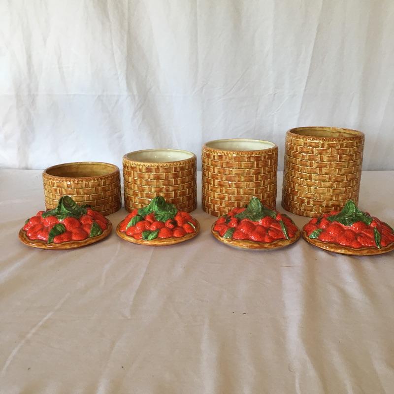 This four canister set were made to look like baskets with strawberries on top and includes a matching bowl. Dated 1973, this matching set will add country charm to your kitchen. Also includes a white and blue napkin holder. Tallest canister measures 5.5”D x 7” tall. Three of the canisters have small chips on bottom, see pictures. Shipping available