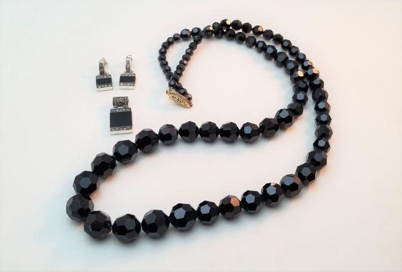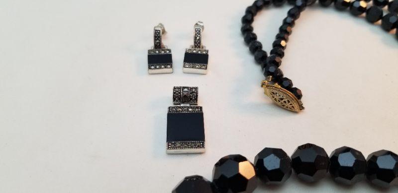 You get all you see here - nice vintage French Jet faceted necklace (28" long) and a sterling silver and onyx/marcasite pendant (1" long) with matching earrings (1" long). All in good condition.