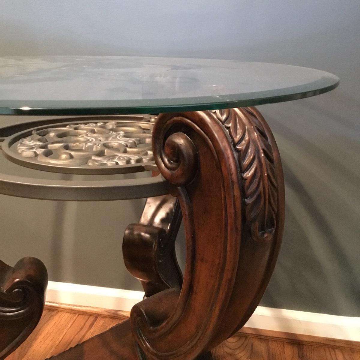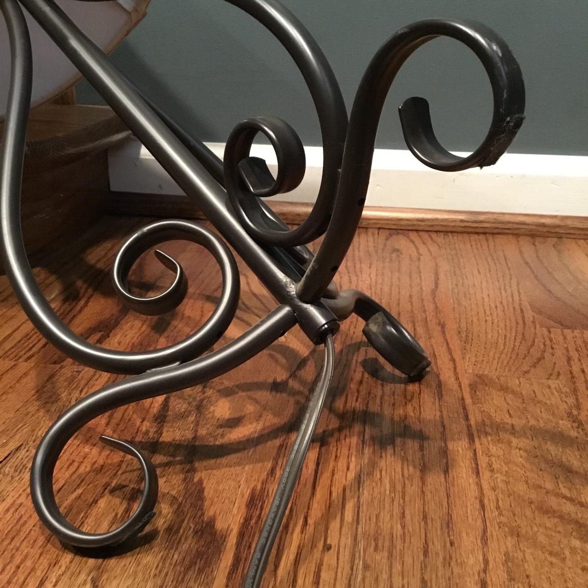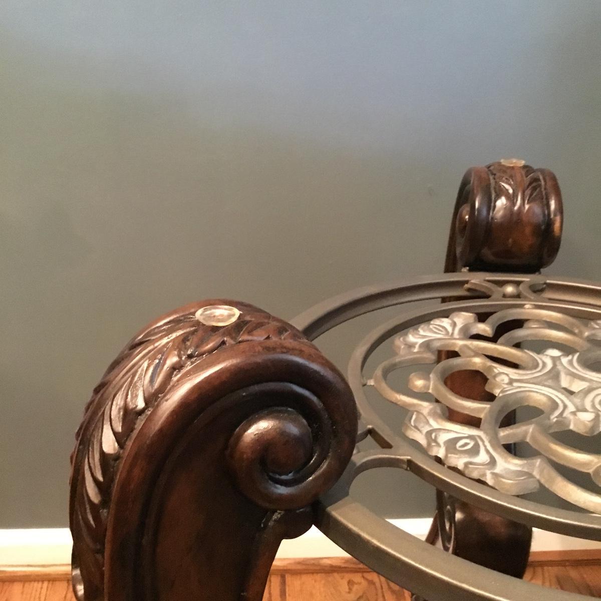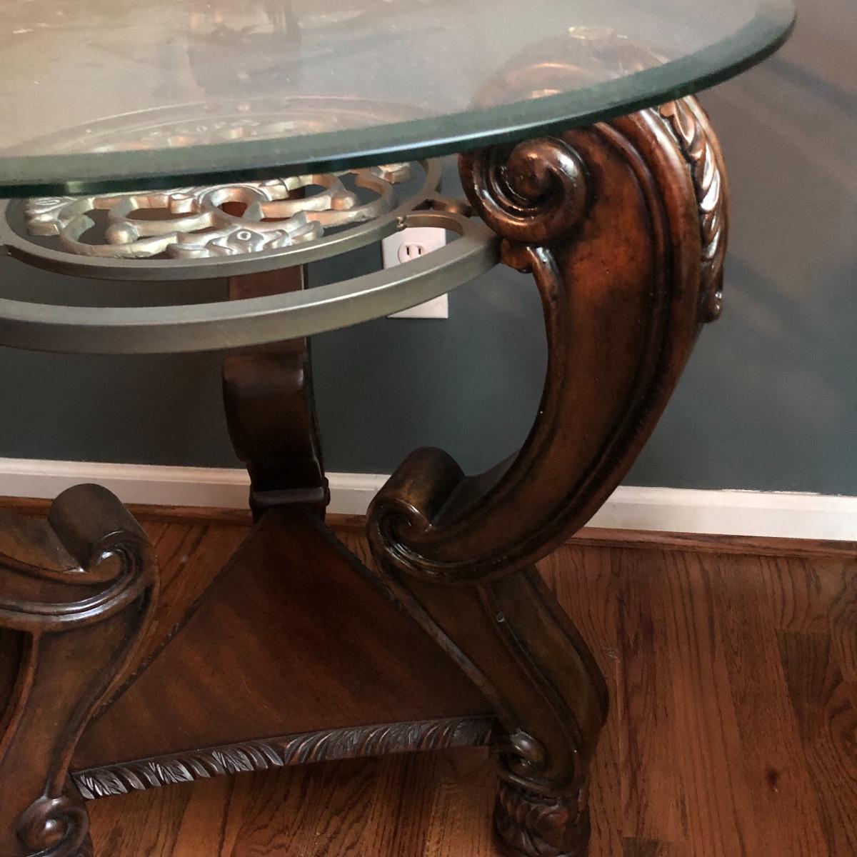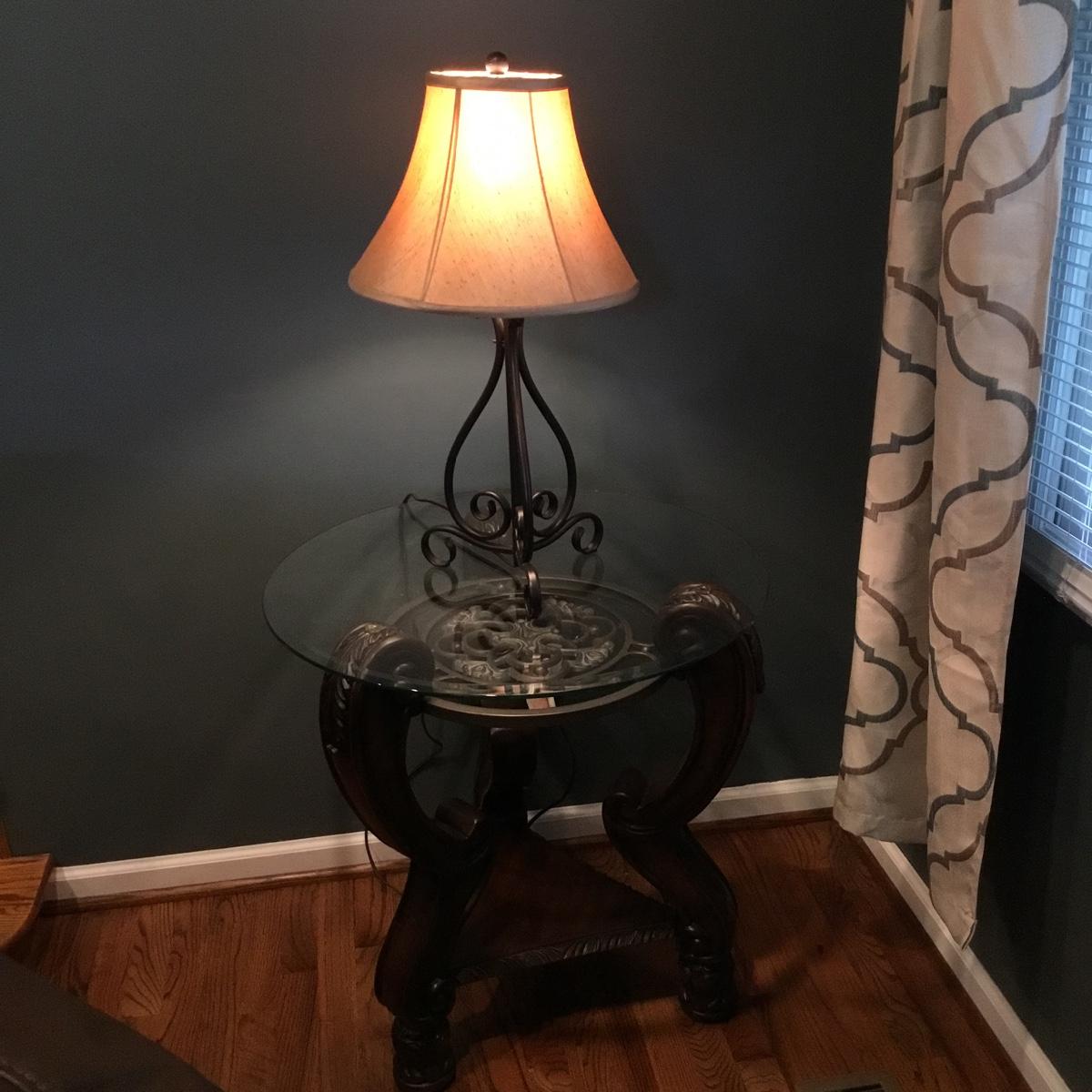 Included in this lot is a stunning round side table with a glass top and a lamp with metal stand and creme colored shade. We paired these two pieces together as they both have a 3 legged design. Table stands 36” tall and glass round table top has a diameter of 26”. Lamp incl. shade stands 24” tall. Glass top can be lifted off the wood base but is sitting securely with suction cups. The section below the glass top is a grey metal circle with an ornate design in the center. Local pickup only.