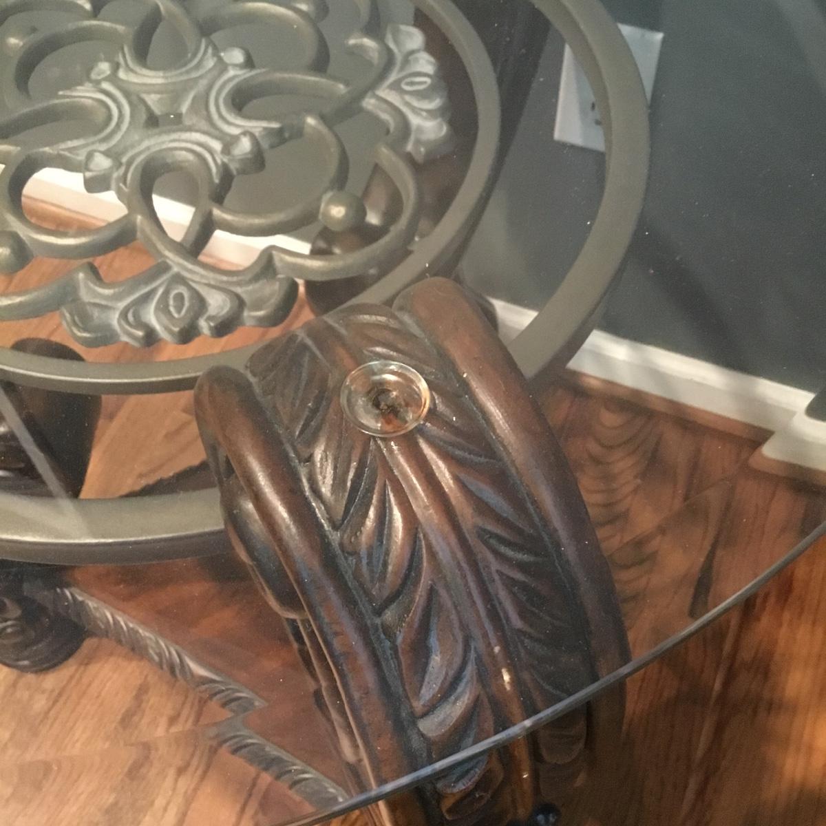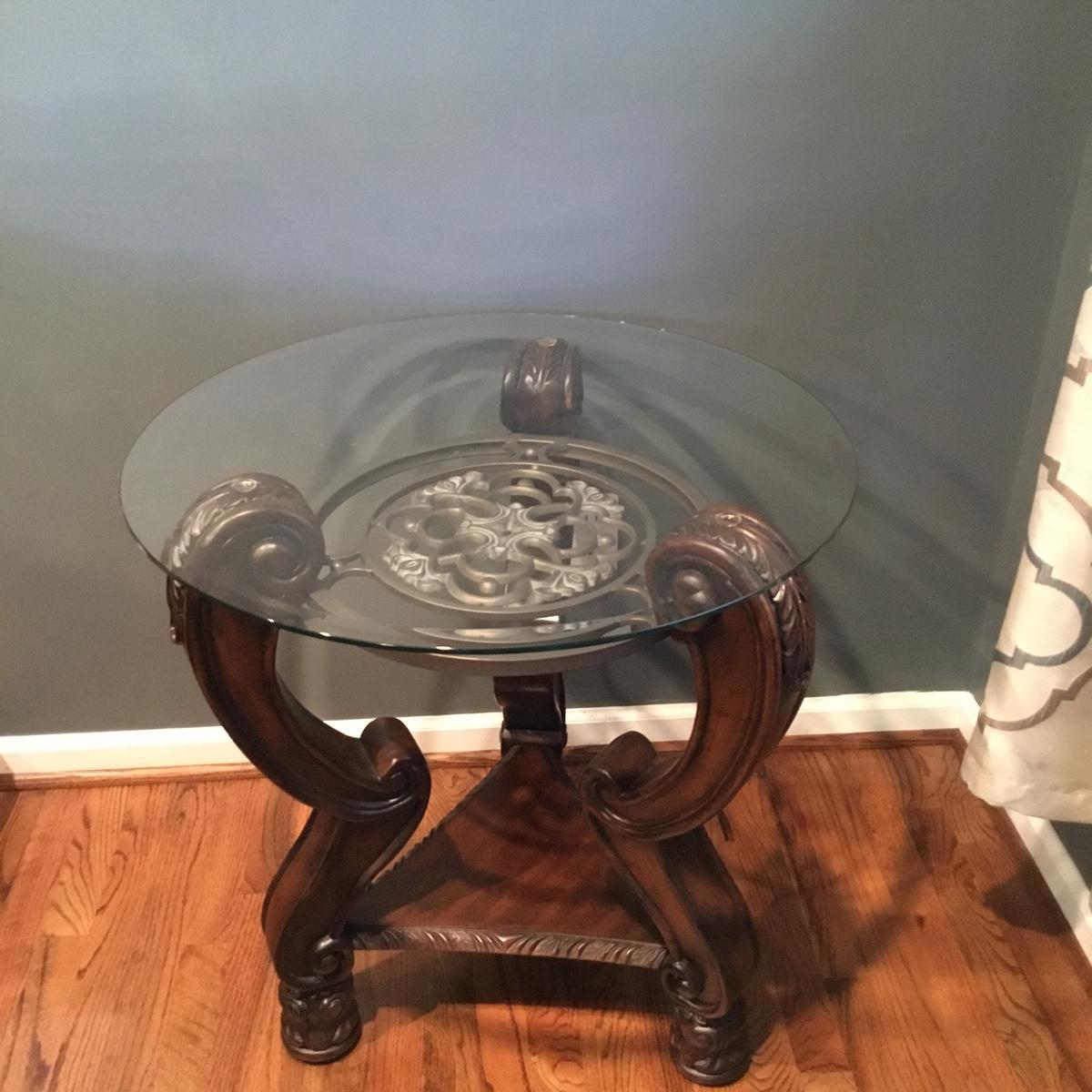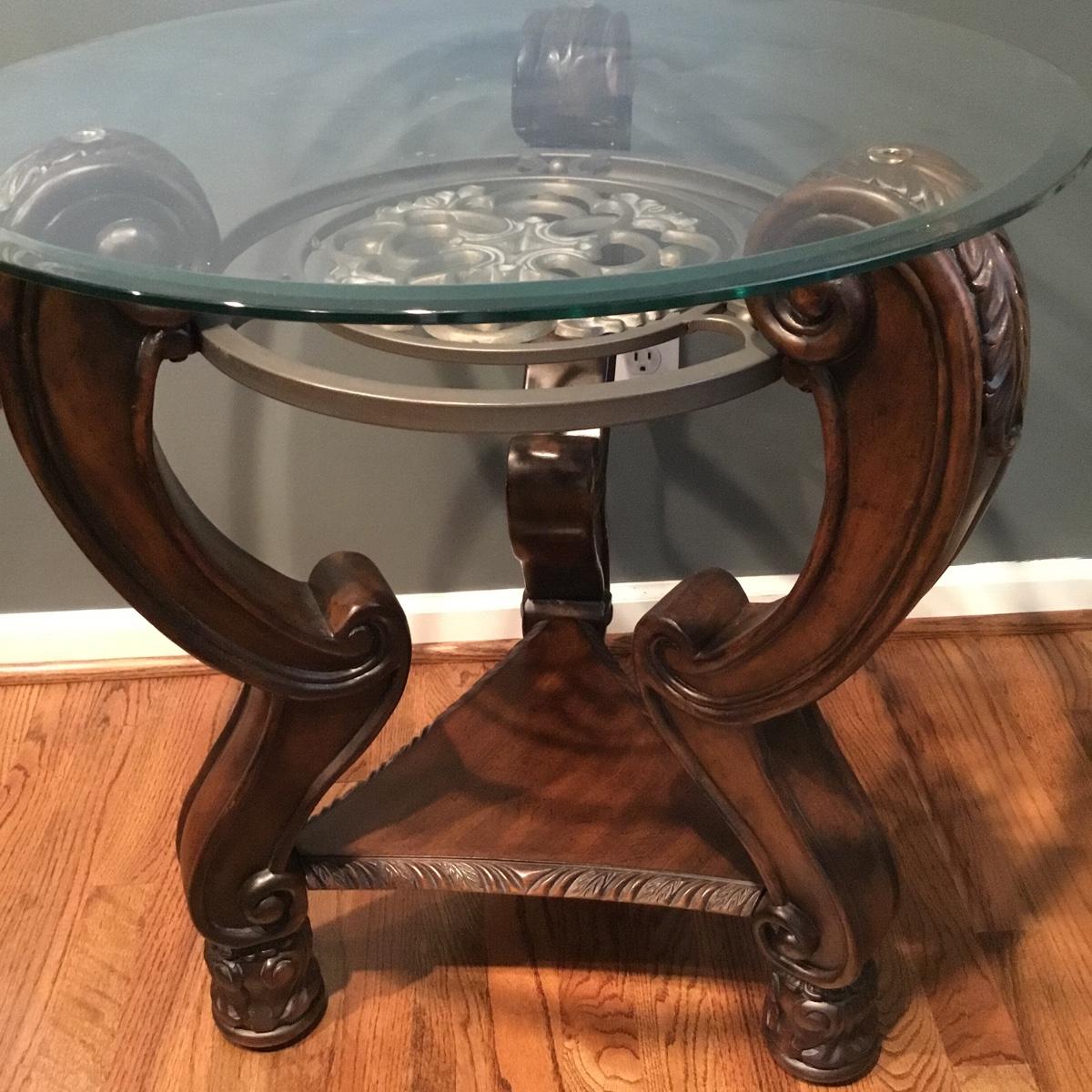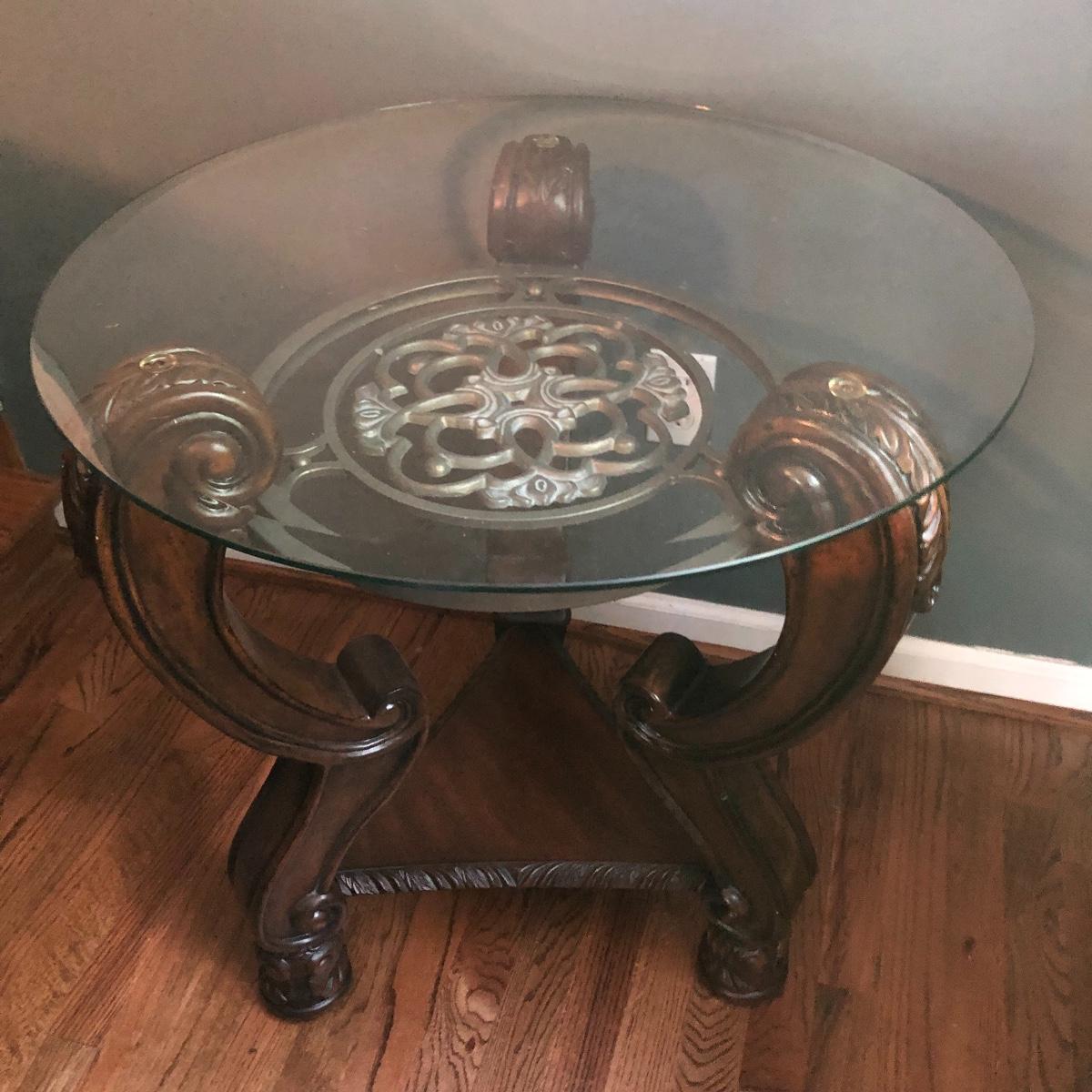 Included in this lot is a stunning round side table with a glass top and a lamp with metal stand and creme colored shade. We paired these two pieces together as they both have a 3 legged design. Table stands 36” tall and glass round table top has a diameter of 26”. Lamp incl. shade stands 24” tall. Glass top can be lifted off the wood base but is sitting securely with suction cups. The section below the glass top is a grey metal circle with an ornate design in the center. Local pickup only.
