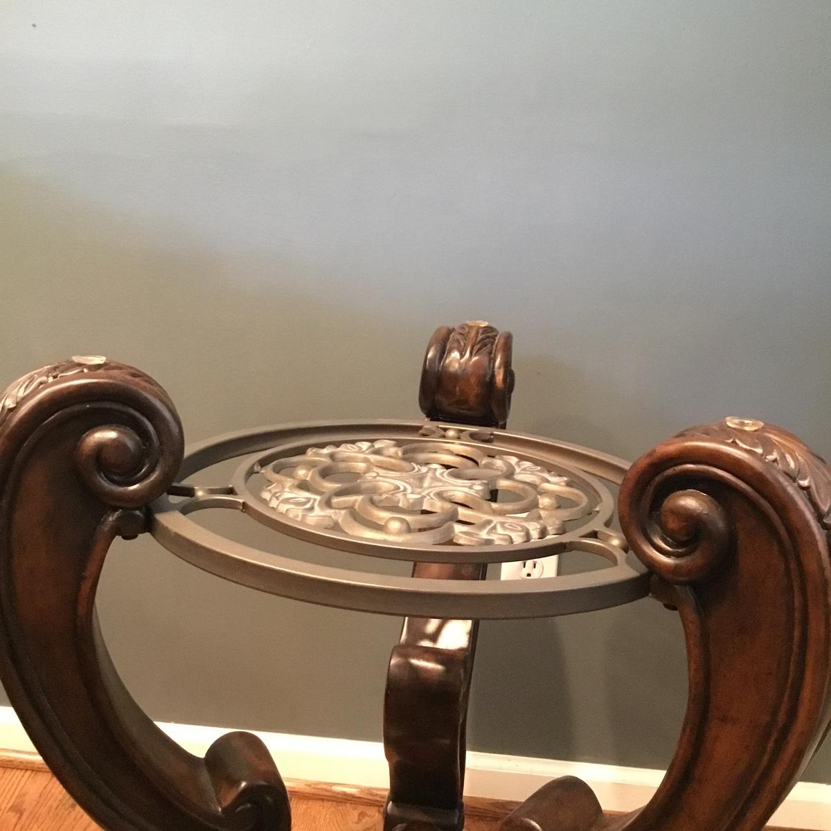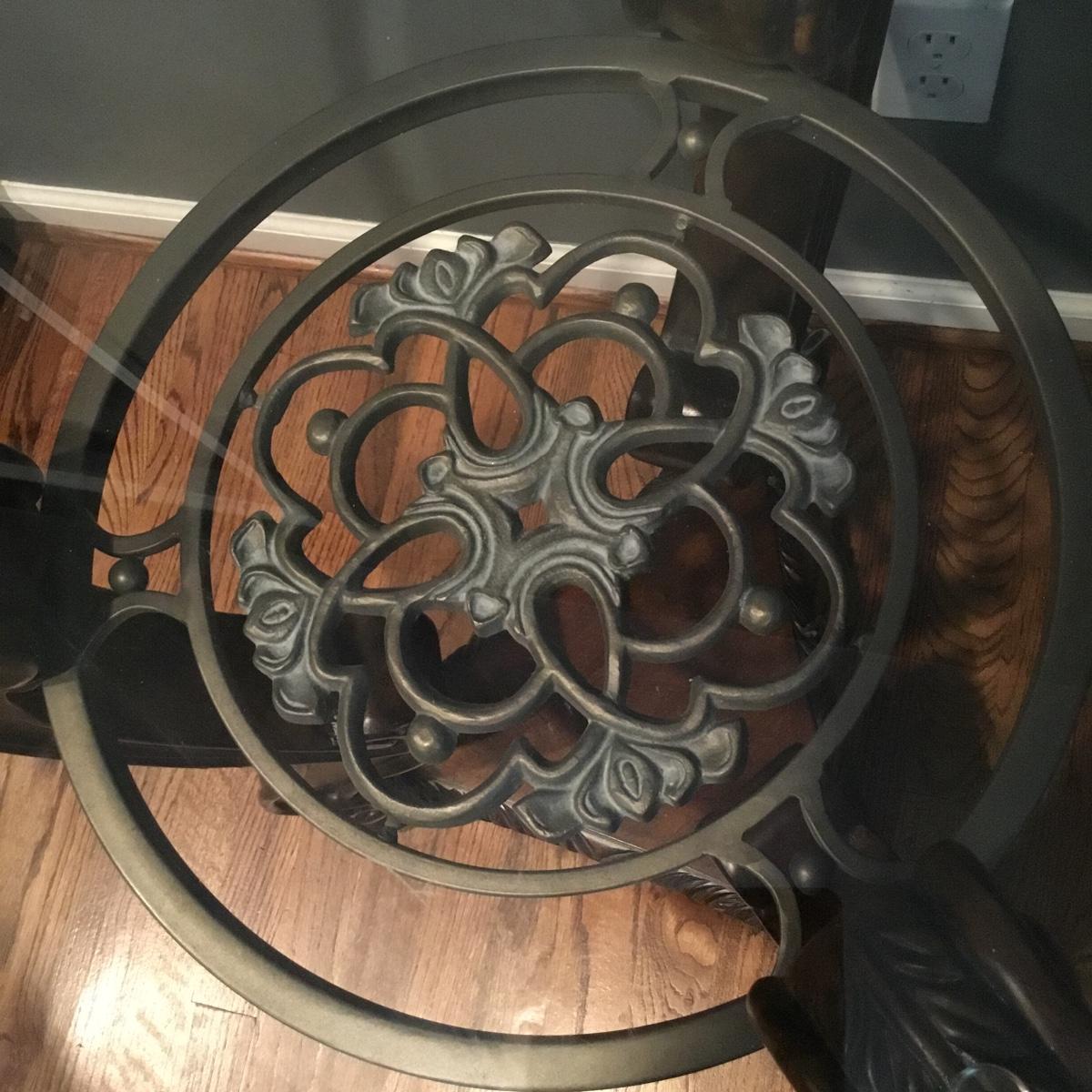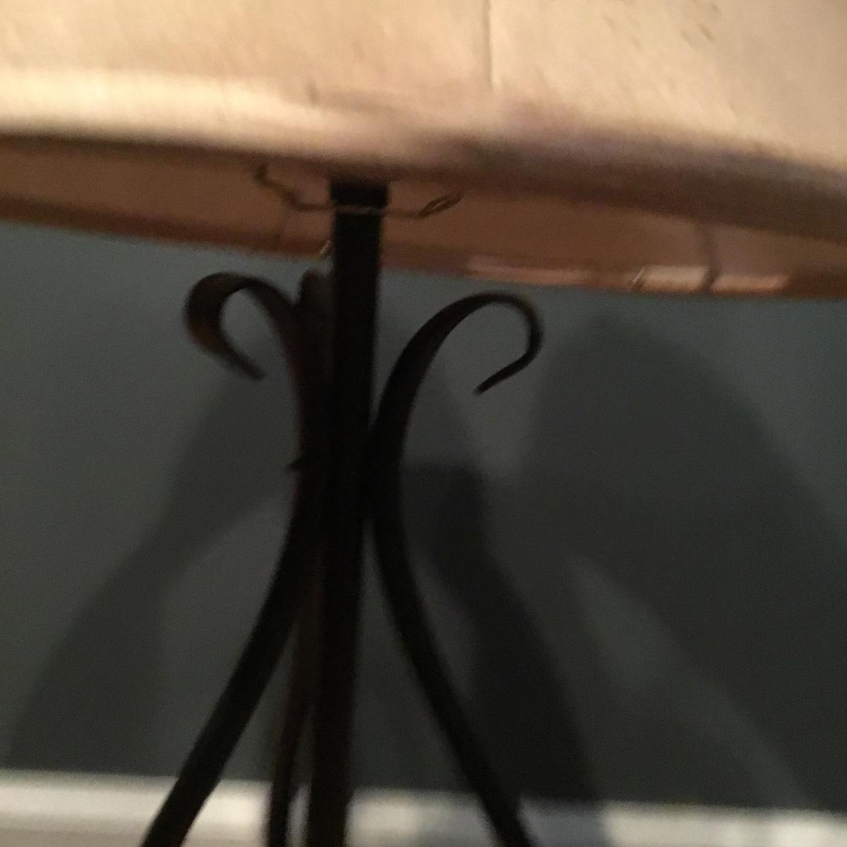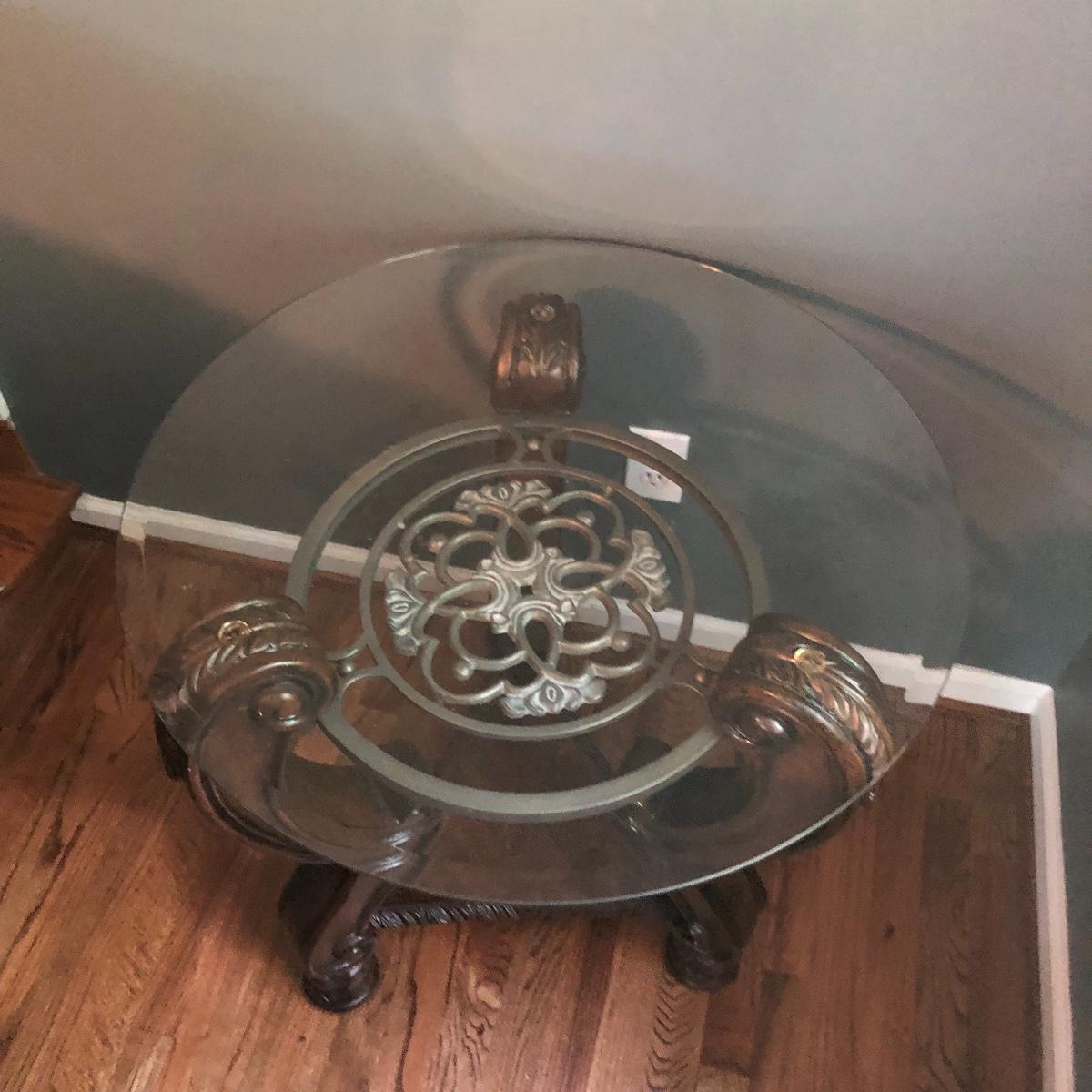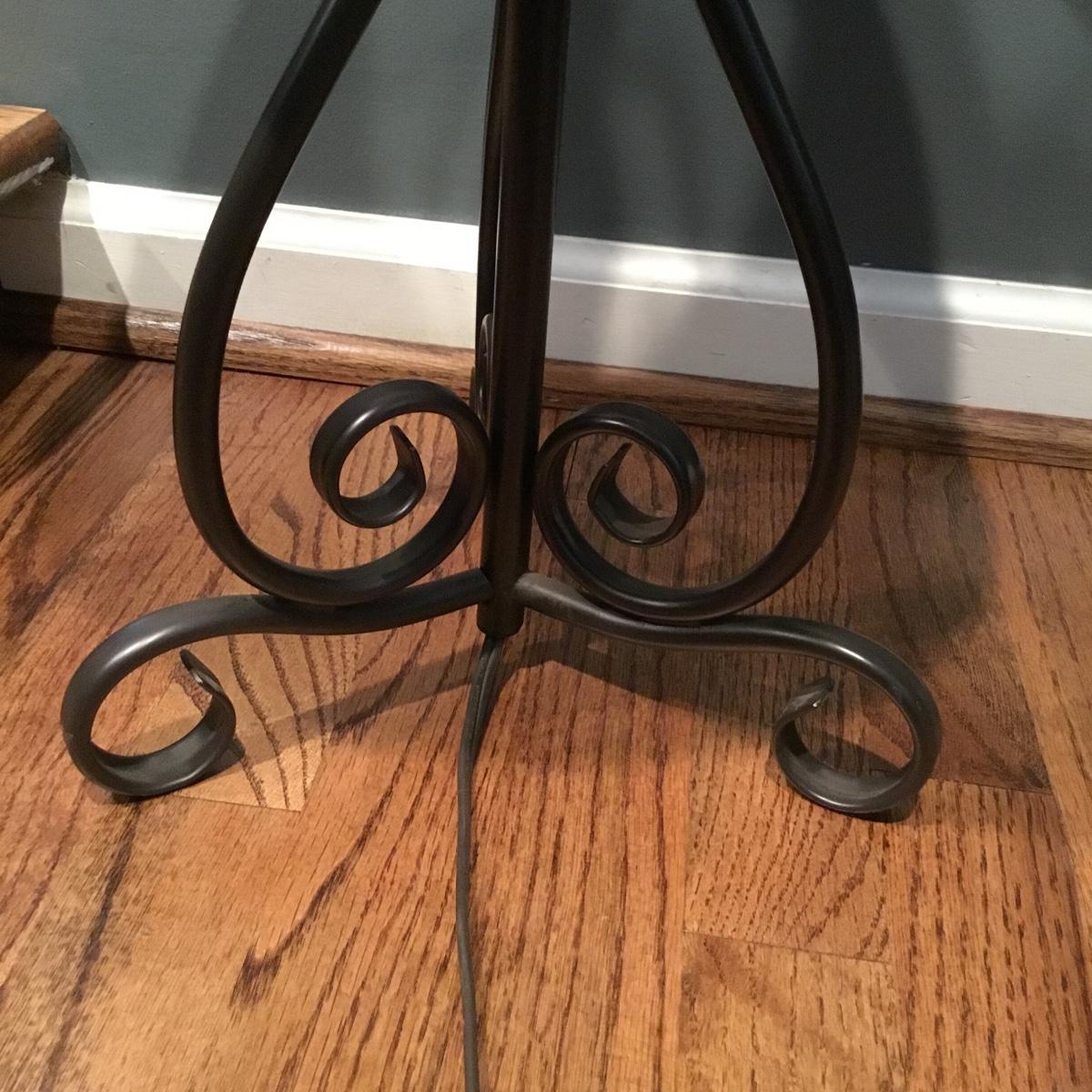 Included in this lot is a stunning round side table with a glass top and a lamp with metal stand and creme colored shade. We paired these two pieces together as they both have a 3 legged design. Table stands 36” tall and glass round table top has a diameter of 26”. Lamp incl. shade stands 24” tall. Glass top can be lifted off the wood base but is sitting securely with suction cups. The section below the glass top is a grey metal circle with an ornate design in the center. Local pickup only.