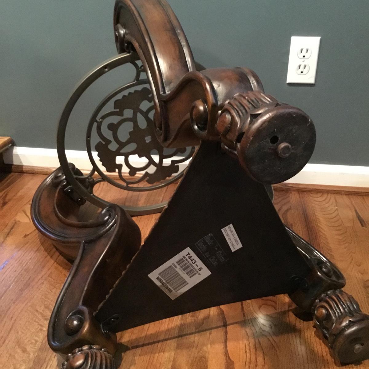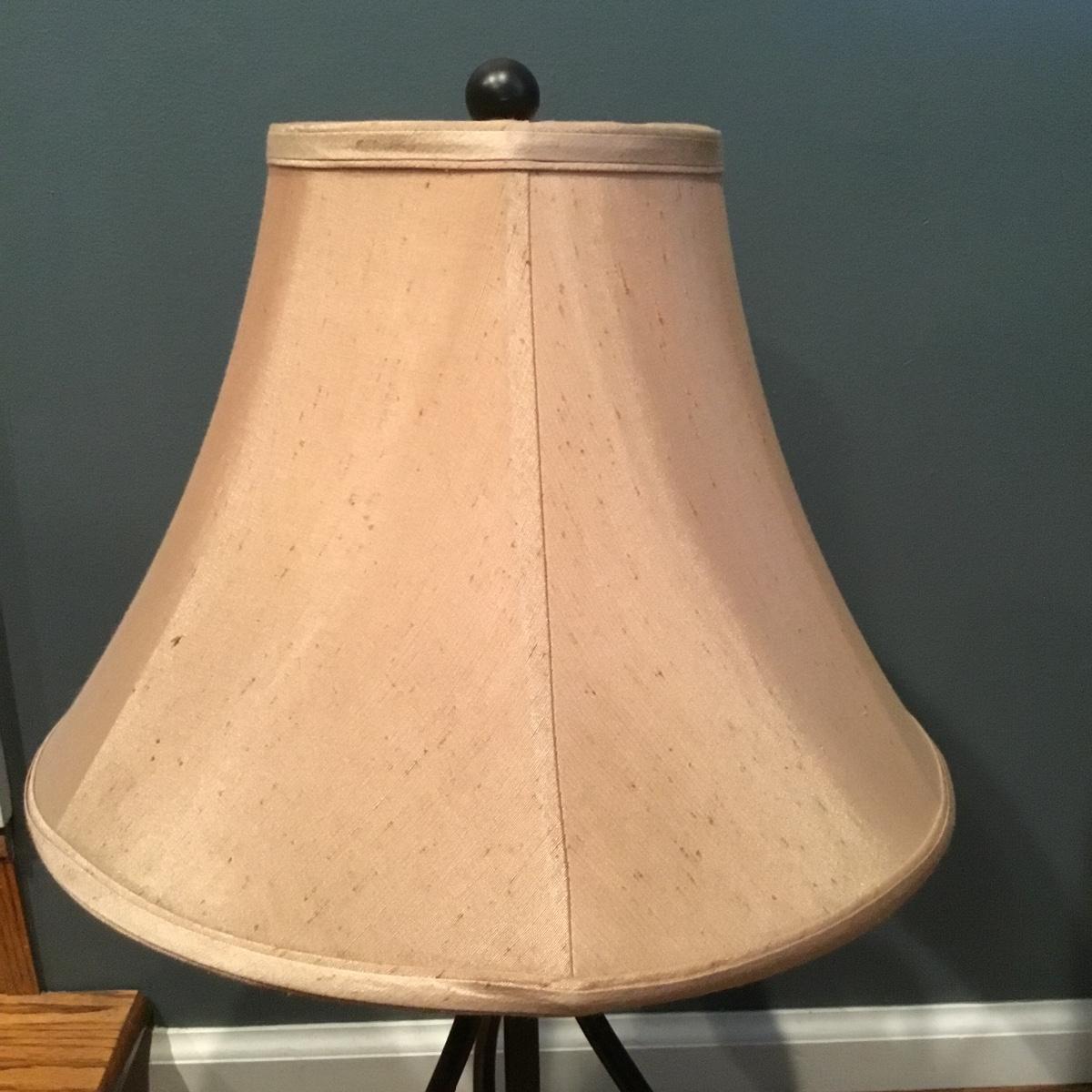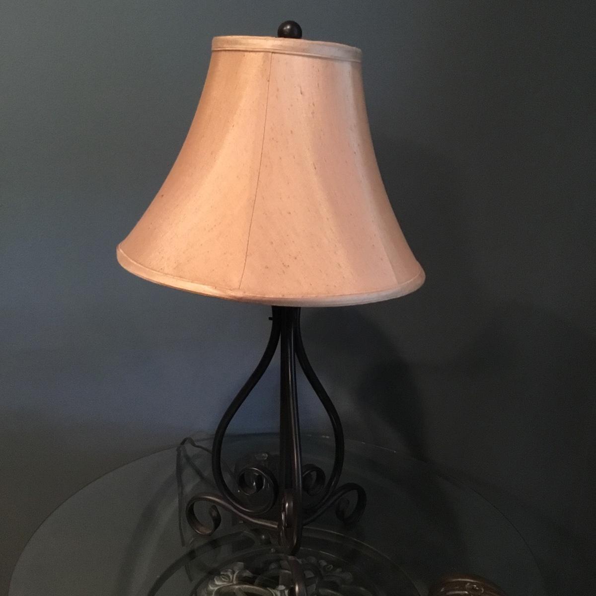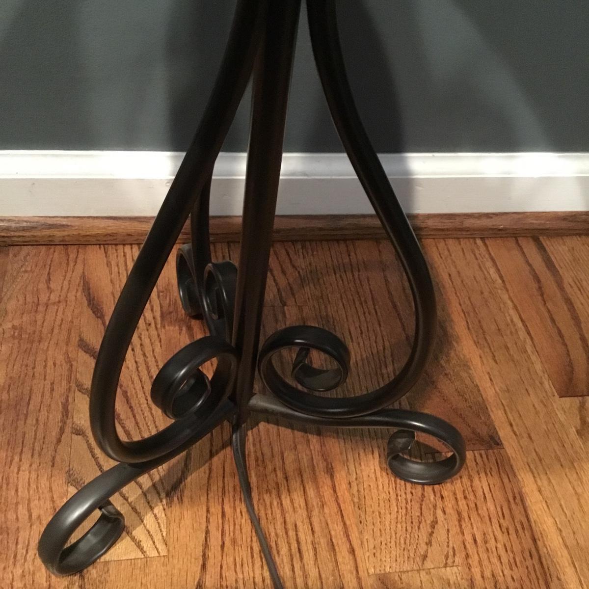Included in this lot is a stunning round side table with a glass top and a lamp with metal stand and creme colored shade. We paired these two pieces together as they both have a 3 legged design. Table stands 36” tall and glass round table top has a diameter of 26”. Lamp incl. shade stands 24” tall. Glass top can be lifted off the wood base but is sitting securely with suction cups. The section below the glass top is a grey metal circle with an ornate design in the center. Local pickup only.