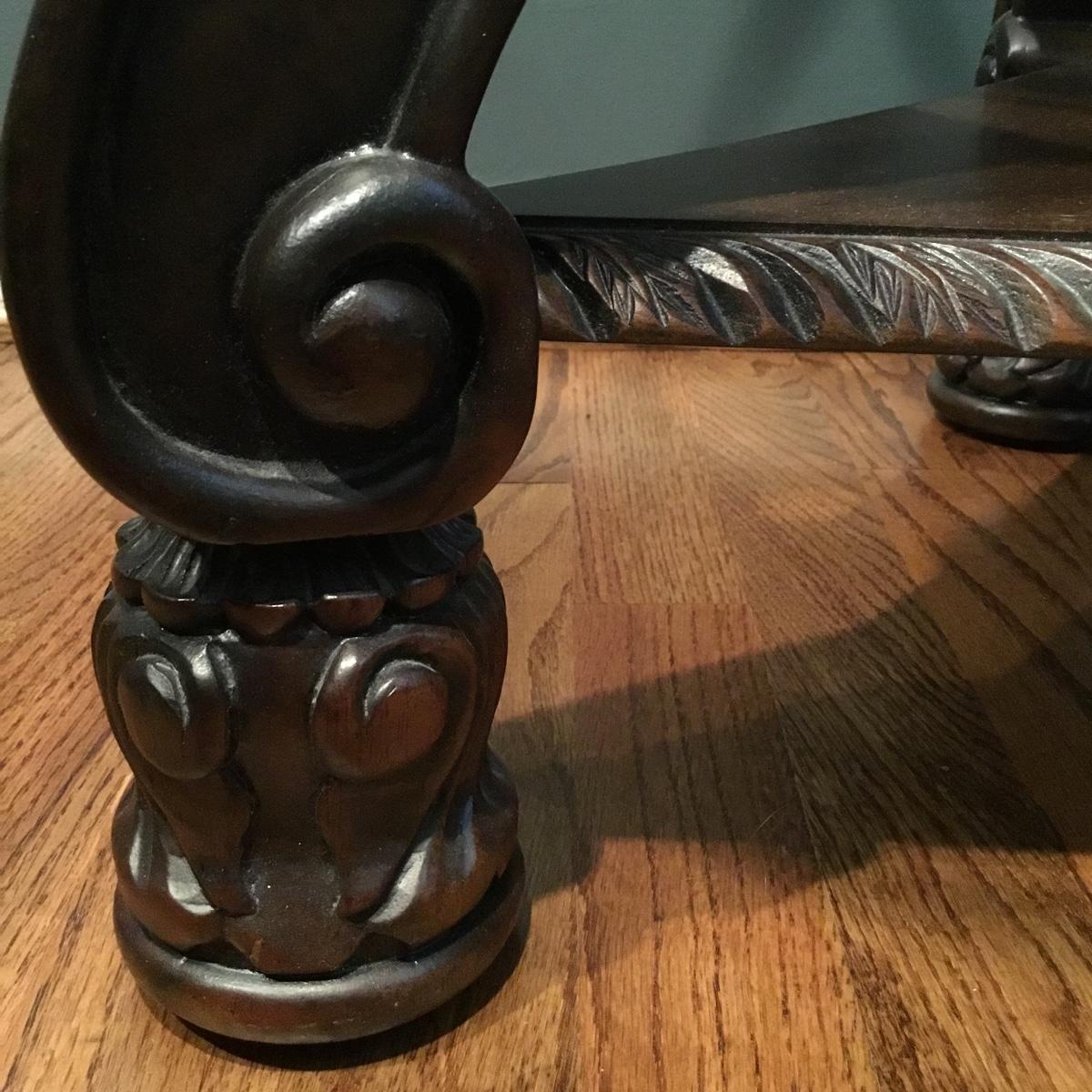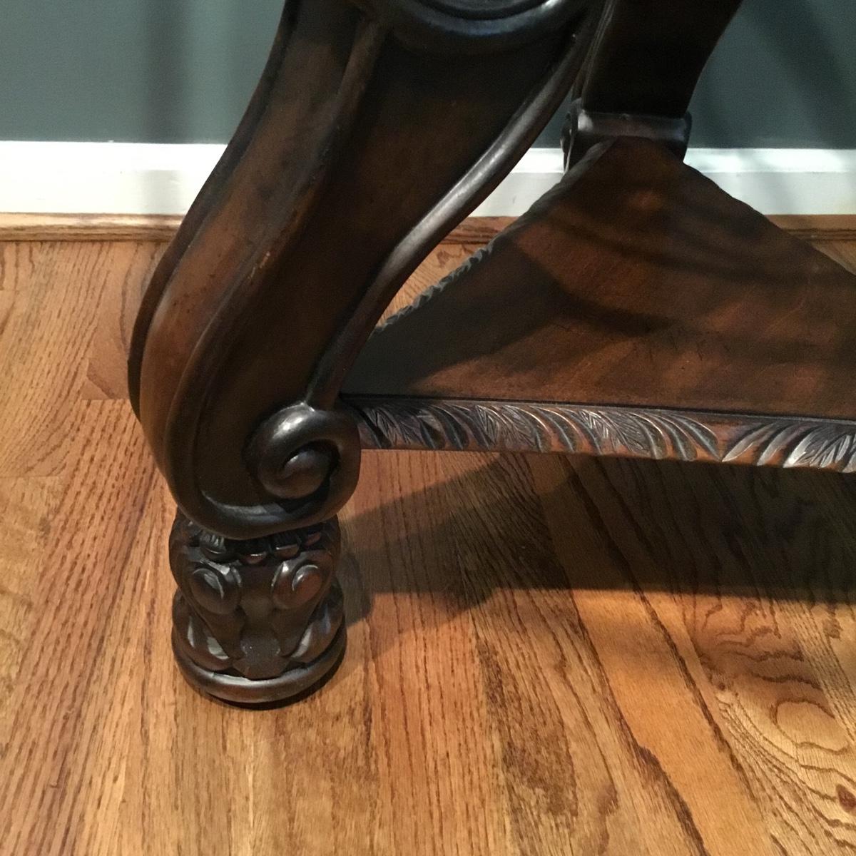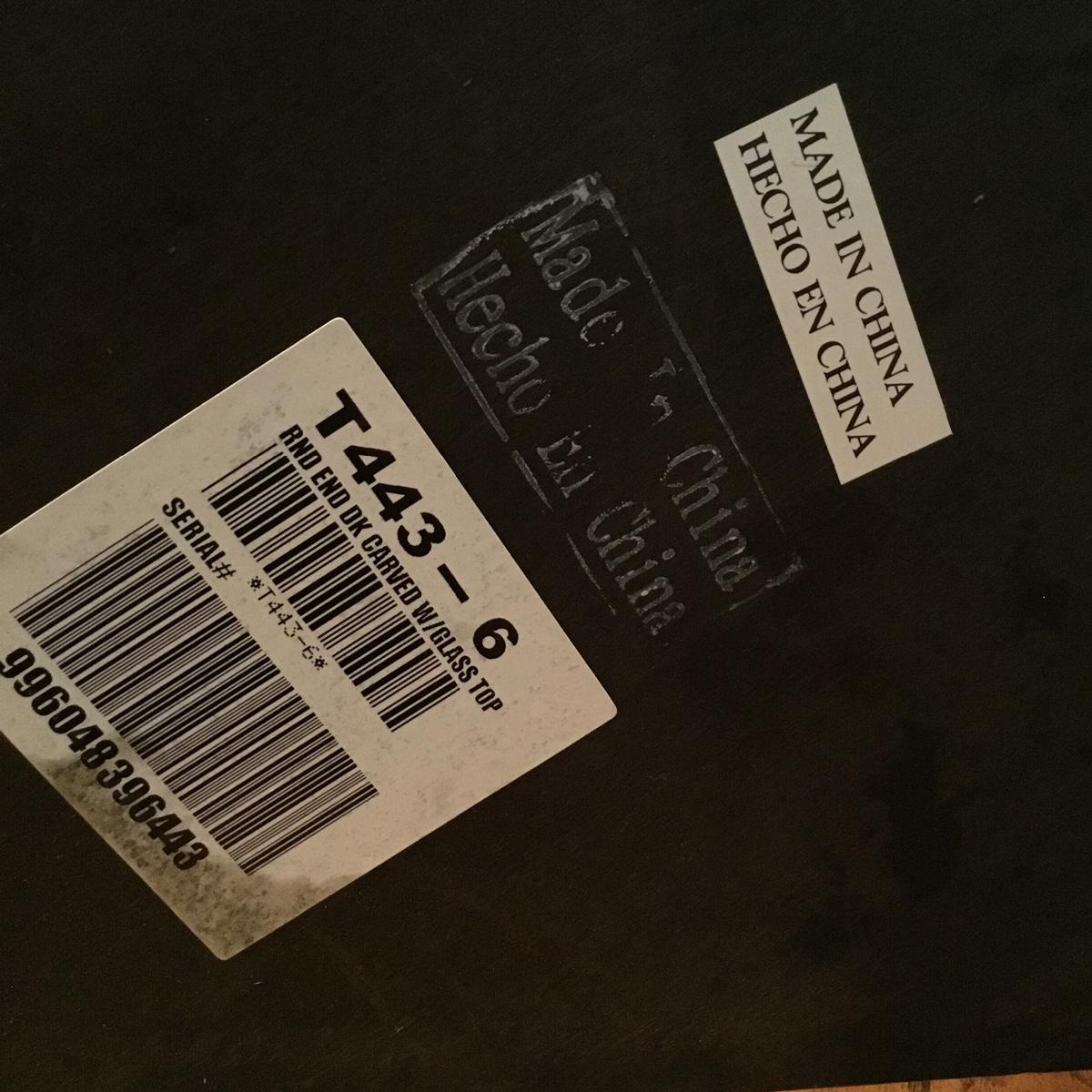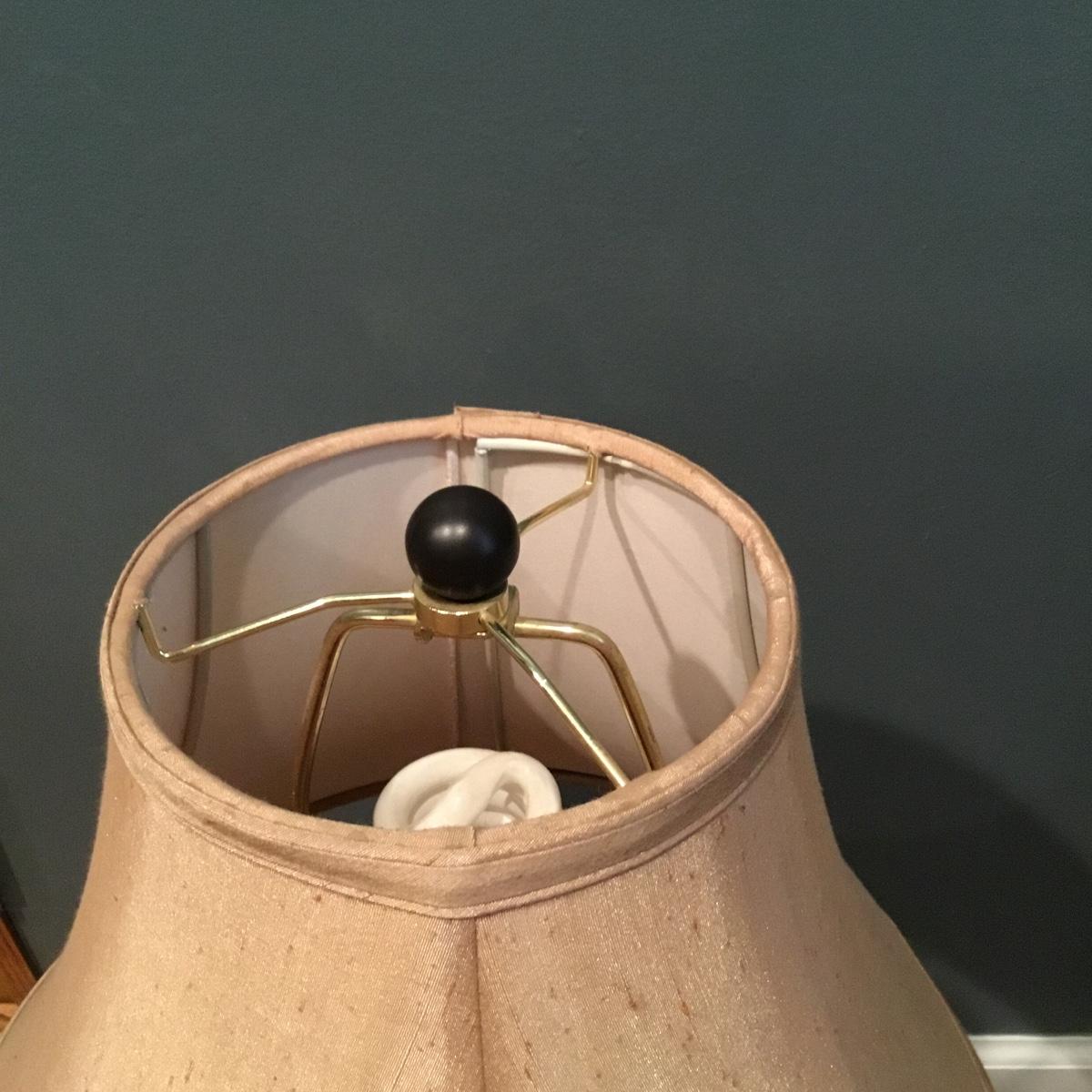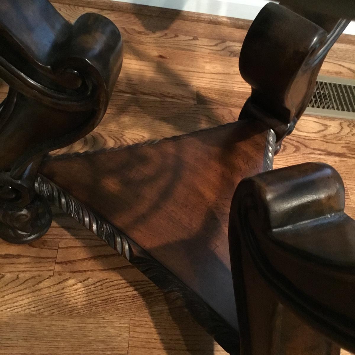 Included in this lot is a stunning round side table with a glass top and a lamp with metal stand and creme colored shade. We paired these two pieces together as they both have a 3 legged design. Table stands 36” tall and glass round table top has a diameter of 26”. Lamp incl. shade stands 24” tall. Glass top can be lifted off the wood base but is sitting securely with suction cups. The section below the glass top is a grey metal circle with an ornate design in the center. Local pickup only.