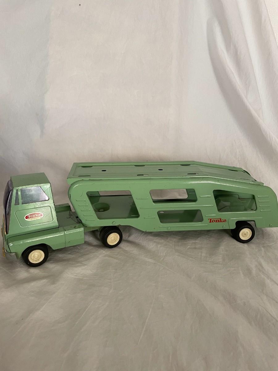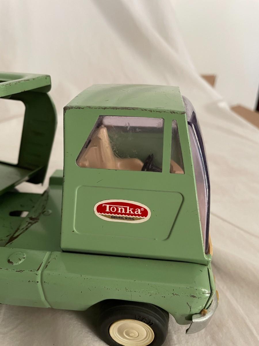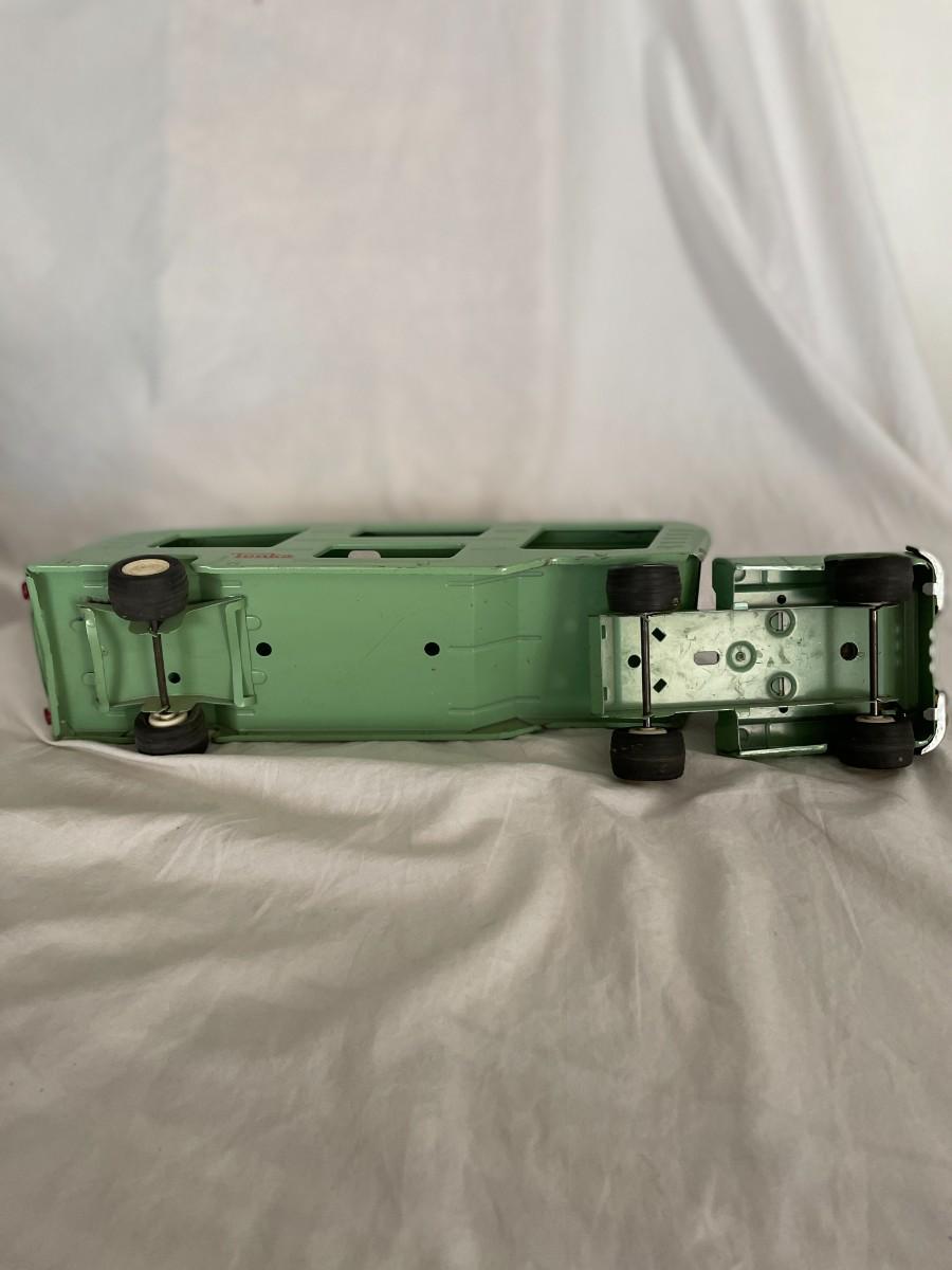 GREEN METAL TONKA TRUCK AND TRAILER. TRUCK DOORS LOGO SAYS TONKA MOUND, MINN. VERY GOOD CONDITION