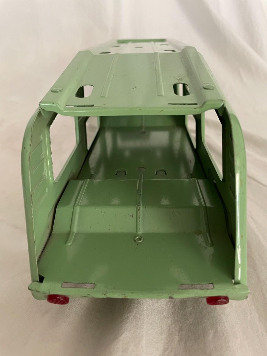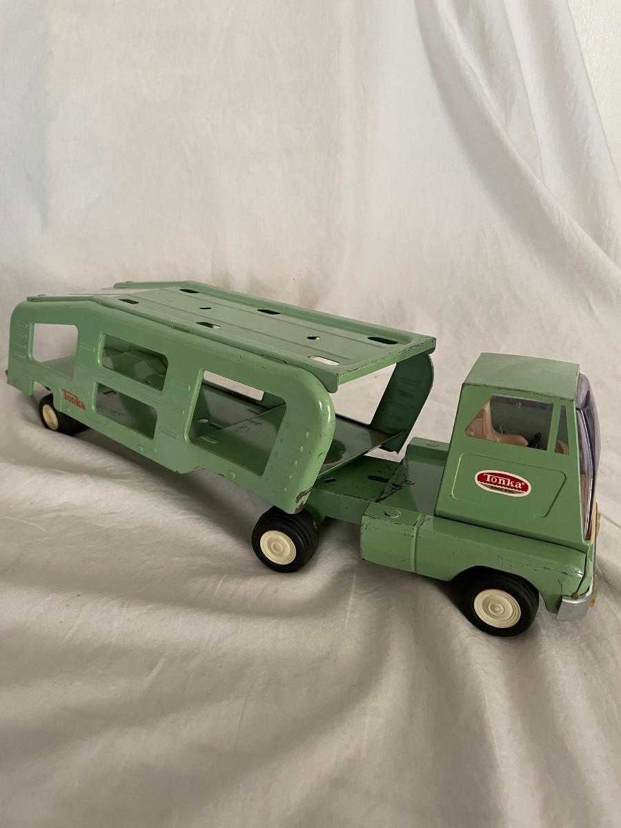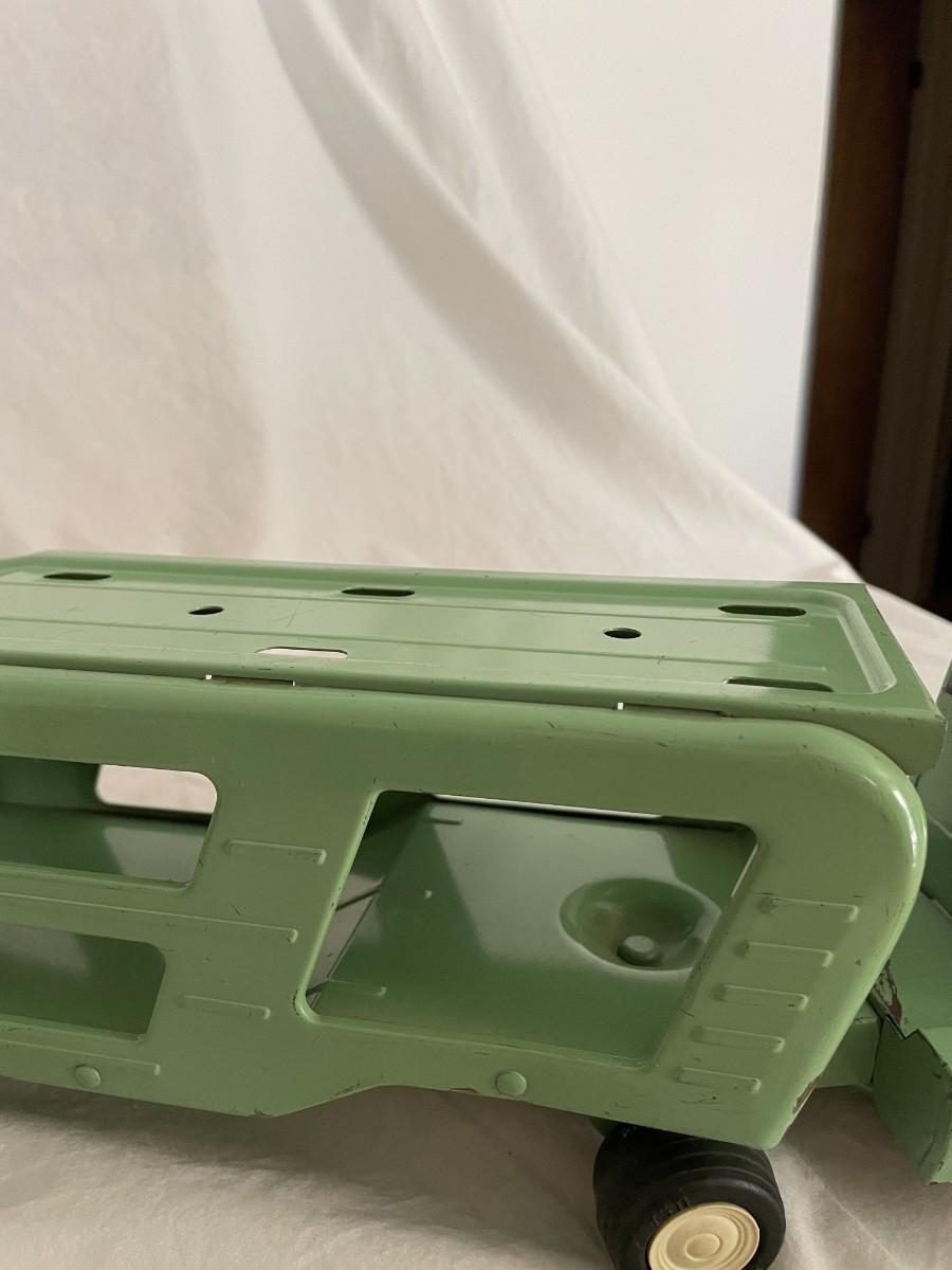 GREEN METAL TONKA TRUCK AND TRAILER. TRUCK DOORS LOGO SAYS TONKA MOUND, MINN. VERY GOOD CONDITION