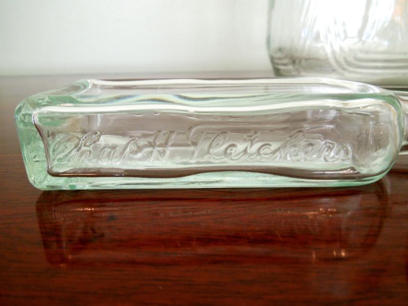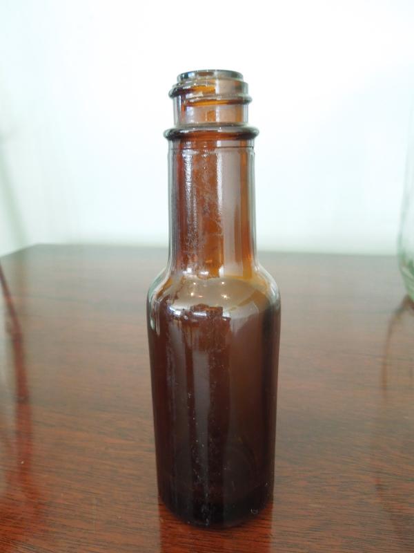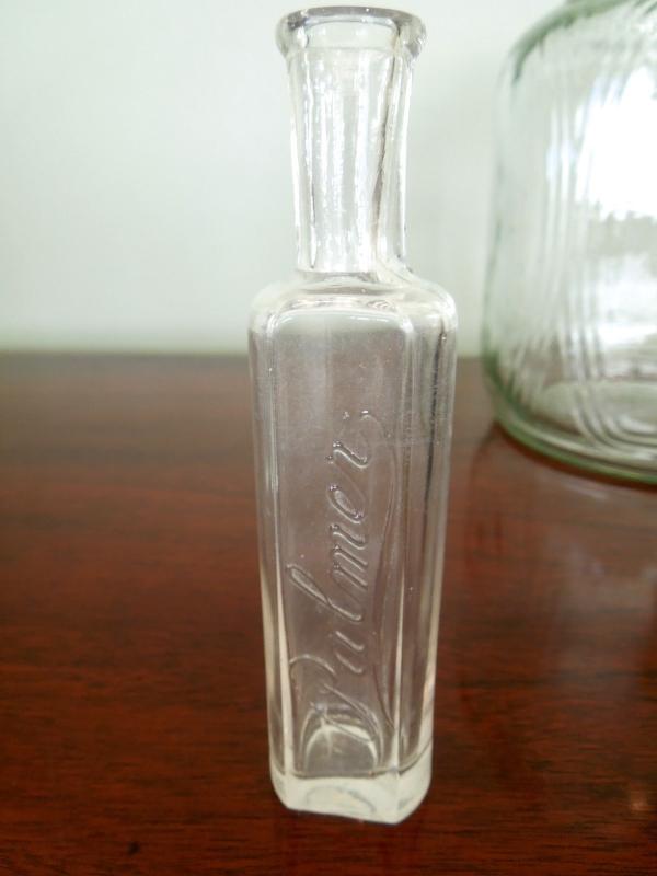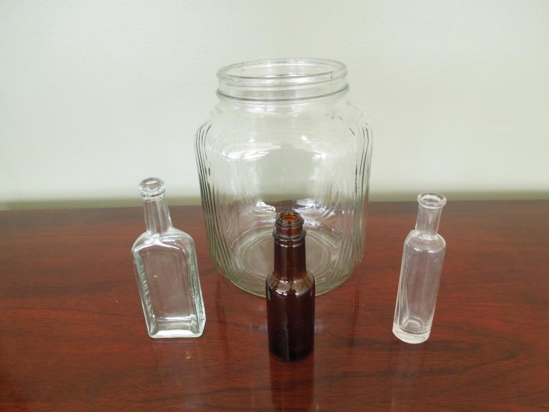Large glass jar with zinc lid (lid not pictured); Castoria clear jar 6"; Brown cylinder jar 5"; Palmer cylinder perfume jar 5". No cracks or chips.