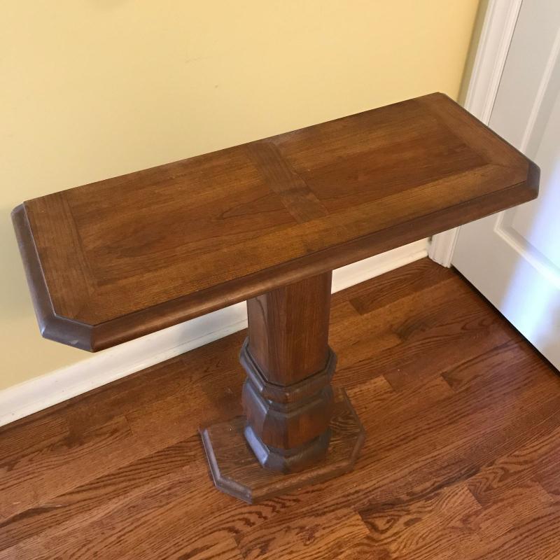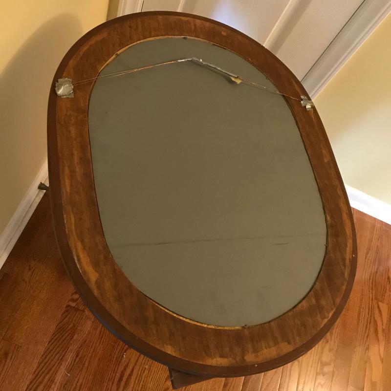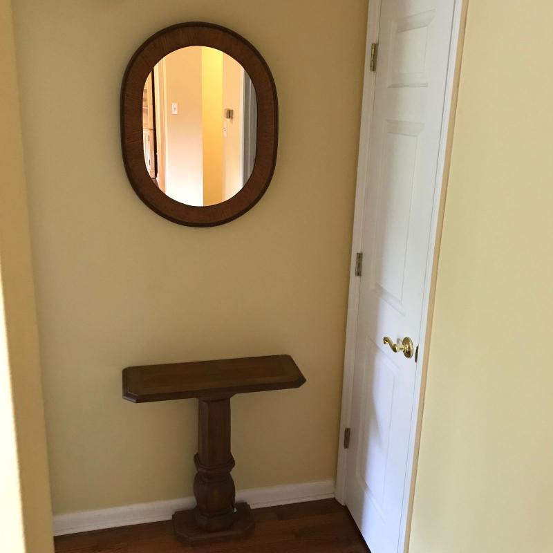 Nice wooden hall table for small spaces. 26” x 10” x 27”h. Oval mirror has wood trim and measures 27” x 21”. No shipping.