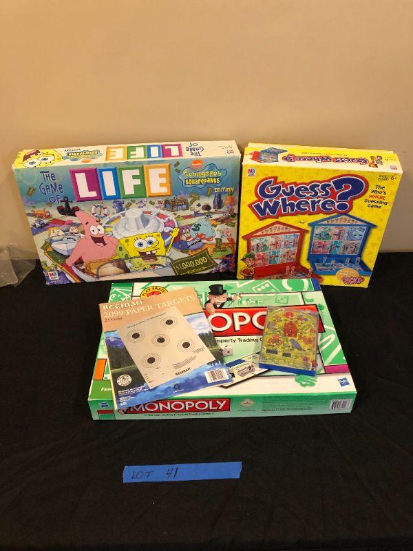Monopoly, Vintage Portable Pinball Game, Guess Where?, The Game of Life (Sponge Bob Edition), and More!