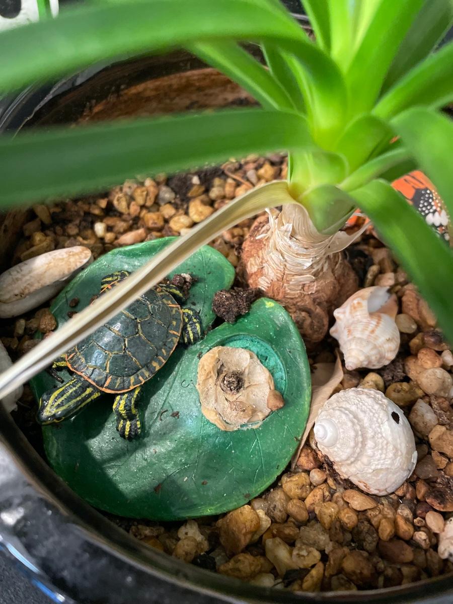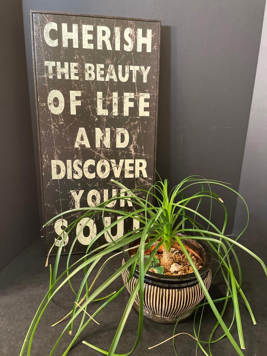 Pony Tail palm in striped pot with sign that reads "Cherish the beauty of life and discover your soul"