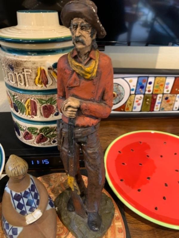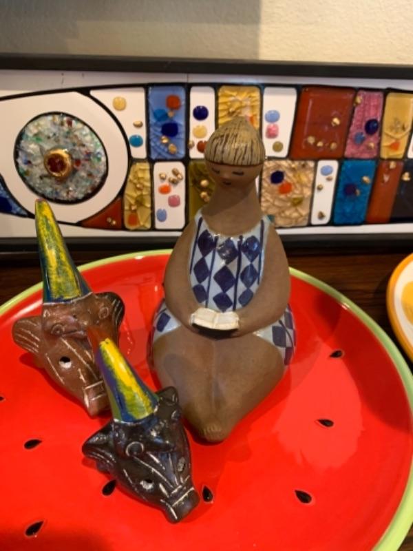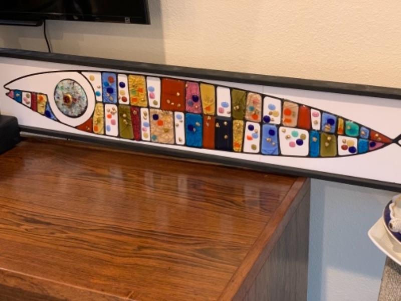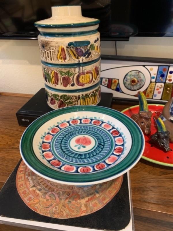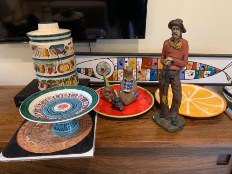 Lot 41. Impressive miid-century mosaic fish art (fused glass on ceramic), large ceramic canister, compote, Mexican art--$295