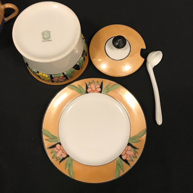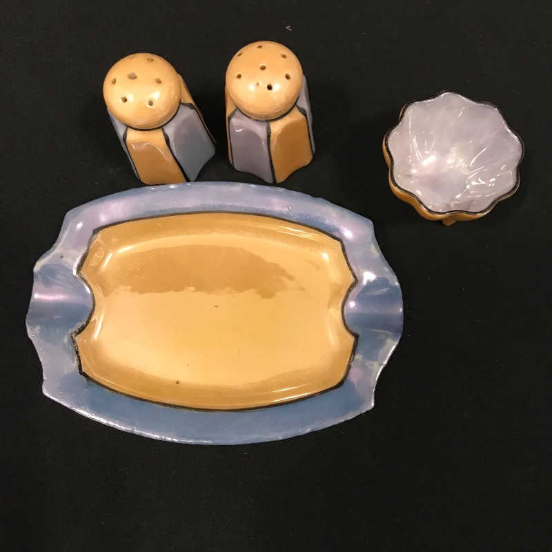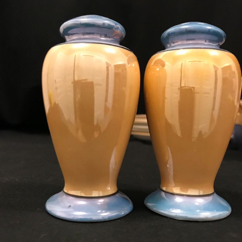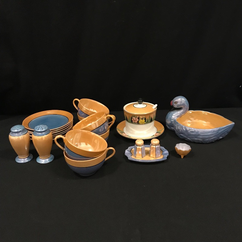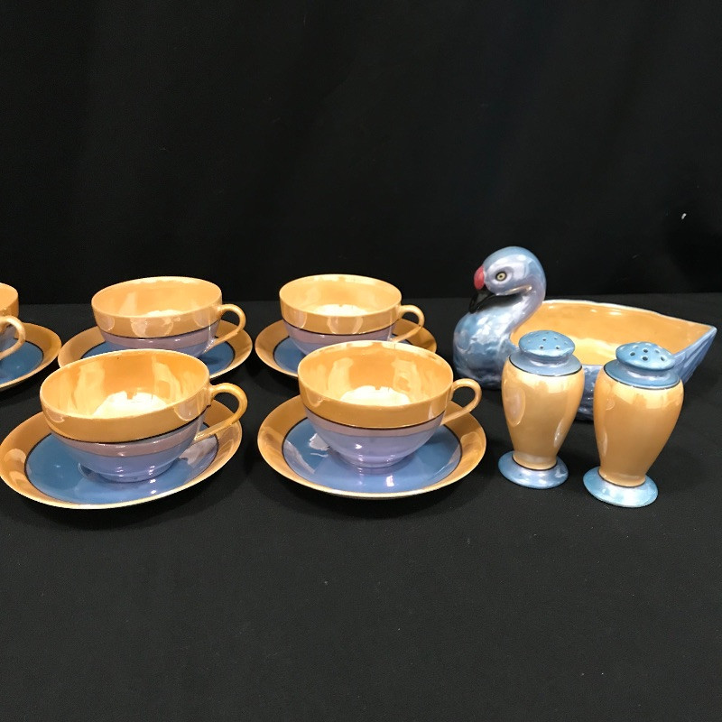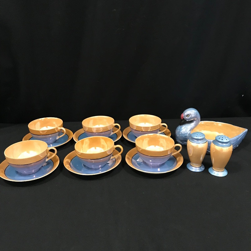 Lovely collection full of shiny peach, cornflower blue, and periwinkles. Six teacups and saucers along with a Noritake sugar bowl complete with spoon, saucer and lid. A demitasse collection with a tray, salt and pepper and a tiny bowl. Lastly a conversation starting blue bird dish. Some of the saucers have spots of wear in the blue coloring. All four salt and pepper shakers are filled through a small hole in the base. One demitasse shaker is missing its cork, see images. Shipping available.
