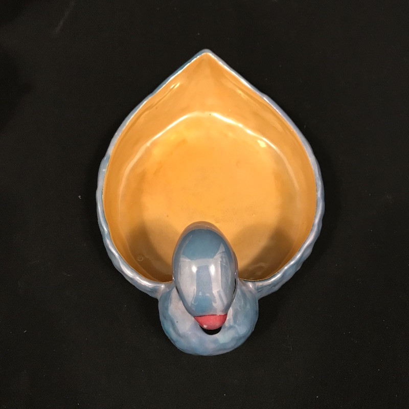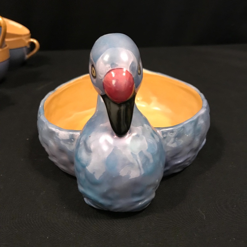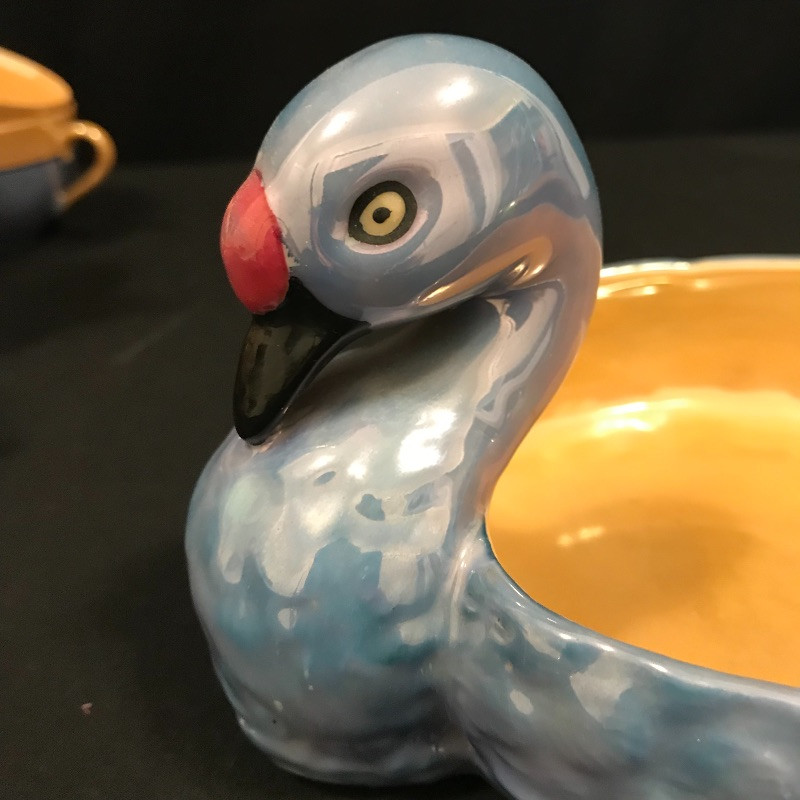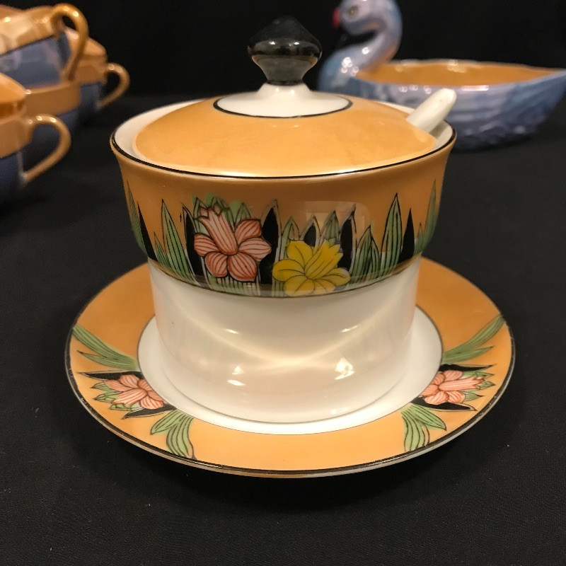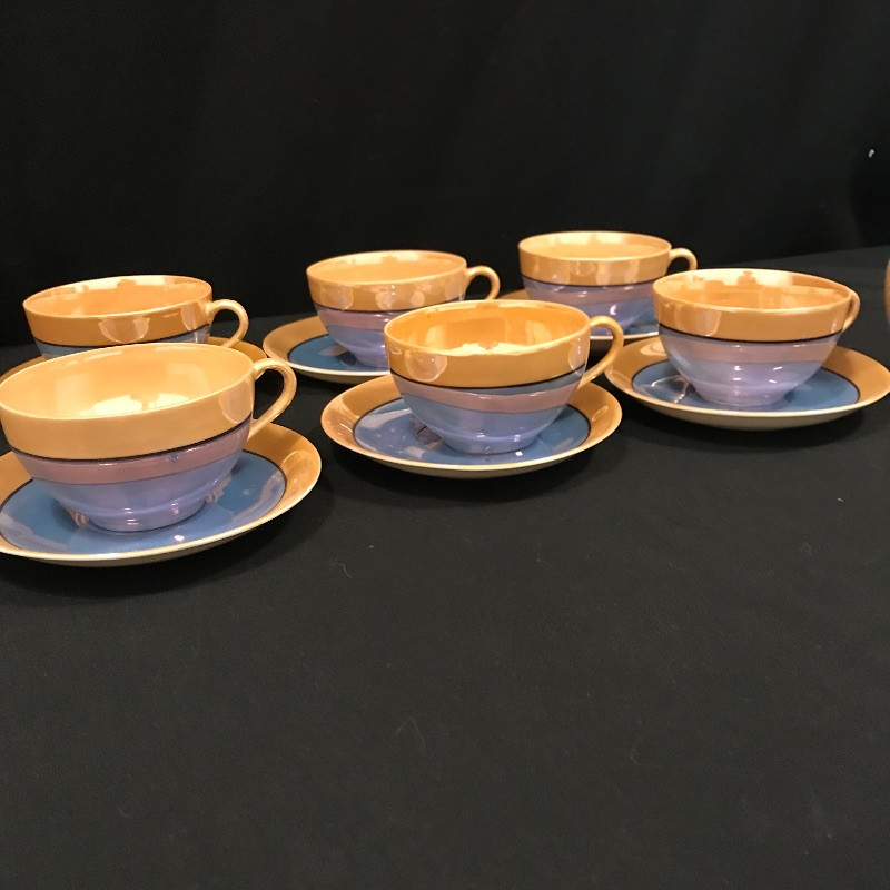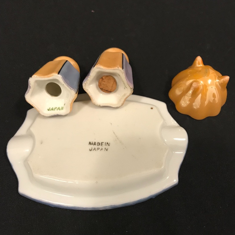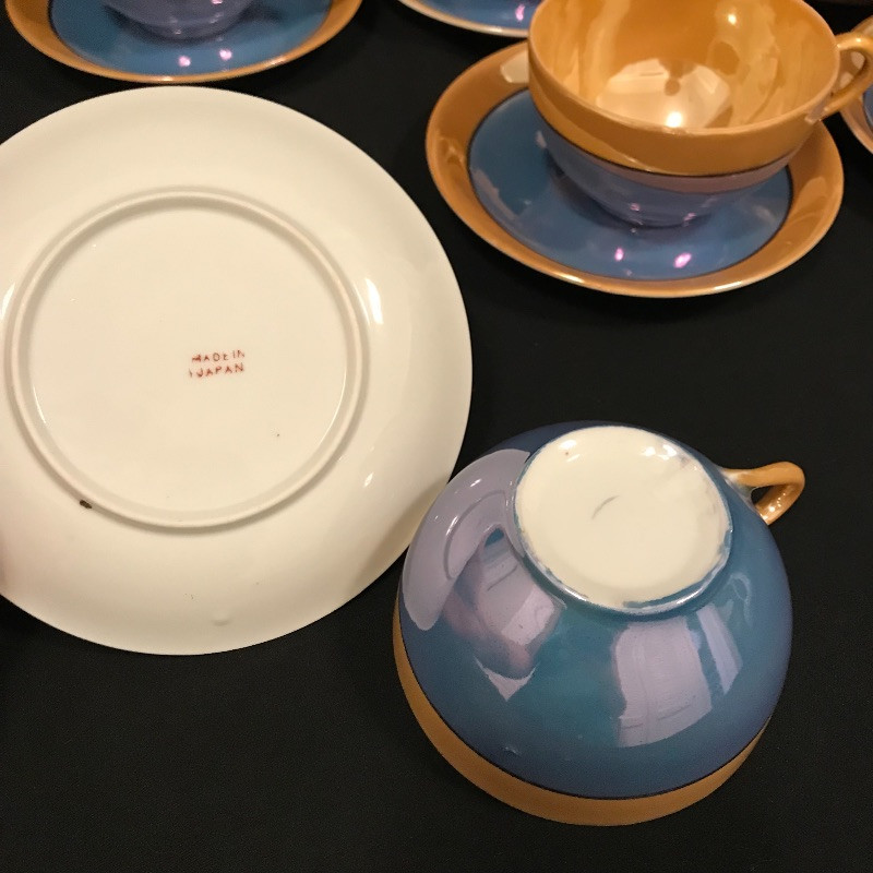 Lovely collection full of shiny peach, cornflower blue, and periwinkles. Six teacups and saucers along with a Noritake sugar bowl complete with spoon, saucer and lid. A demitasse collection with a tray, salt and pepper and a tiny bowl. Lastly a conversation starting blue bird dish. Some of the saucers have spots of wear in the blue coloring. All four salt and pepper shakers are filled through a small hole in the base. One demitasse shaker is missing its cork, see images. Shipping available.