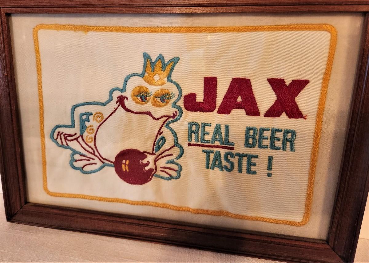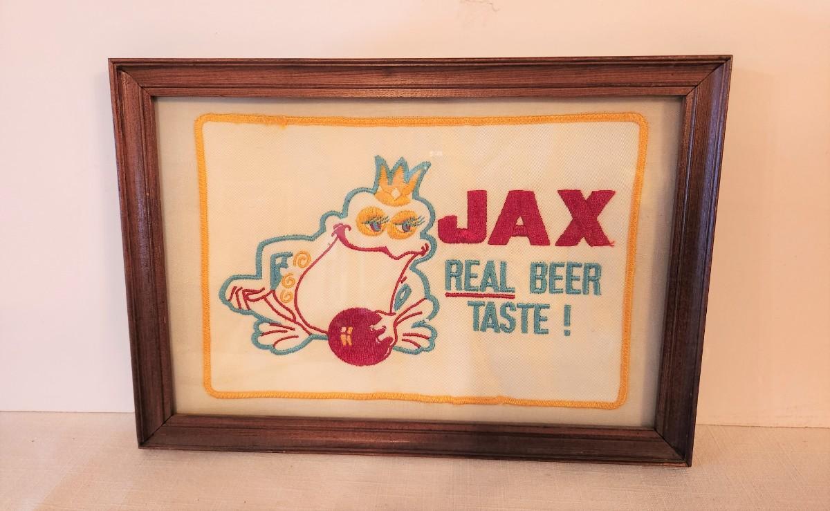 Framed vintage JAX Beer Bowling Shirt Patch - 13" across, 9" tall.