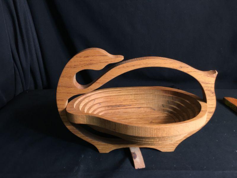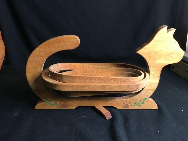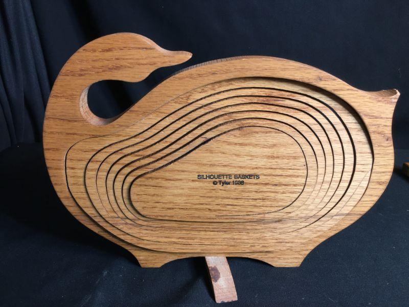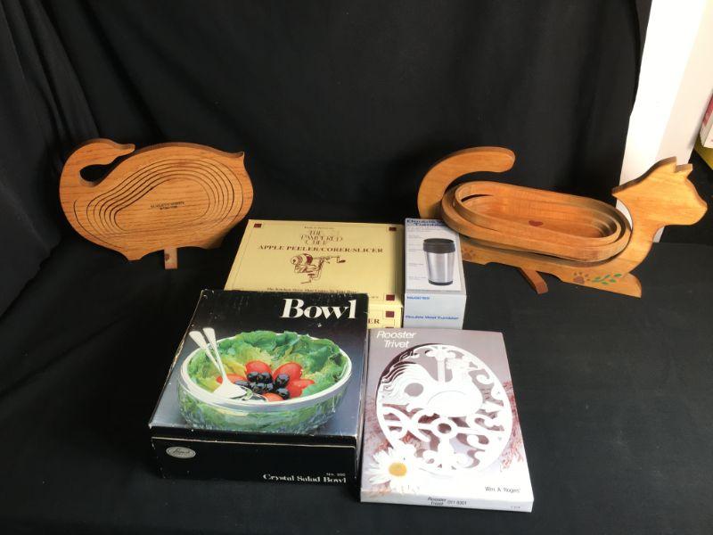 Kitchen Utensils/Appliances Lot, 6 pieces, Wm. Rogers silver plate tarnish resistant Rooster trivit Two wood baskets designed to lie flat for storage and a Travel Tumbler. All are preowned but never used.