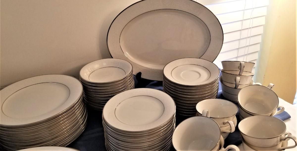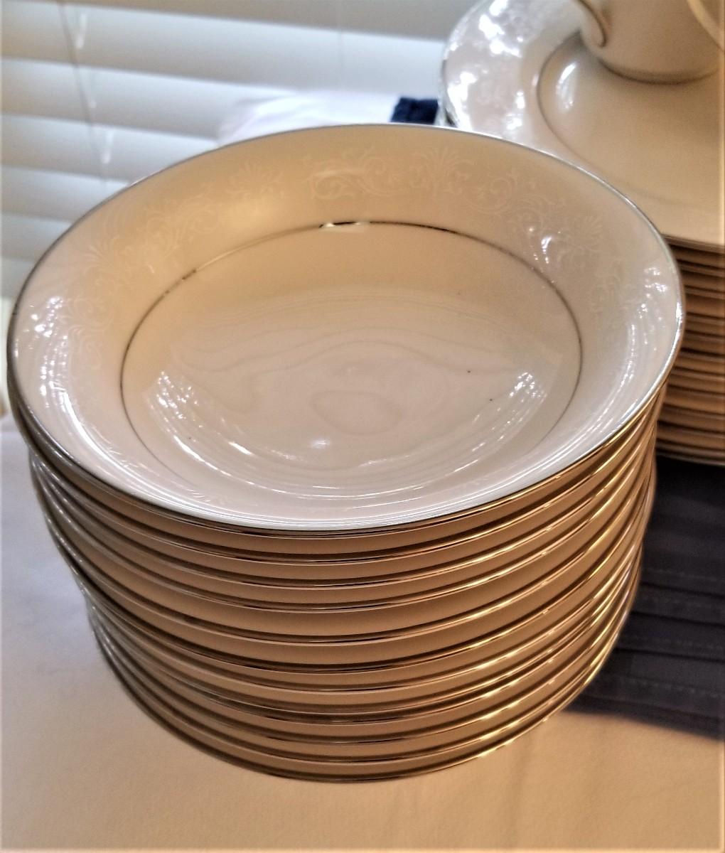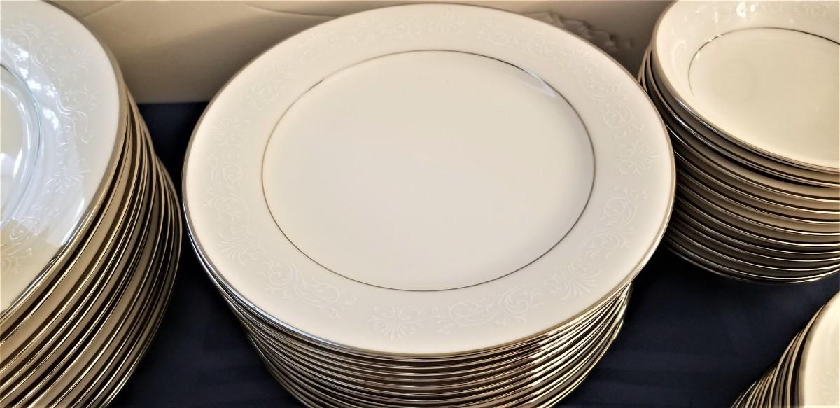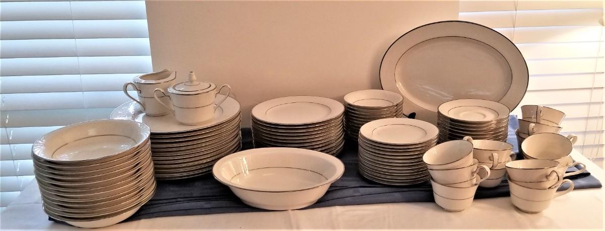 You get all you see here - 12 cup/saucers, 1 platter, 13 bread/butter plates, 12 small bowls, 1 vegetable bowl, 12 salad plates, cream/sugar, 12 soup bowls, 12 dinner plates (each 10.25" across). All gently used - very pretty with a platinum rim. A classic set that would not look out of place on today's table. Ivory in color with a white scroll pattern around the rim. Set made 1966 - 1981 - now discontinued.