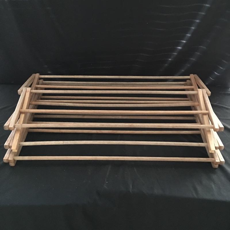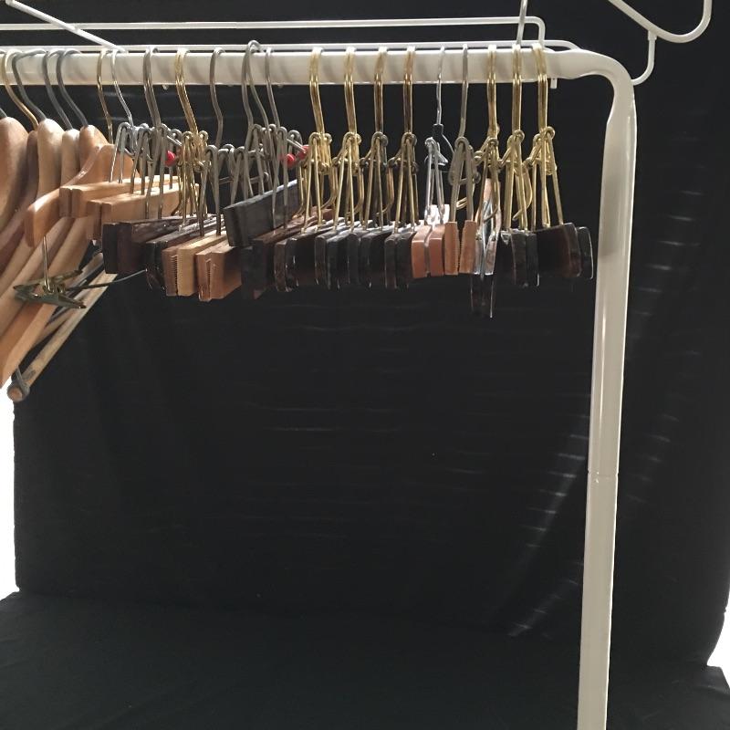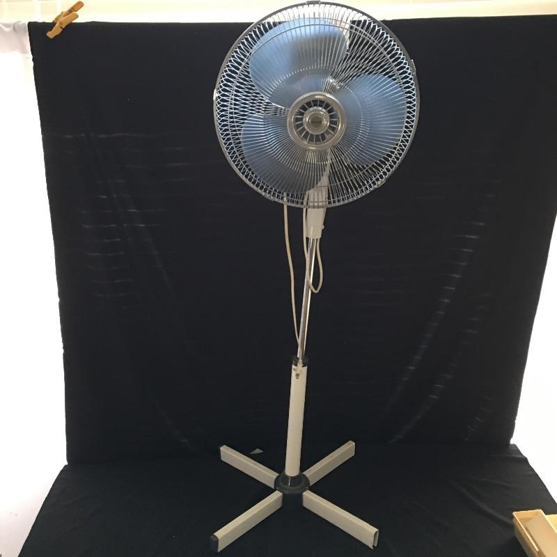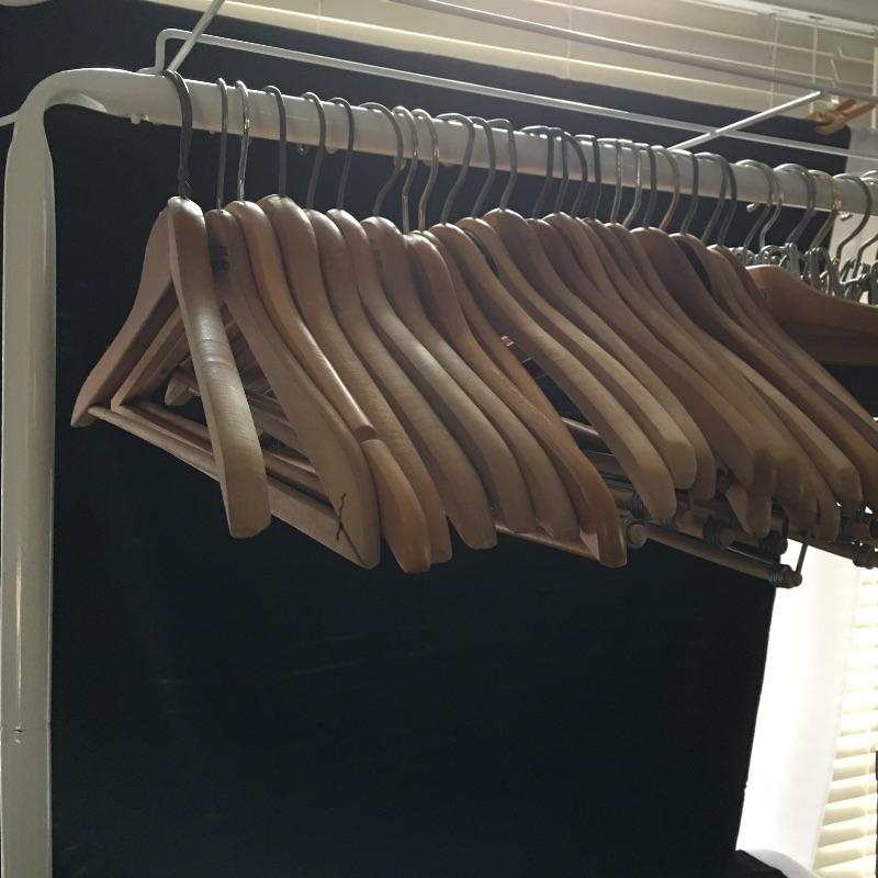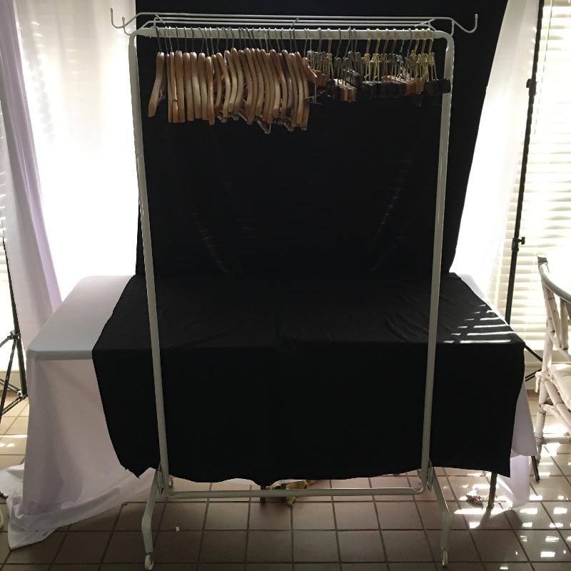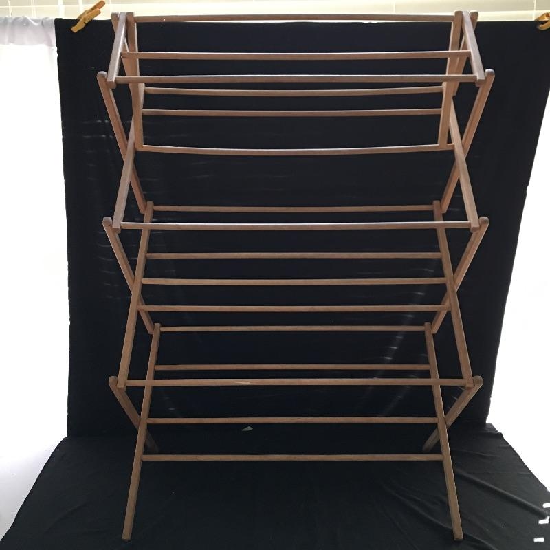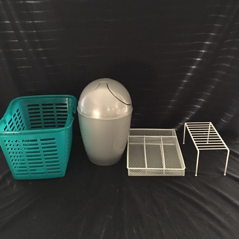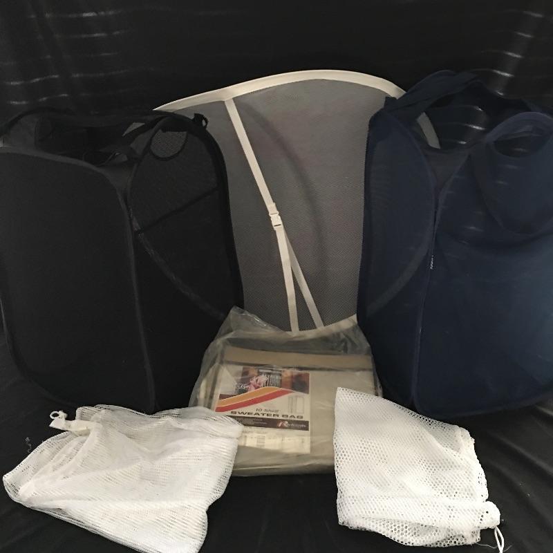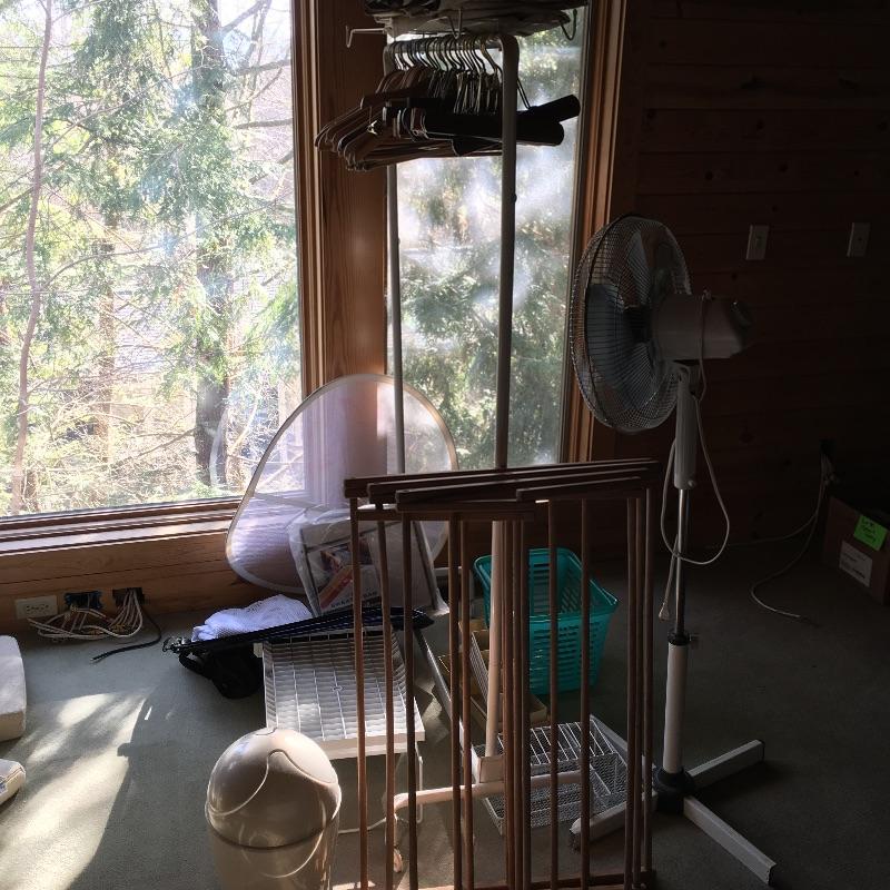 Laundry essentials and more. Lot includes clothes rack on wheels with wooden hangers, oscillating floor fan, drying rack, clothing bags, folding hampers and more. Rolling rack measures 18” x 40” x 68”.