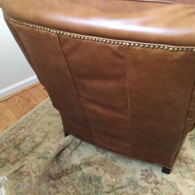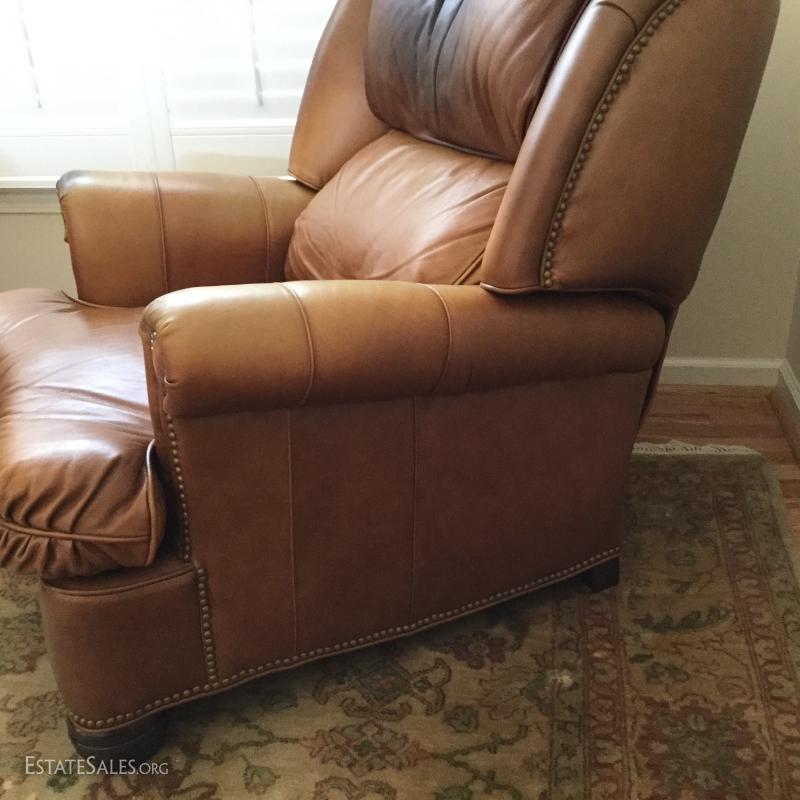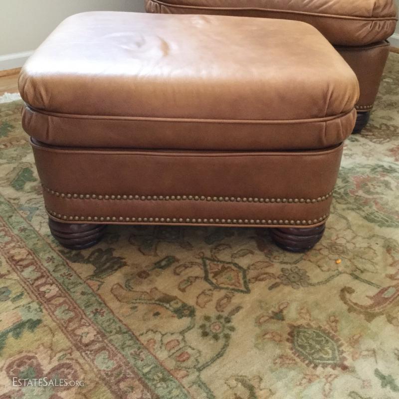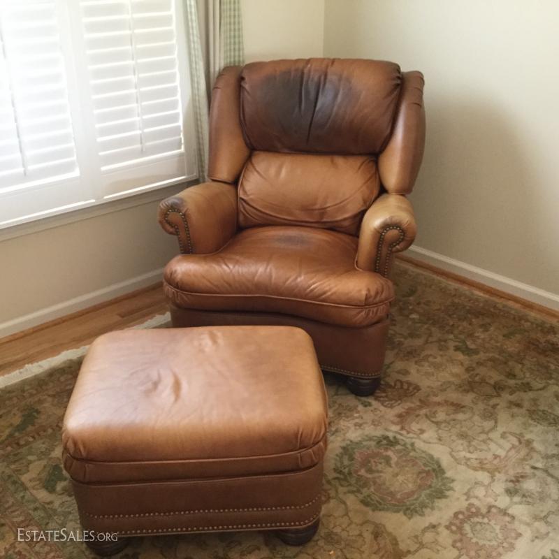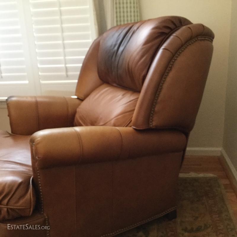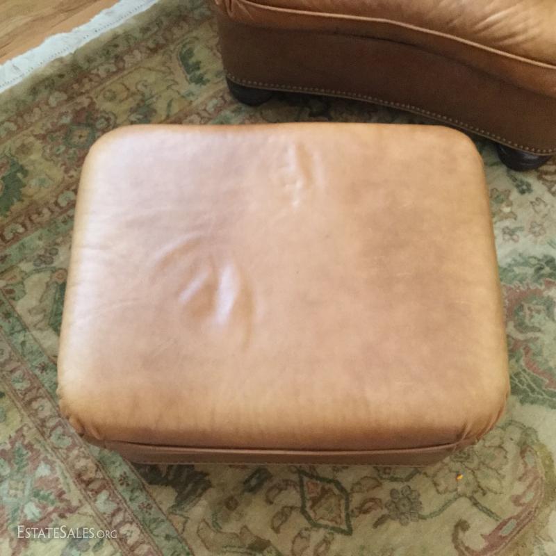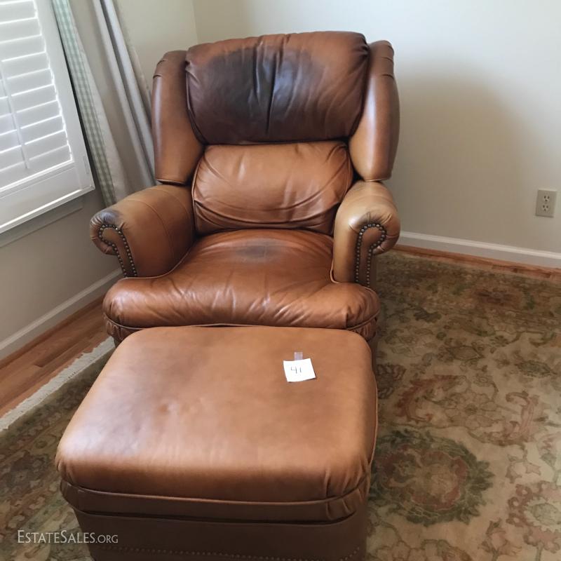 Carmel colored leather recliner 44"l x 35"w x 39"h with matching ottoman 25"l x 21"w x 16"h. Some wear on headrest that could possibly be cleaned with leather cleaner. Matches chair in lot 42. See photos.