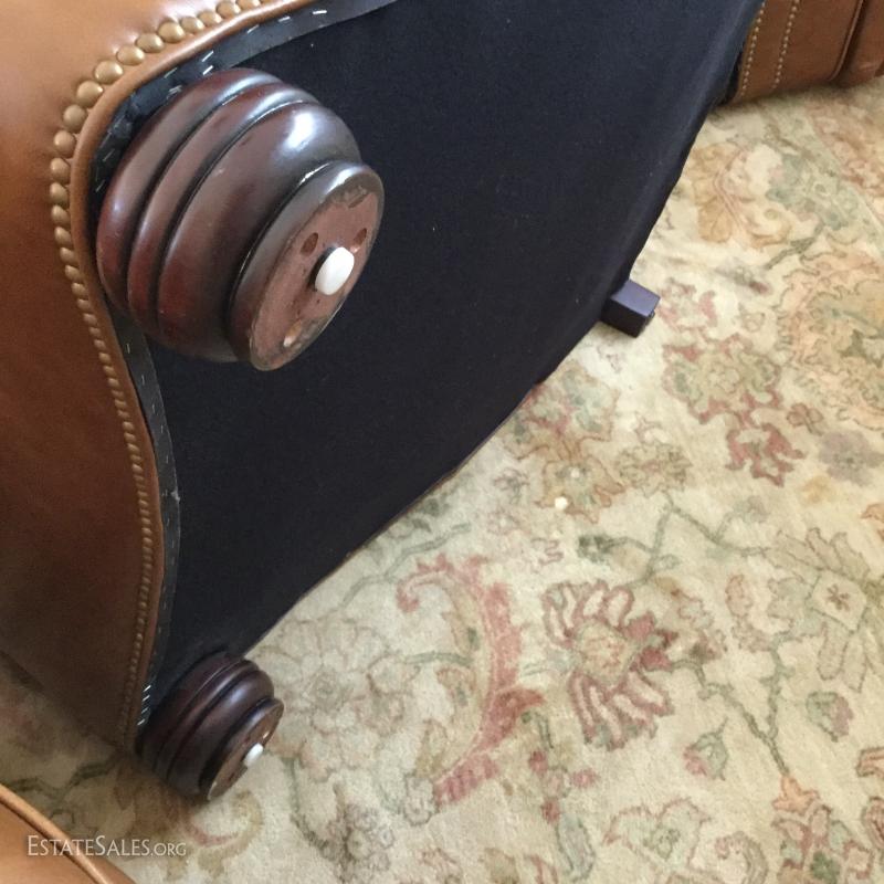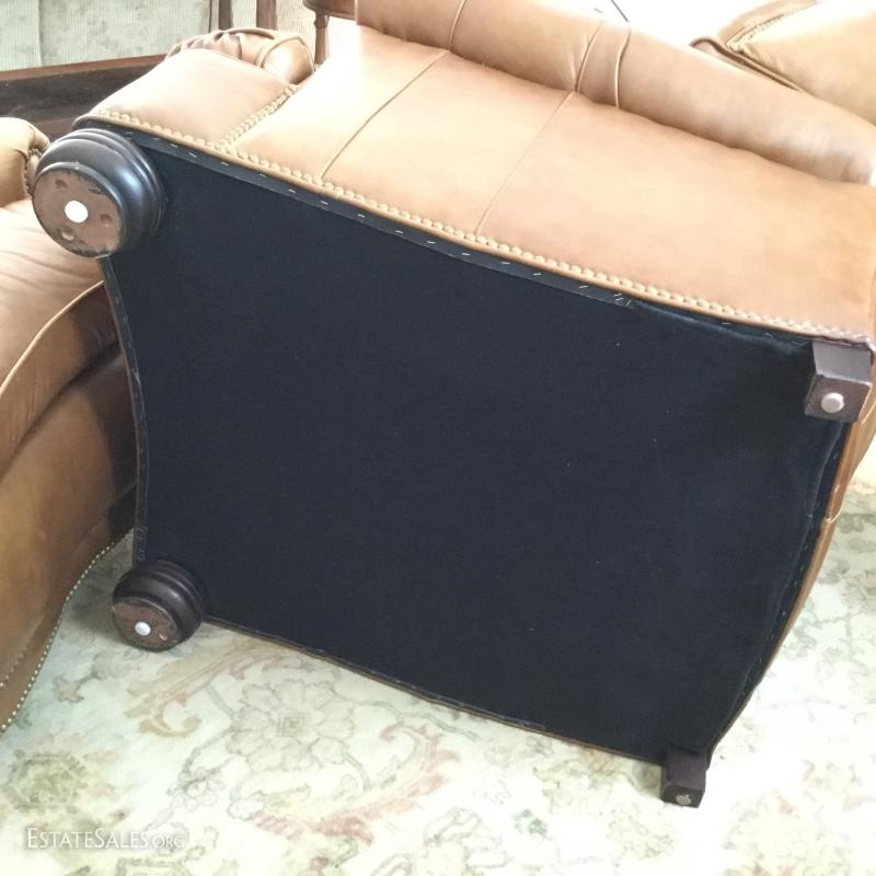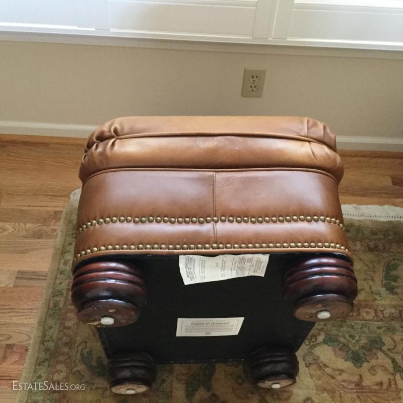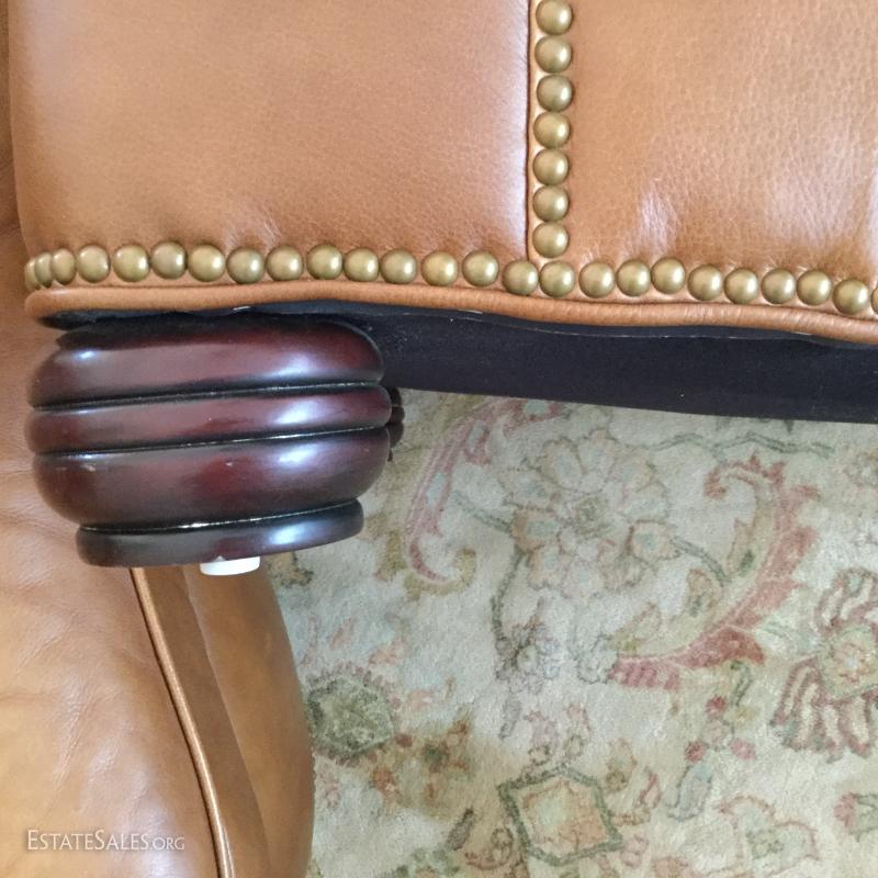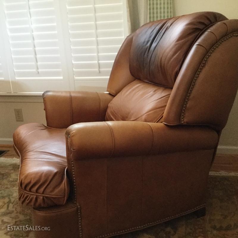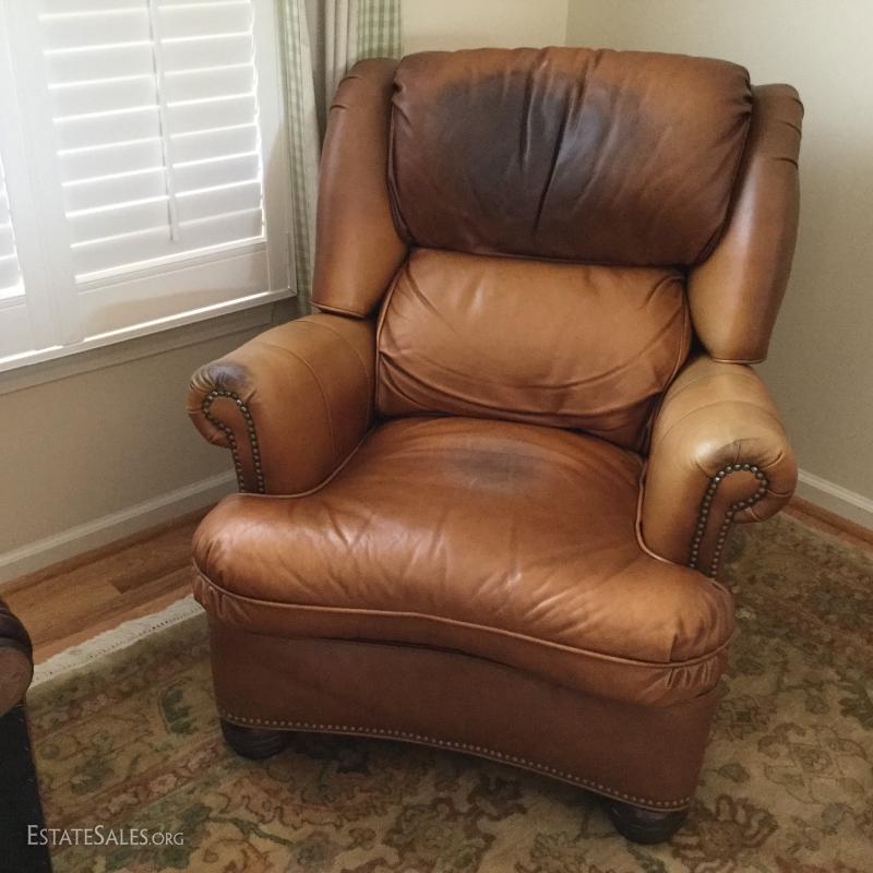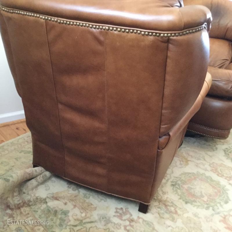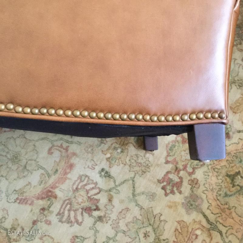 Carmel colored leather recliner 44"l x 35"w x 39"h with matching ottoman 25"l x 21"w x 16"h. Some wear on headrest that could possibly be cleaned with leather cleaner. Matches chair in lot 42. See photos.