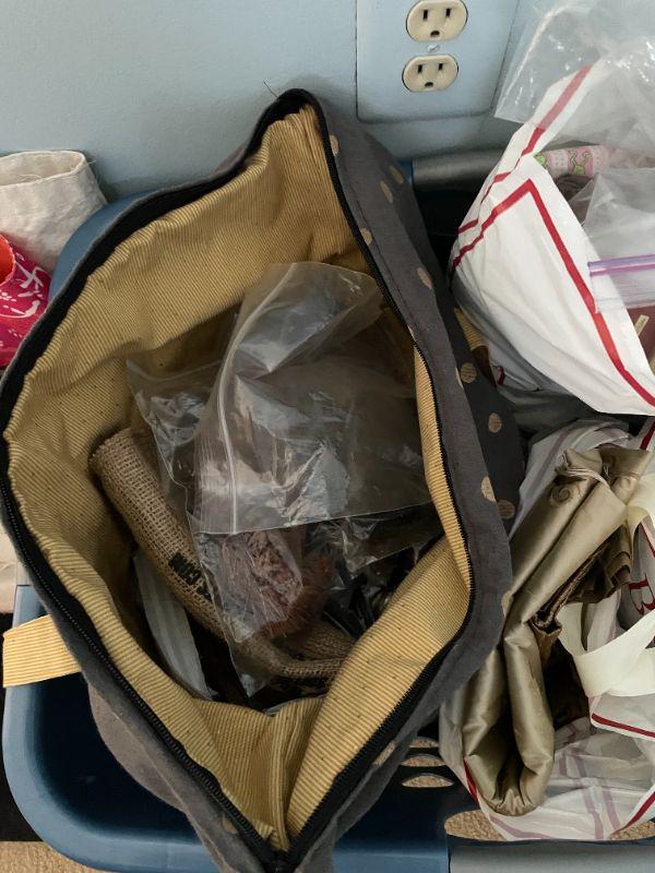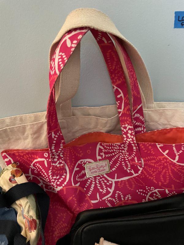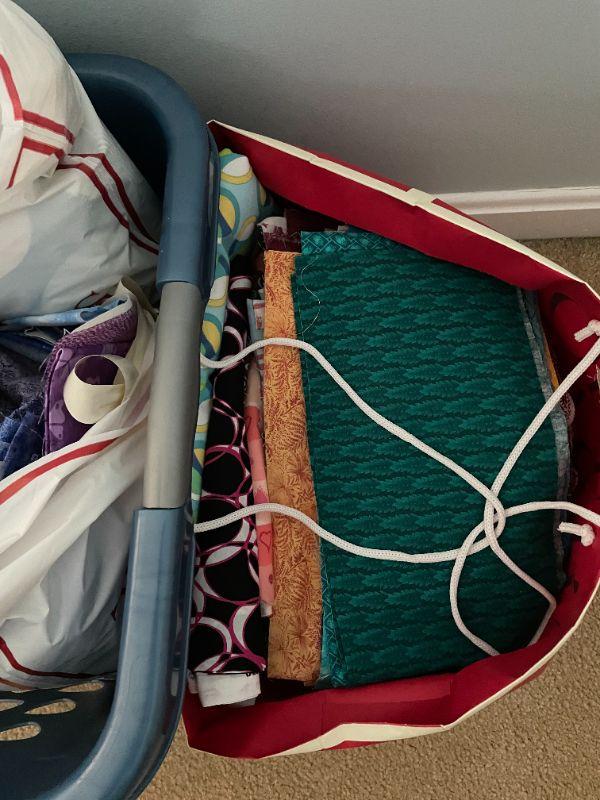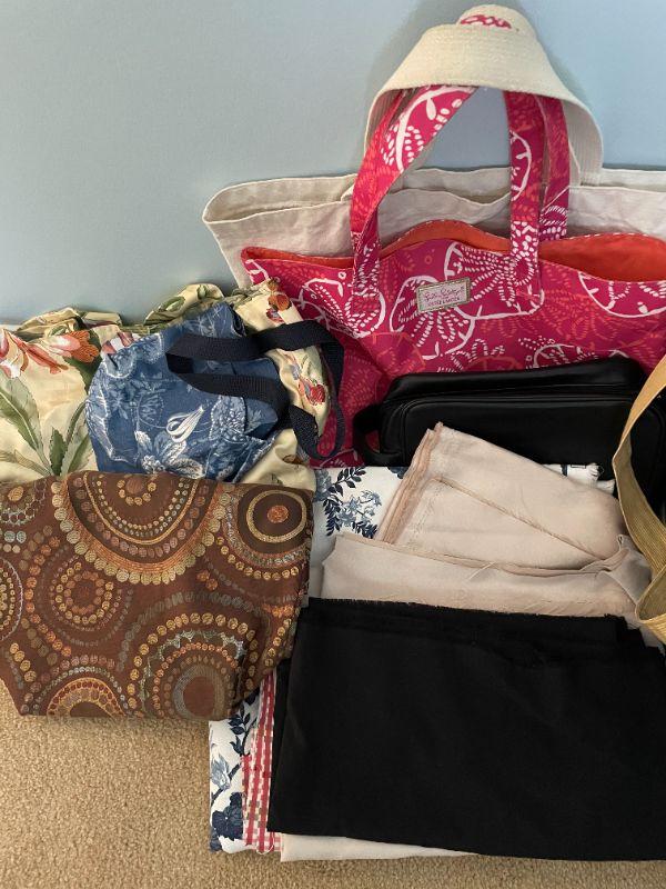 Misc. bags, lots of fabrics, laundry basket, Lilly Pulitzer purse, crafts supplies.
