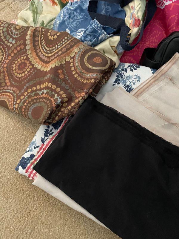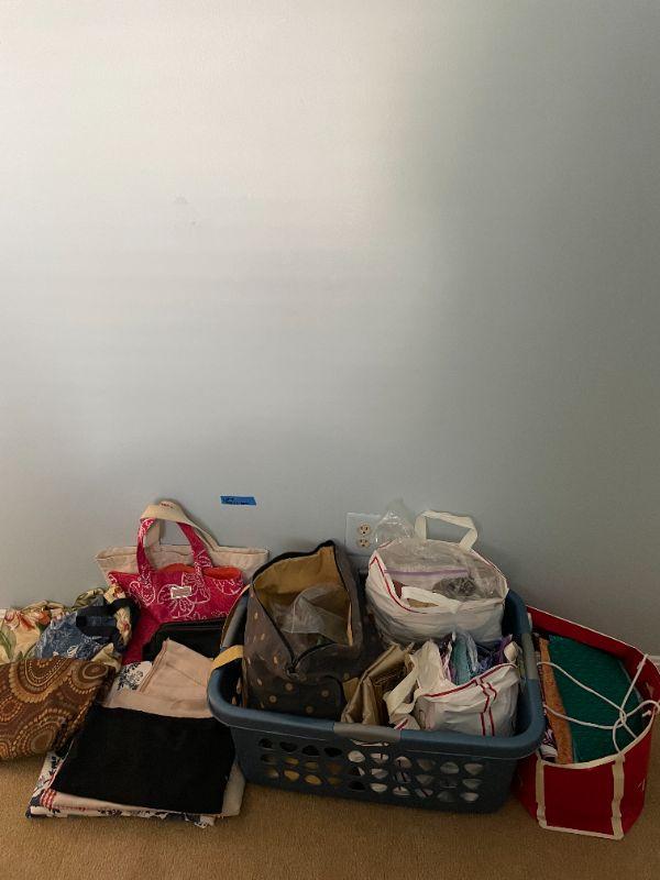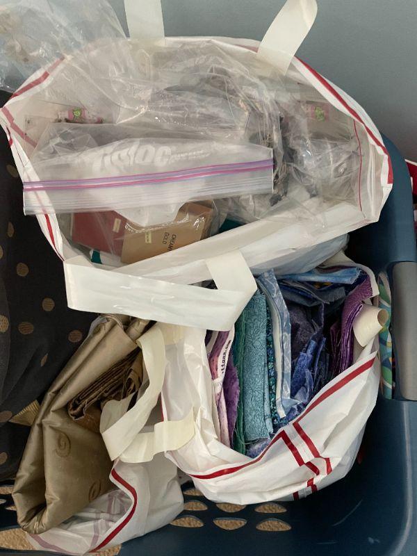 Lot 41 - Misc. bags, lots of fabrics, laundry basket