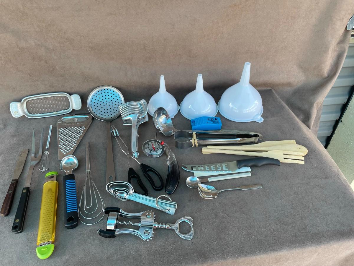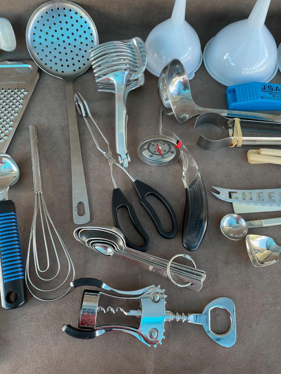 Large array of utensils: wooden servers, wine bottle opener, grater, strainer, whisk, measuring spoons, butter cutter, and more.