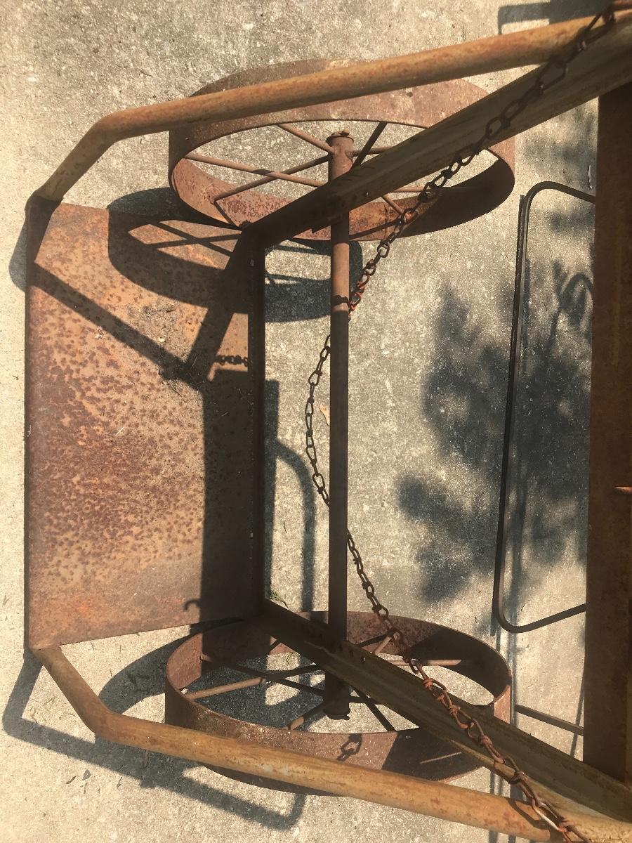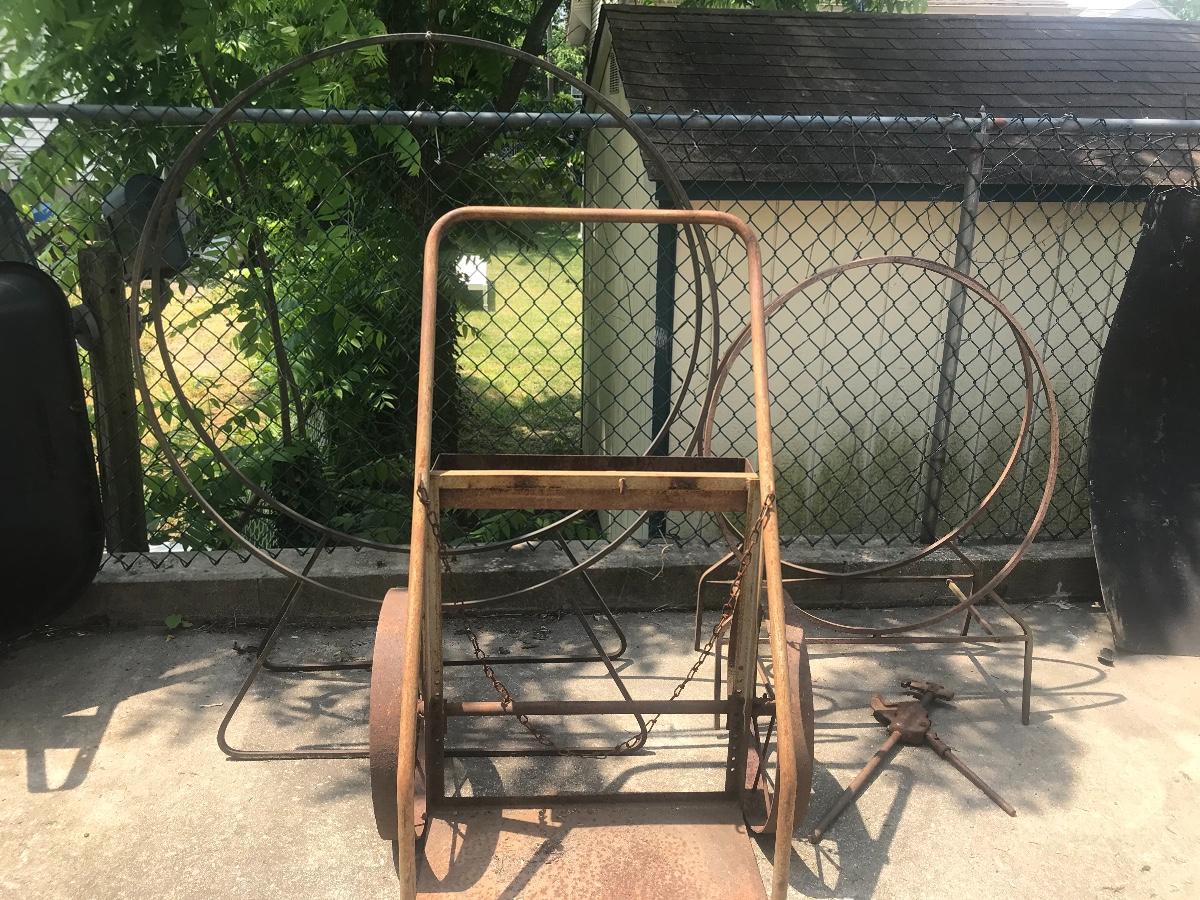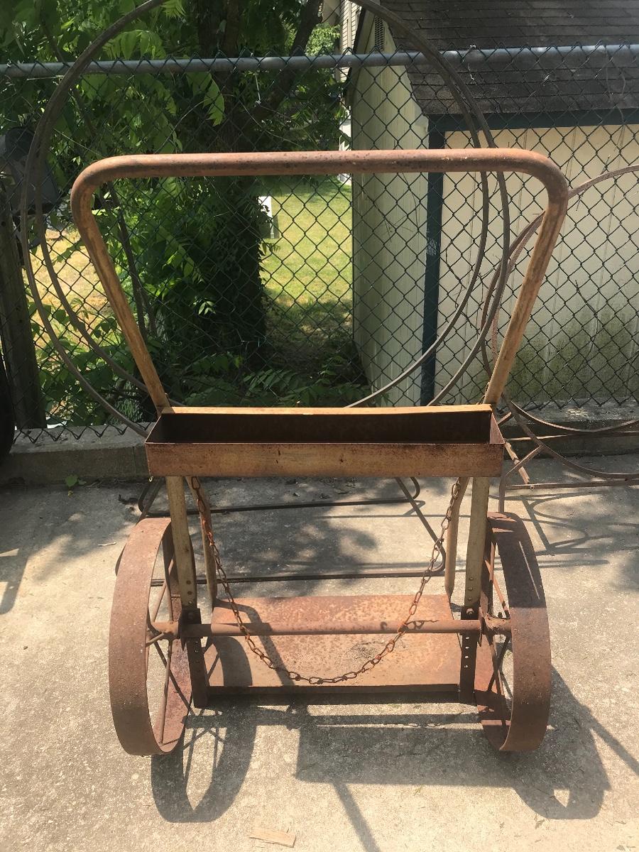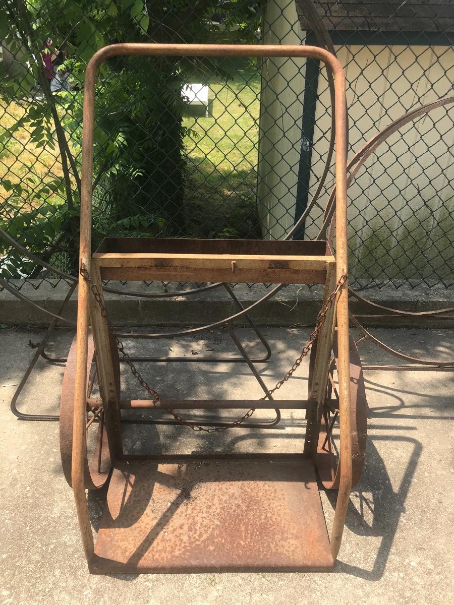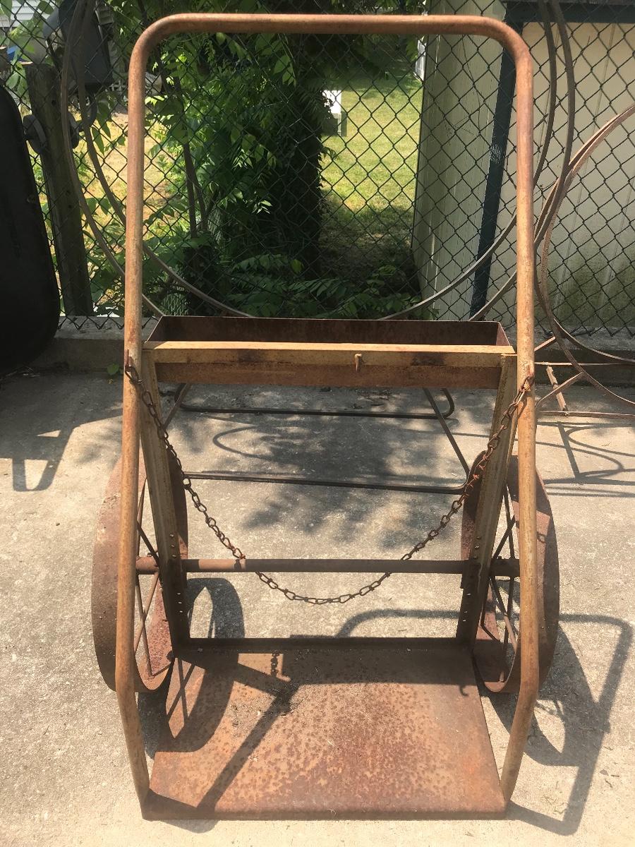 Two log rings, a car jack, and a cart for propane tanks, 29x23x46, that would make a nice planter stand. Please see all pictures for content of the lot, condition of the lot, and measurements if taken. Pictures are the best representation of the items listed and items are untested unless indicated in description. Thank you for looking and have fun bidding!
