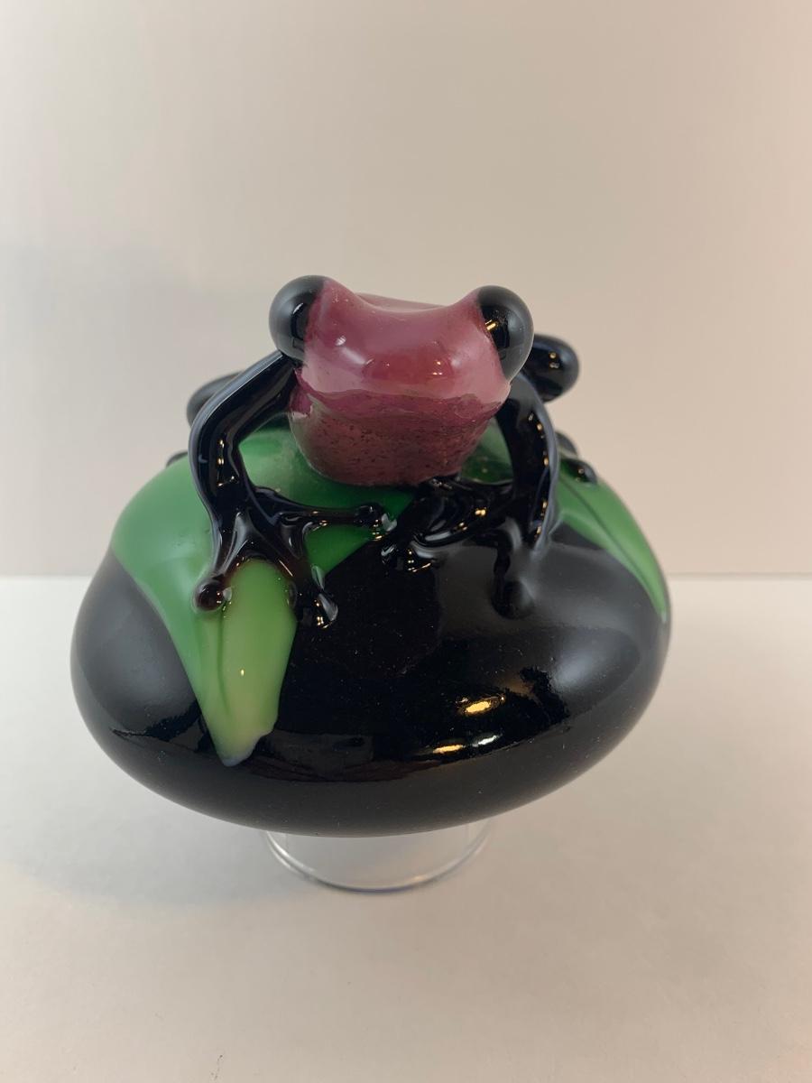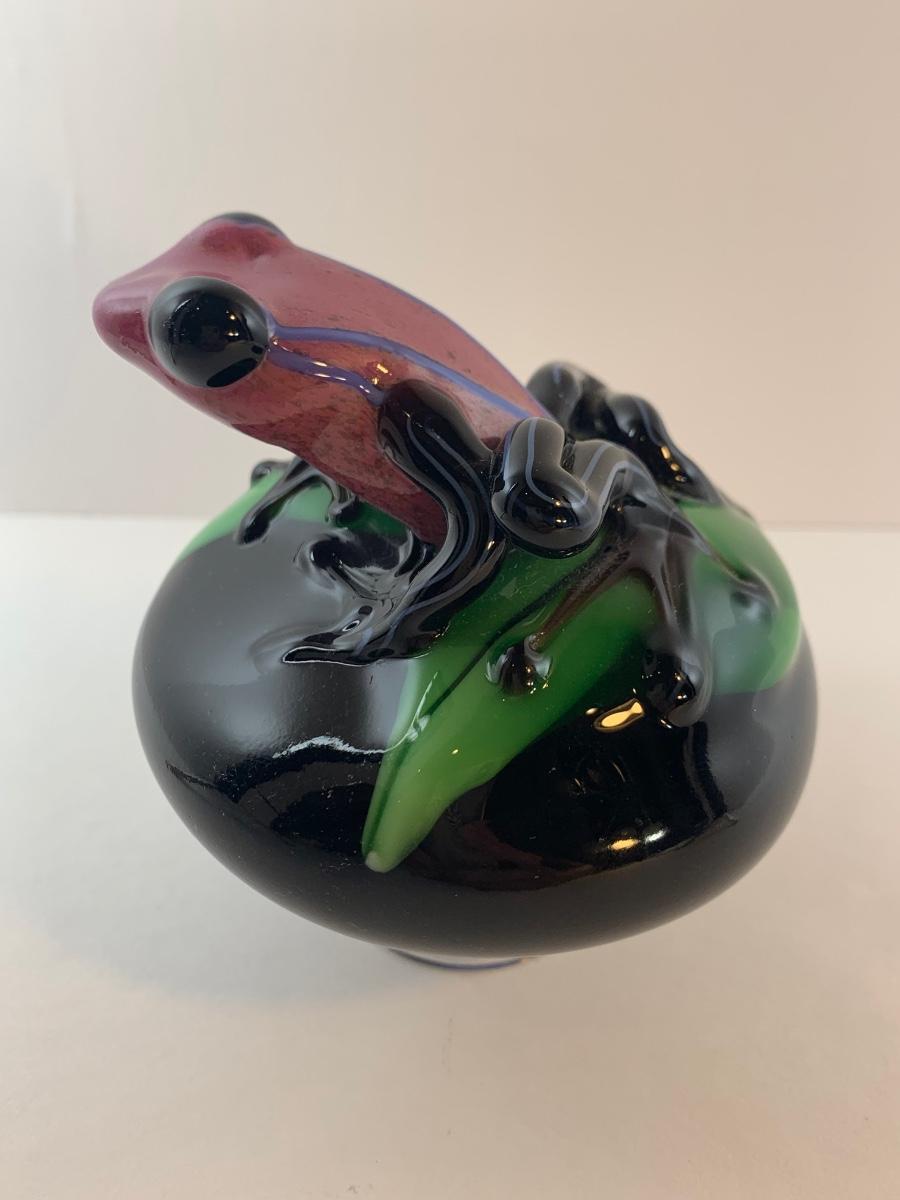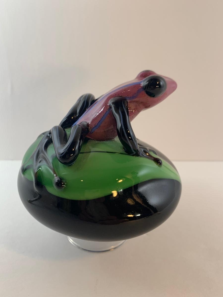 Vintage Orient and Flume Poison Frog designed by David Smallhouse. Features pink frog sitting atop a lily pad. Signed on bottom "Smallhouse Orient & Flume 134/1000 0788LX2208P". Last series of numbers is registration number, 3 1/2" x 2 3/4"