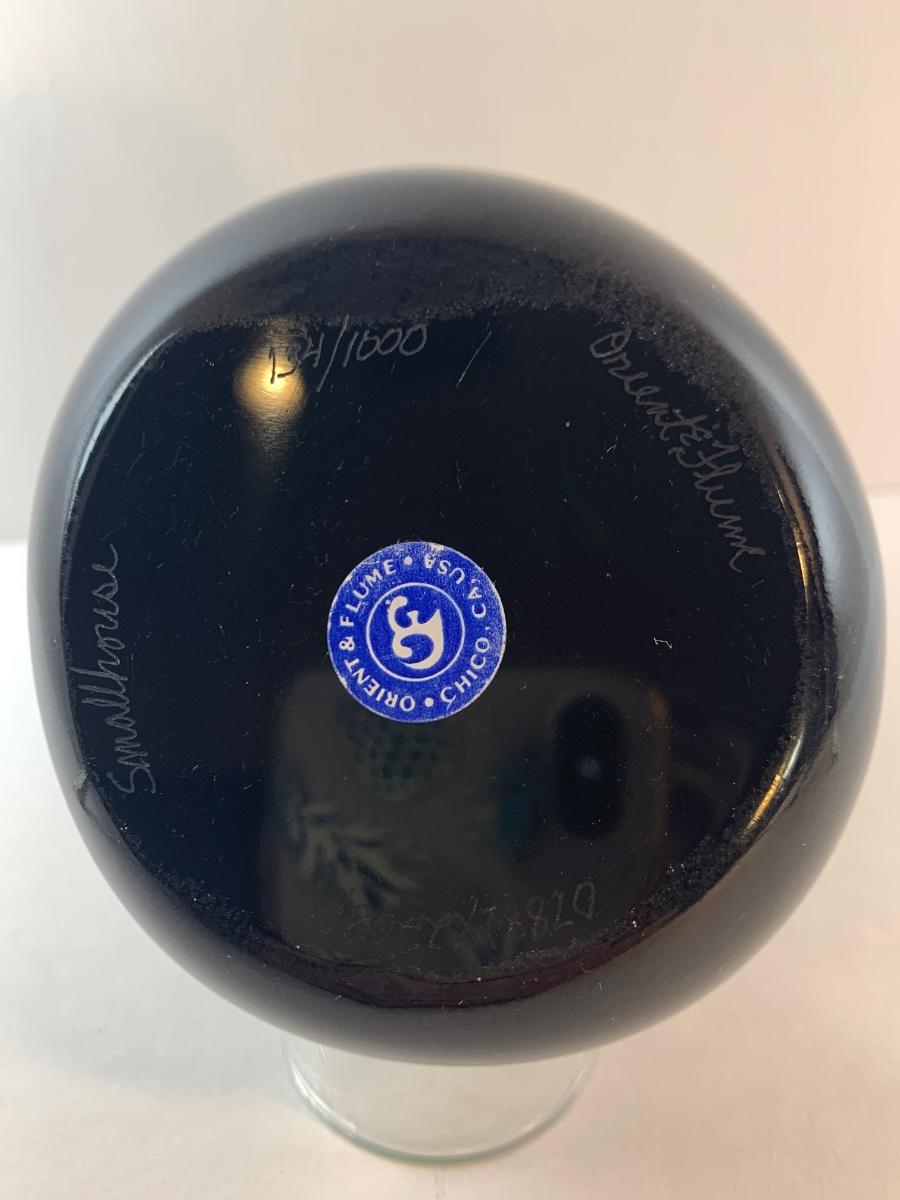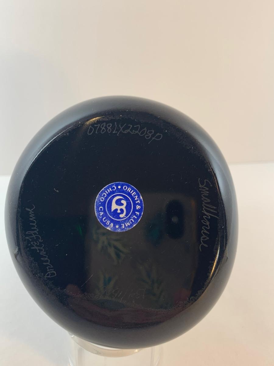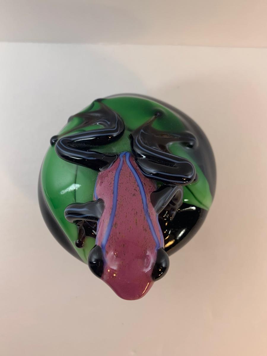 Vintage Orient and Flume Poison Frog designed by David Smallhouse. Features pink frog sitting atop a lily pad. Signed on bottom "Smallhouse Orient & Flume 134/1000 0788LX2208P". Last series of numbers is registration number, 3 1/2" x 2 3/4"
