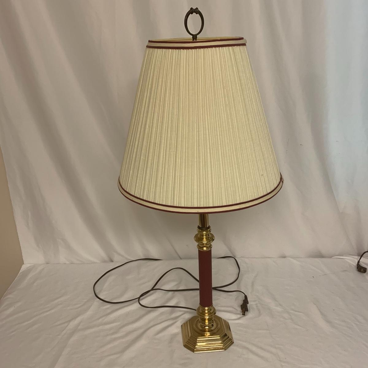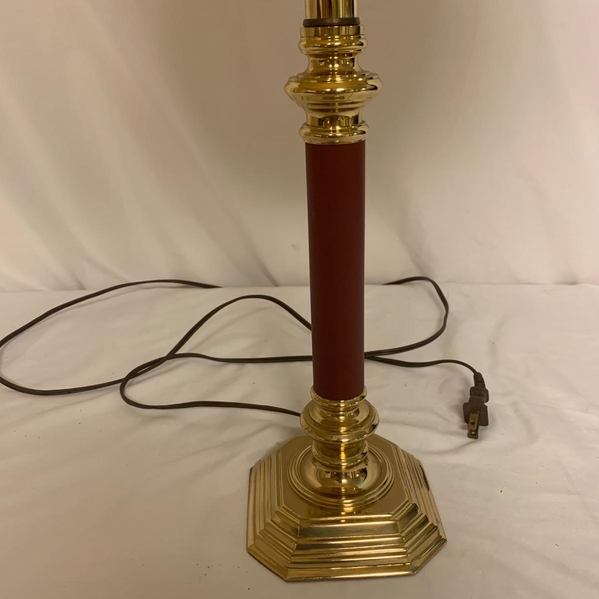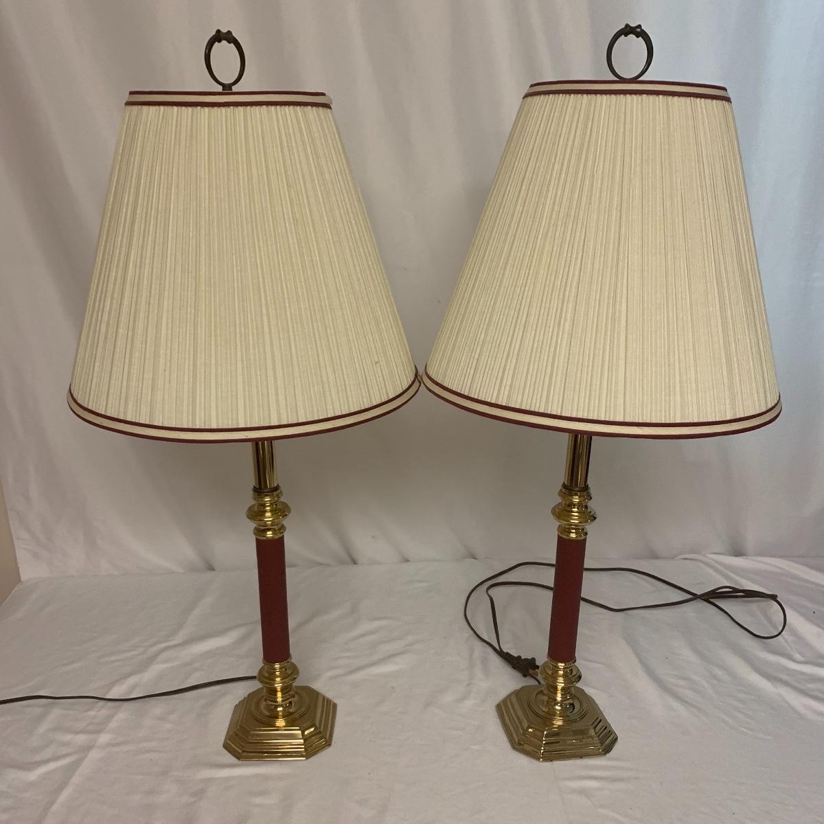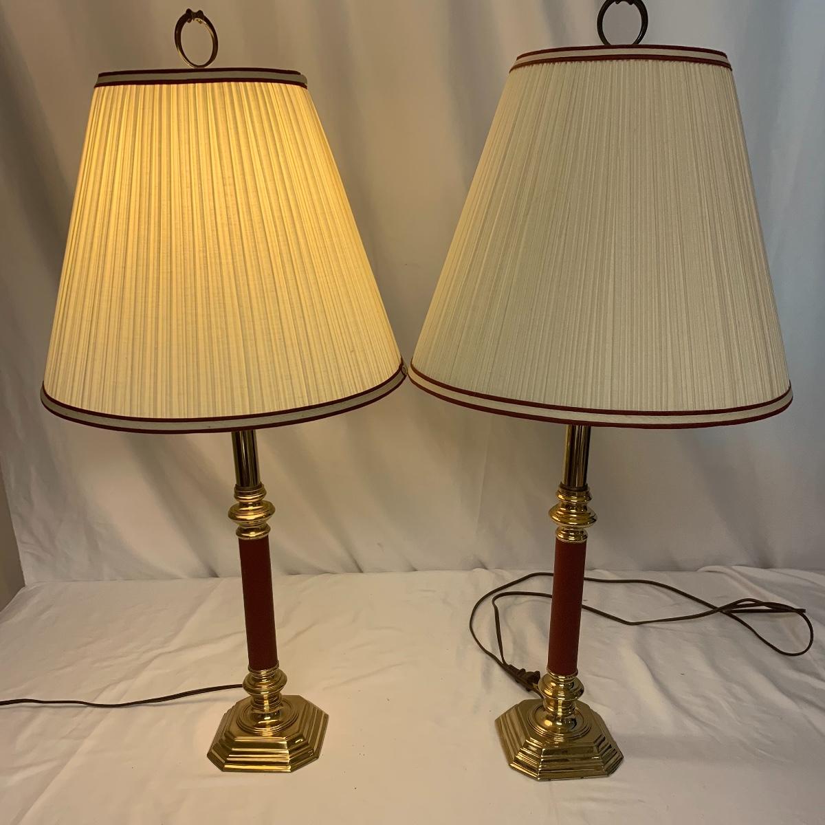 This lot includes a pair of brass lamps with lamp shades. Both lamps turn on when plugged in. They measure about 30in tall with lamp shade. Local pick up only.
