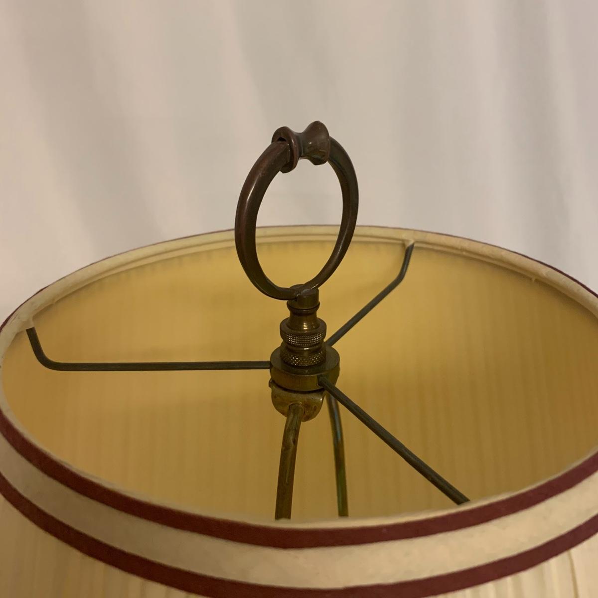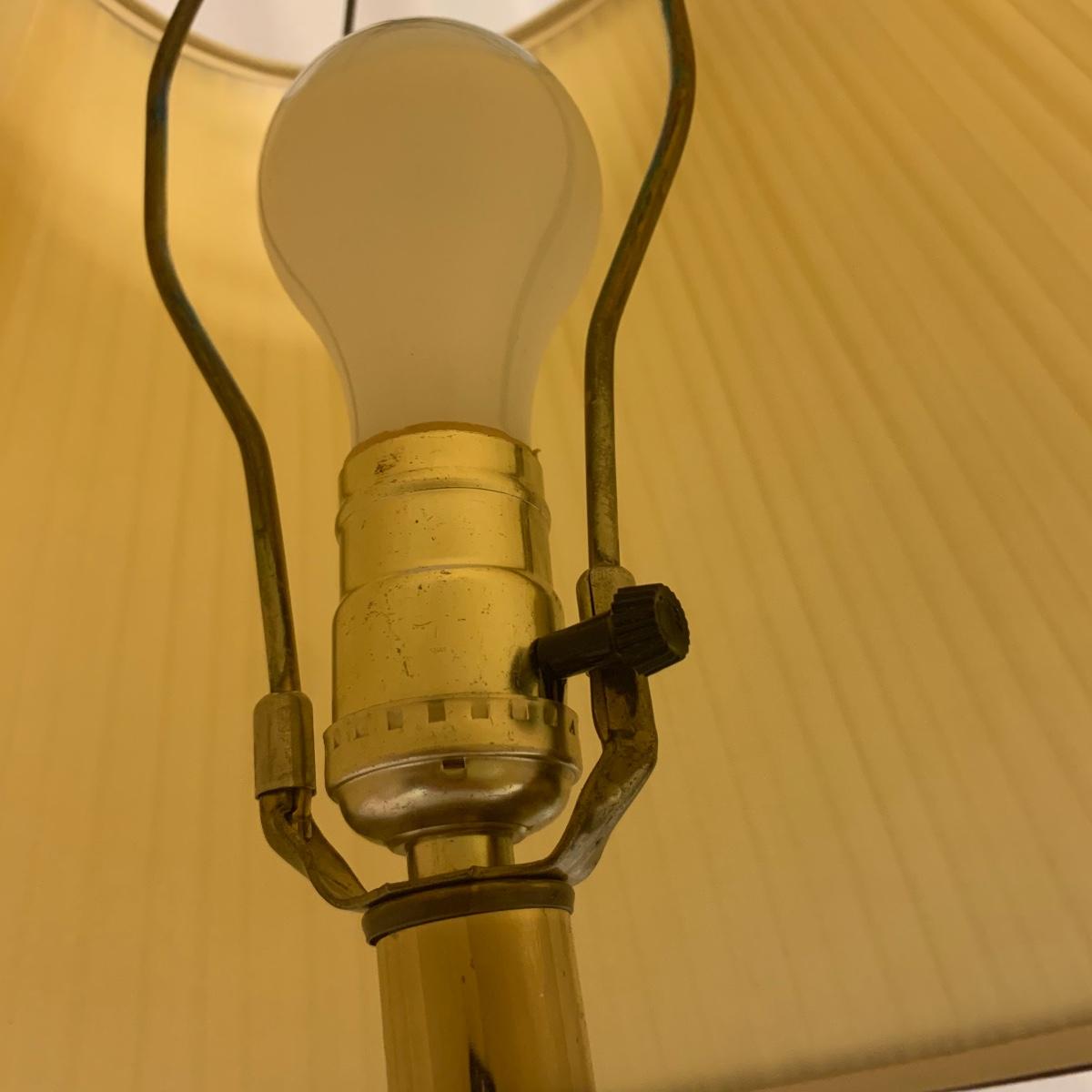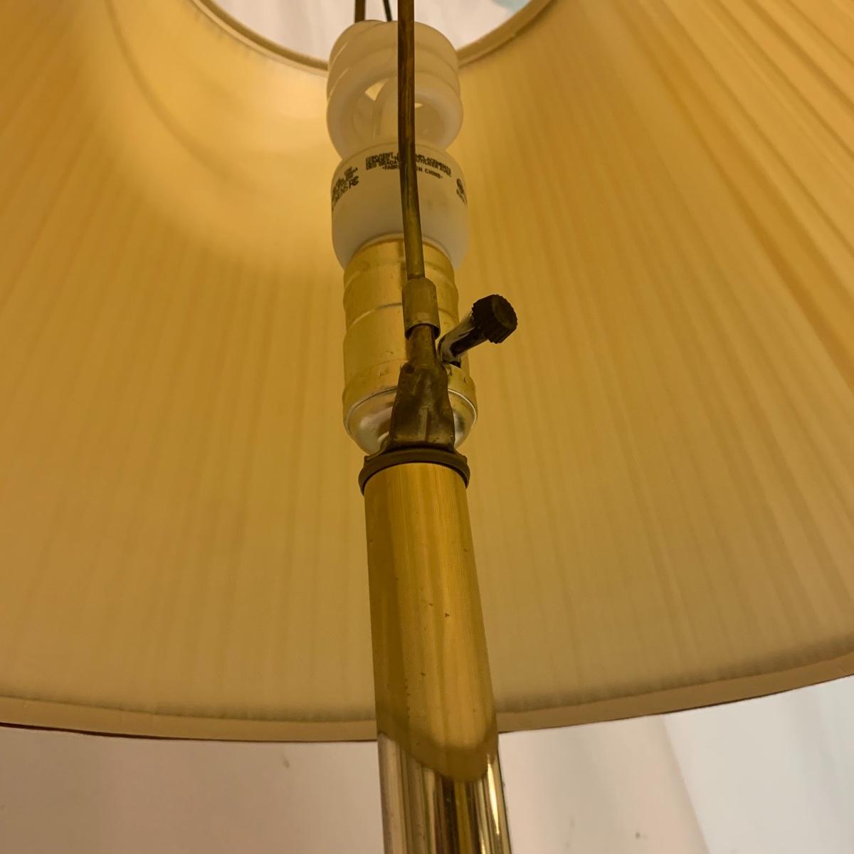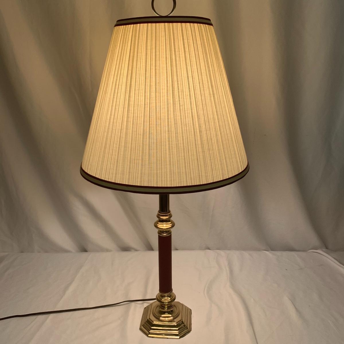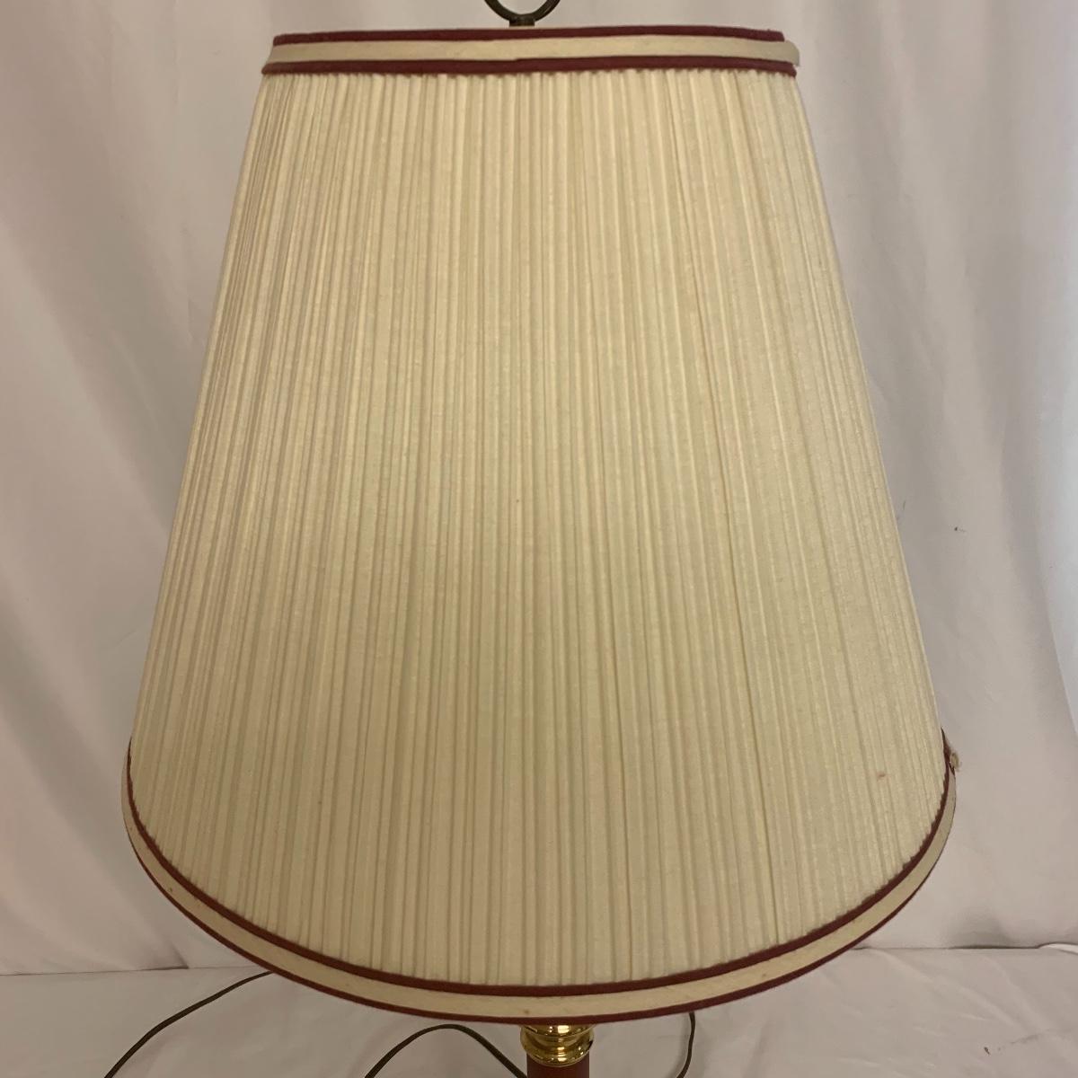 This lot includes a pair of brass lamps with lamp shades. Both lamps turn on when plugged in. They measure about 30in tall with lamp shade. Local pick up only.