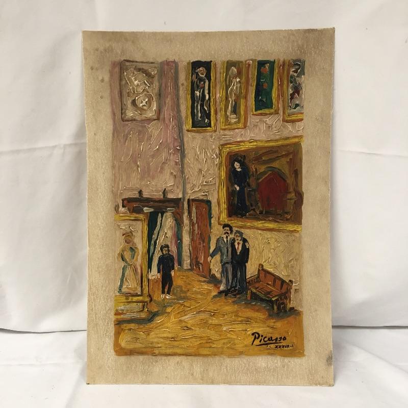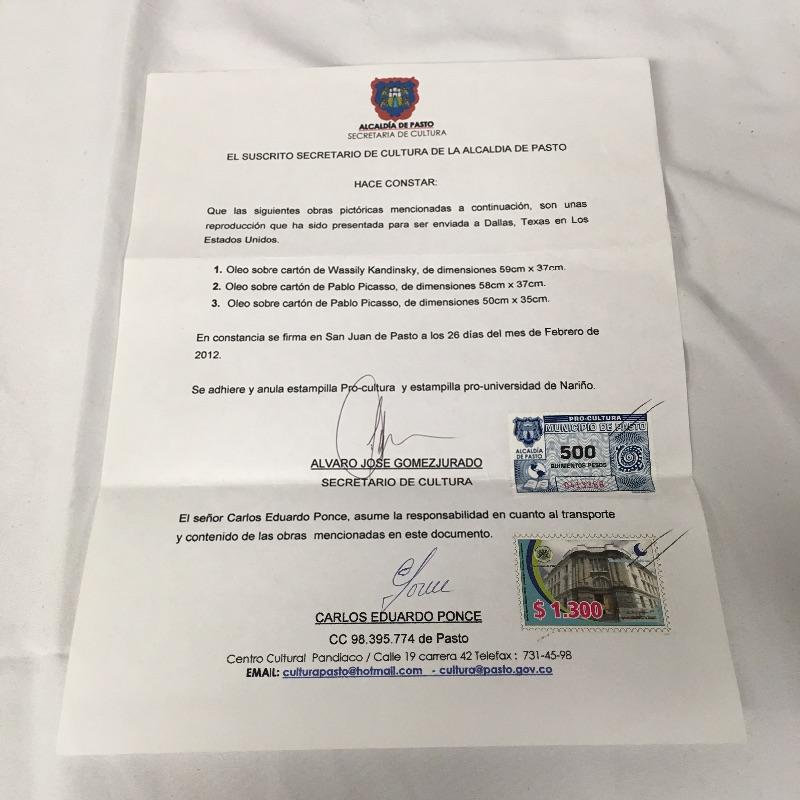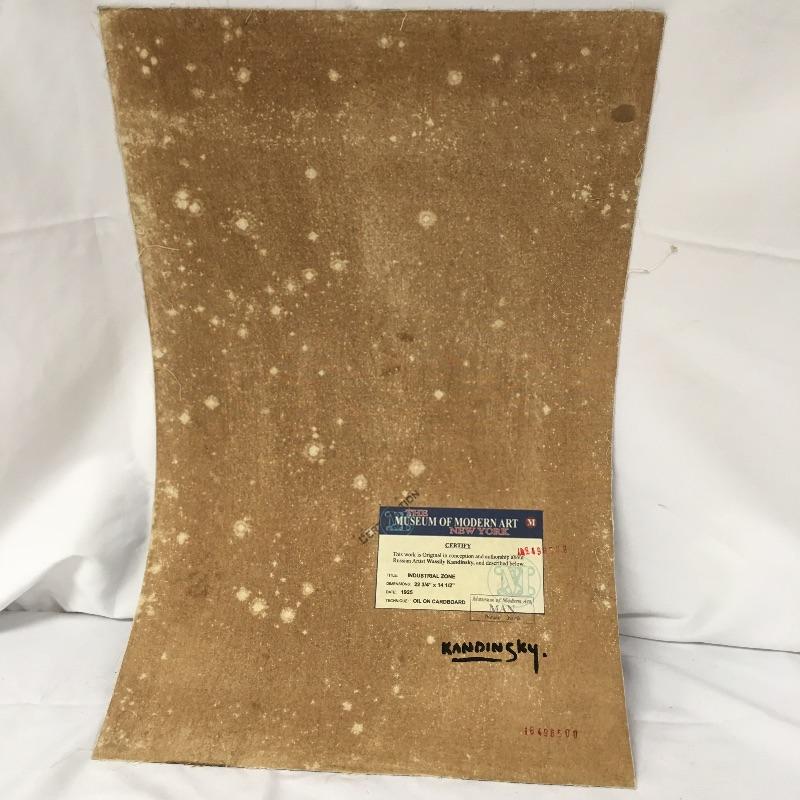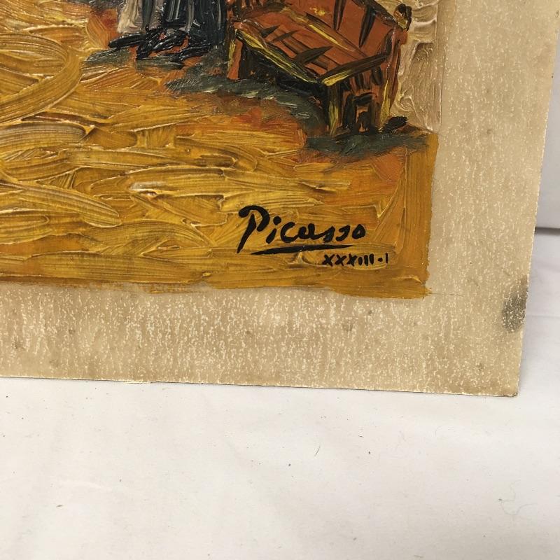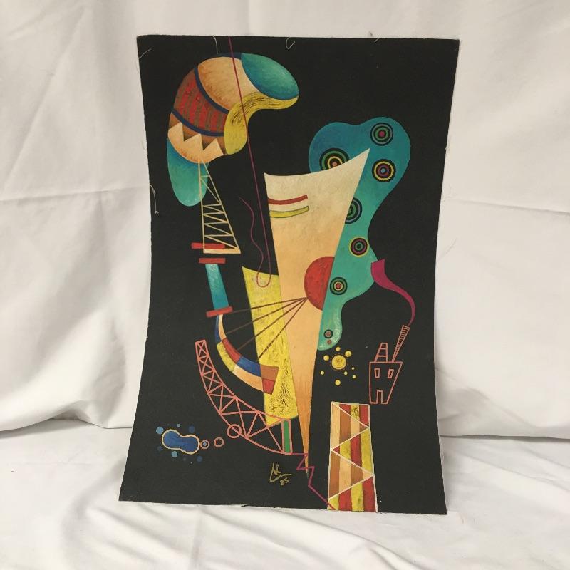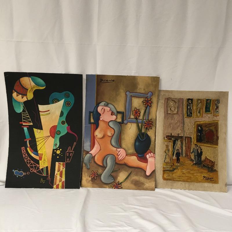 This lot includes two paintings in the style of Picasso that are unframed and stamped from the Casa Museo de Sorolla. Lot also includes a piece in the style of Kandinsky with accompanying paperwork. Largest piece measures 14.5” x 23”.