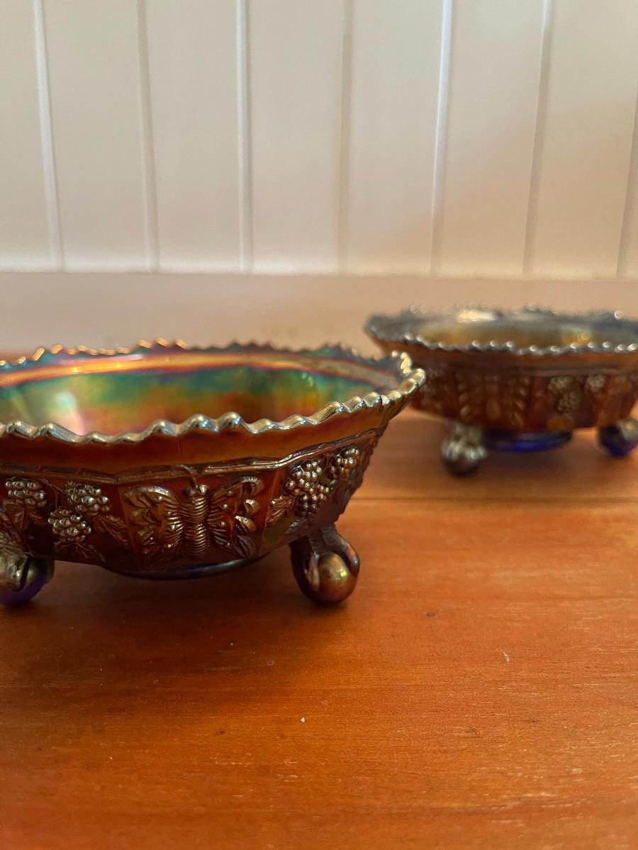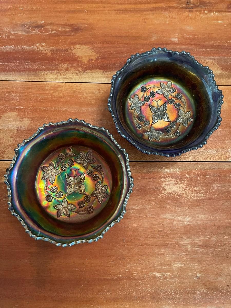 LOT 53 - Fenton Butterfly & Berry Carnival Glass, Small 3 Footed Berry Bowl, Set of 2