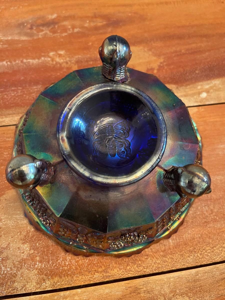 Fenton Butterfly and Berry Carnival Glass, Small 3-footed berry bowl with ball-and-claw feet and a scalloped sawtooth edge. The molded design features butterflies and clusters of berries on alternating panels on the exterior. A single butterfly sits in the center of the interior, surrounded by a garland of berries and leaves. Introduced around 1911.