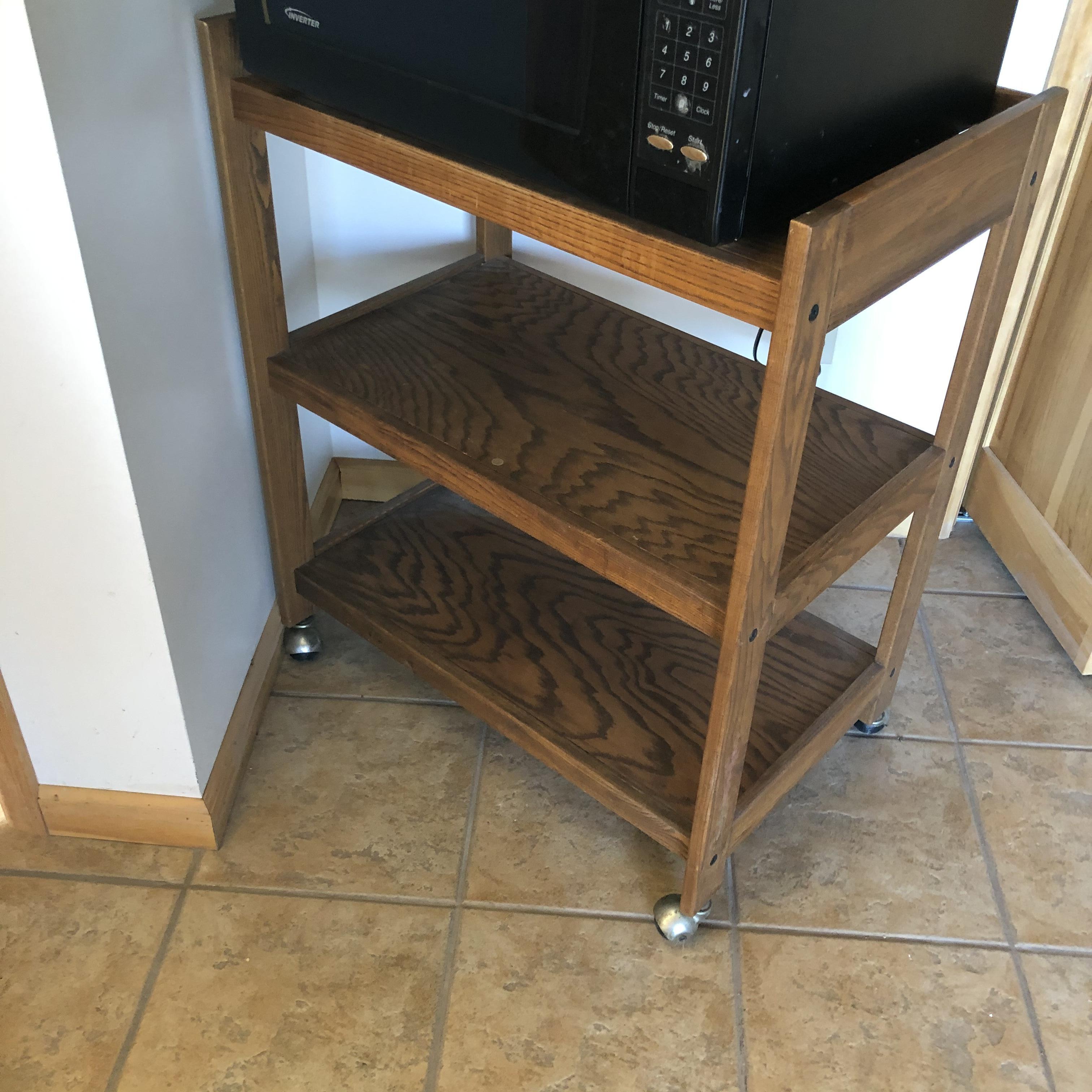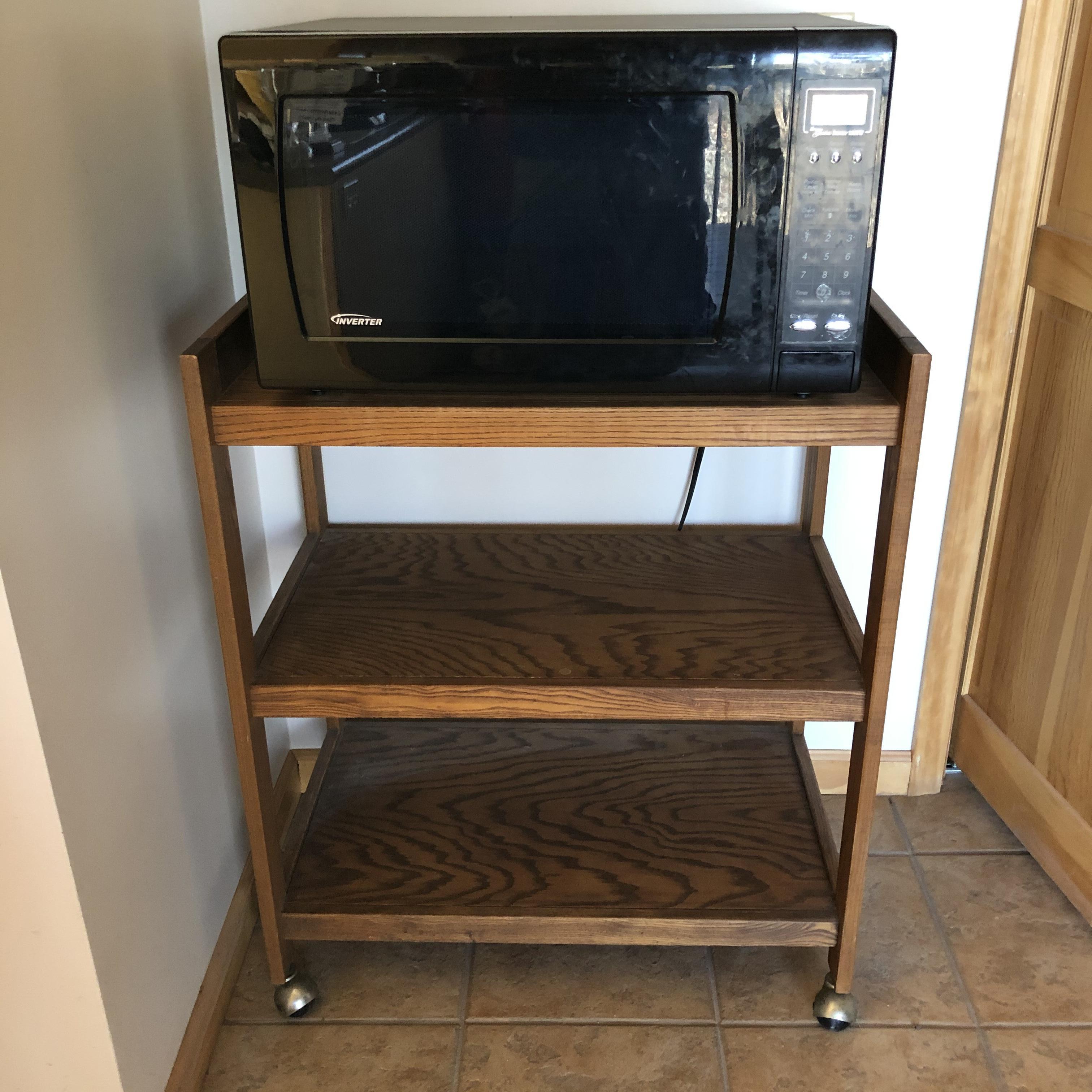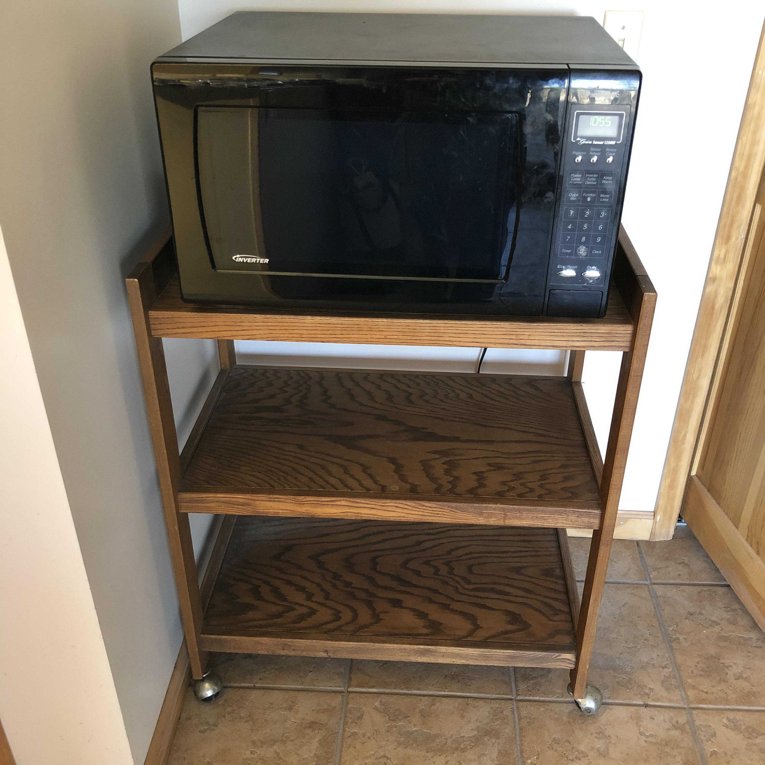 A great way to get the microwave off the countertop and add storage space in your kitchen. Lot includes Panasonic Microwave model#NN-H965BFX ABH and a three shelved wooden rolling cart. Cart measures 18.75” x 29.5” x 35.5”. Microwave worked when tested. Start button is worn but works fine. This is a large and high powered Microwave.