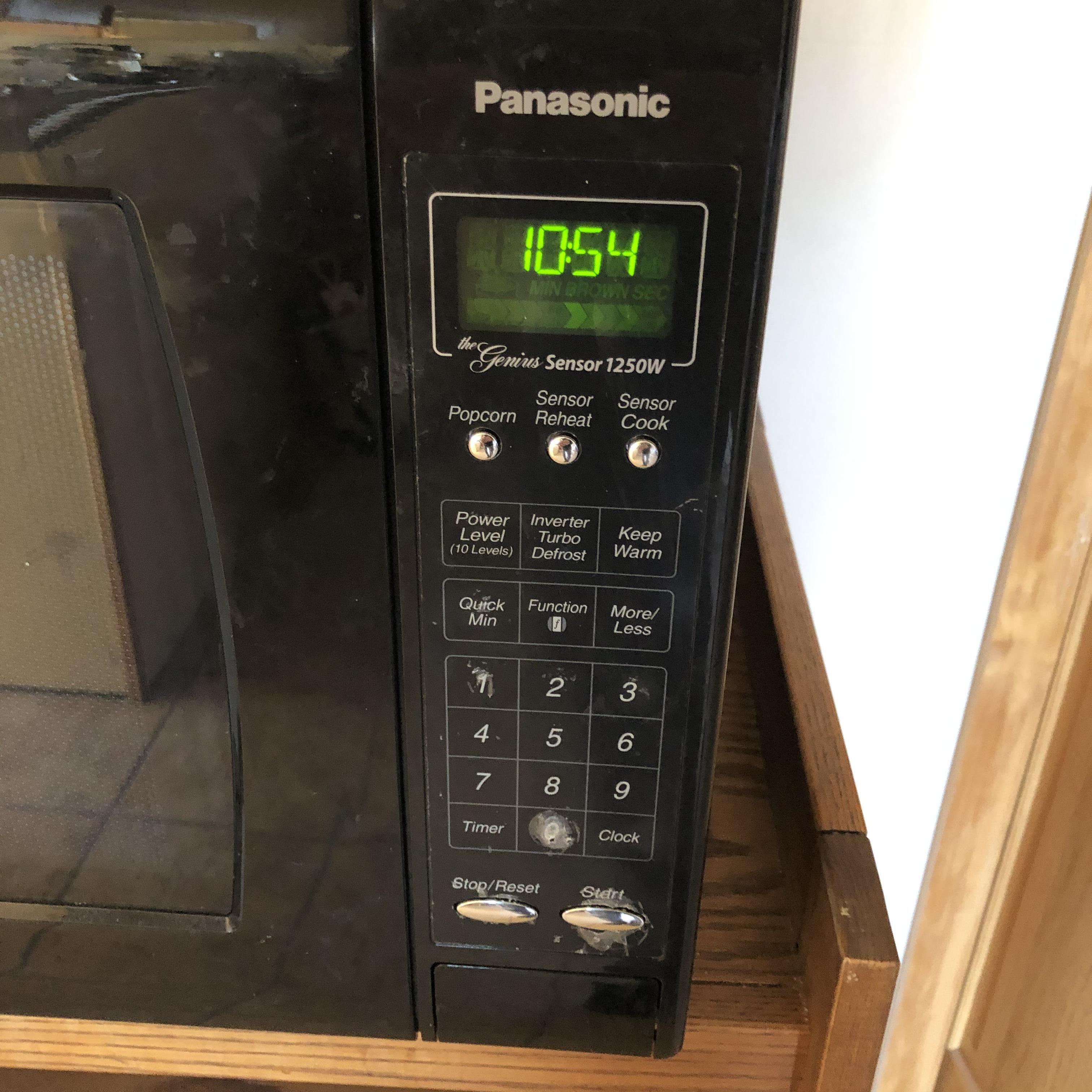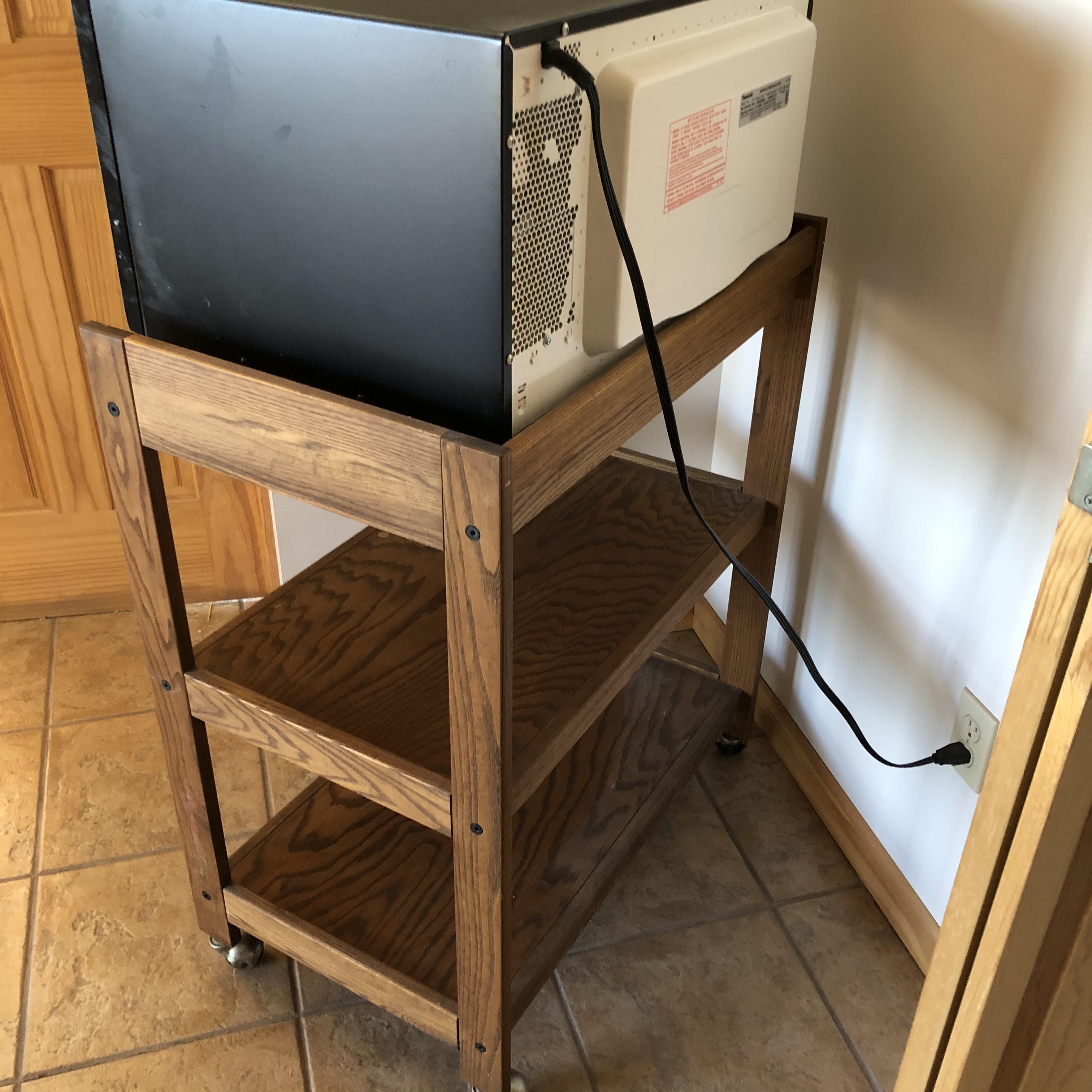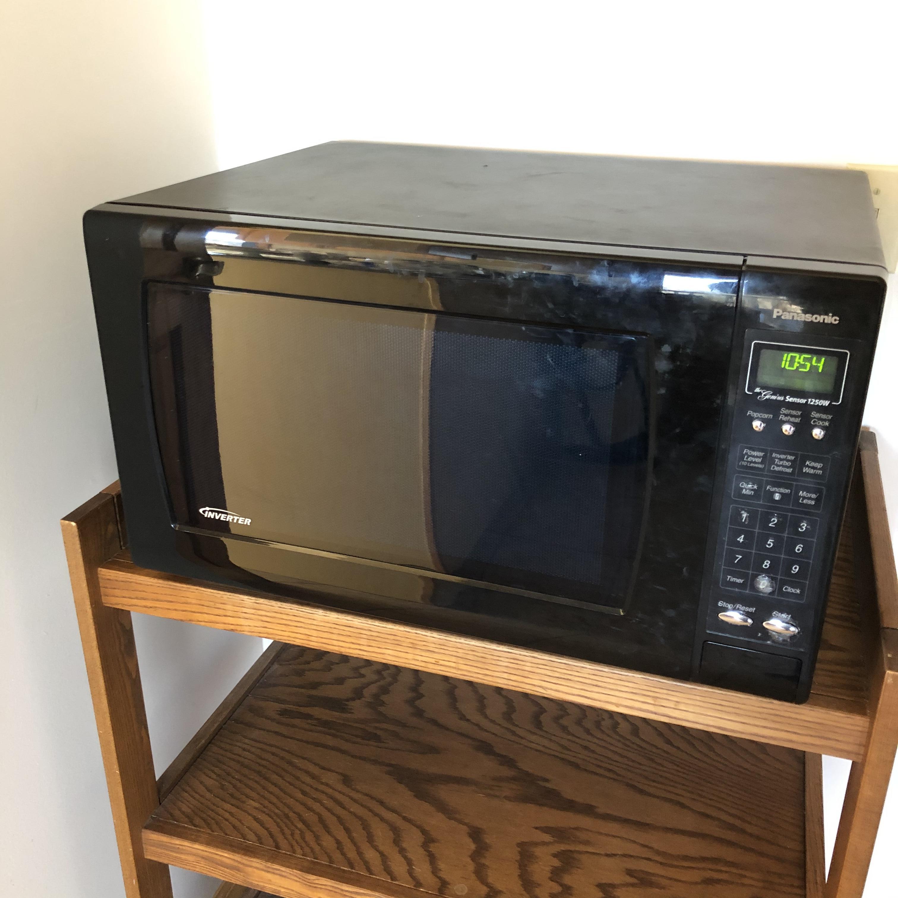 A great way to get the microwave off the countertop and add storage space in your kitchen. Lot includes Panasonic Microwave model#NN-H965BFX ABH and a three shelved wooden rolling cart. Cart measures 18.75” x 29.5” x 35.5”. Microwave worked when tested. Start button is worn but works fine. This is a large and high powered Microwave.